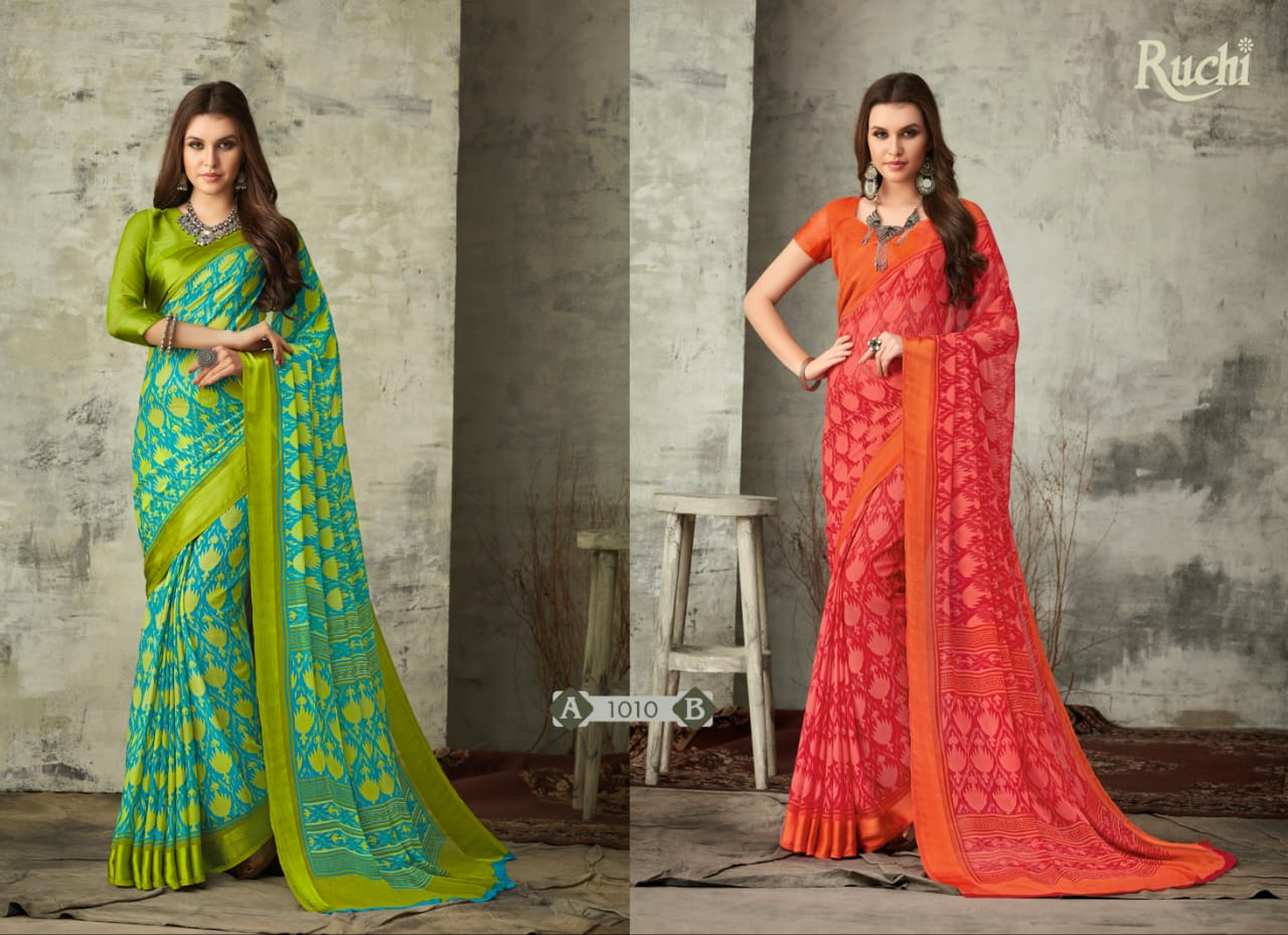 Buy Online Cocoberry Vol 10 By Ruchi Sarees Chiffon Printed Satin Patta Sarees Wholesale Supplier Gujarat 20 Pcs of Full Catalogue at Wholesale Price. Looking for Cocoberry Vol 10 By Ruchi Sarees Chiffon Printed Satin Patta Sarees Wholesale Supplier Gujarat Full Catalouge at Best Price? Buy Now Cocoberry Vol 10 By Ruchi Sarees Chiffon Printed Satin Patta Sarees Wholesale Supplier Gujarat at Wholesale Rate of Rs 8300 with Total 20 Pcs from authroized dealer and supplier of RUCHI SAREE Brand. Cost of Each piece is just only Rs 415 which is very low and affordable price to resale the product in your retail store ,This is Surat based Wholesale Supplier & Dealer of RUCHI SAREE Brand. Click on Brand name to Know more about RUCHI SAREE Brand's products.Call or Whatsapp on 9898838984 for booking or enquiry