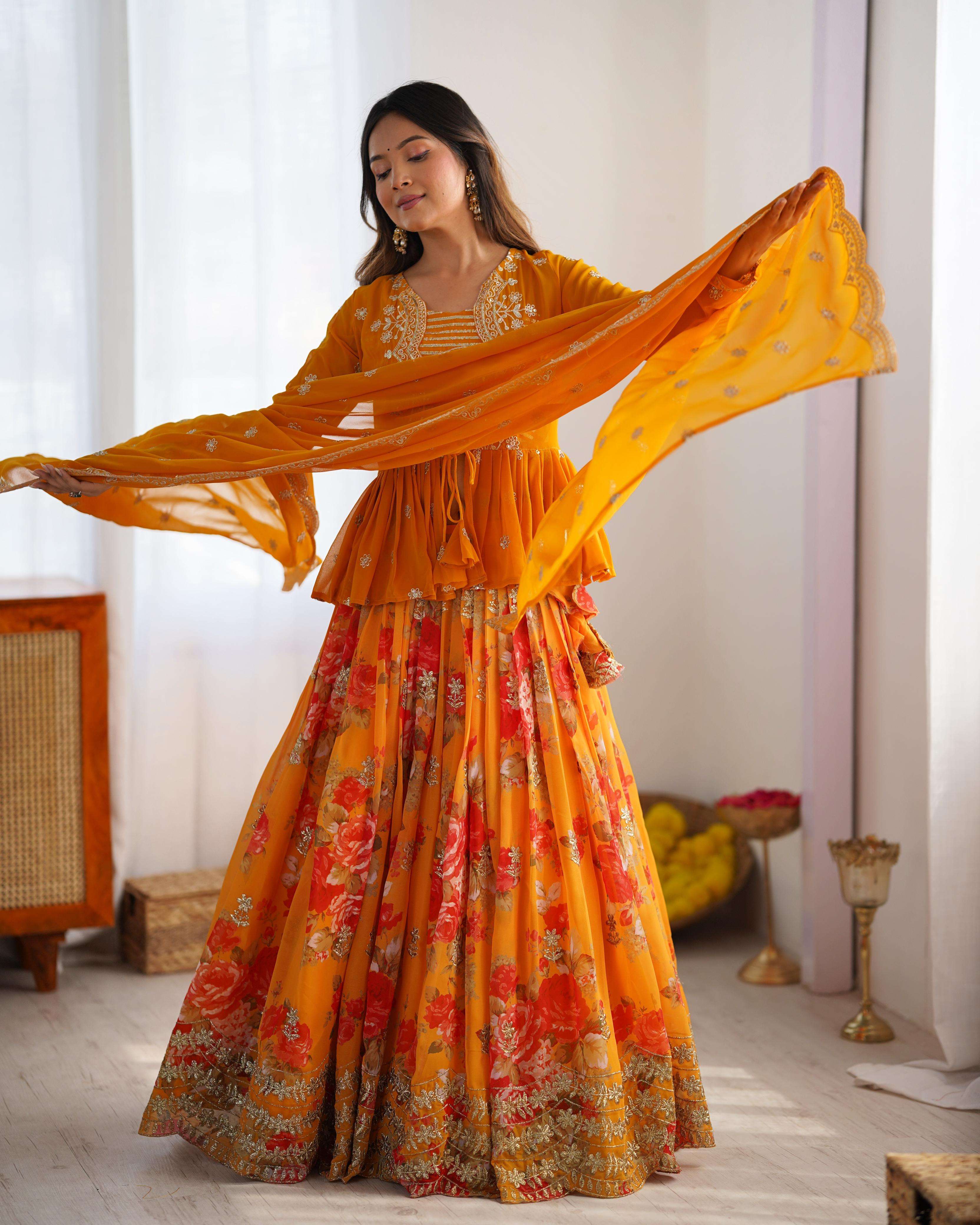 *Fabric*. : Foux Gorgette with Digital print *Work*. : Thread With Sequnce work *Size*. : Up to 44 *Inner*. : Micro *Lehengha Type*. : Semi-Stitch