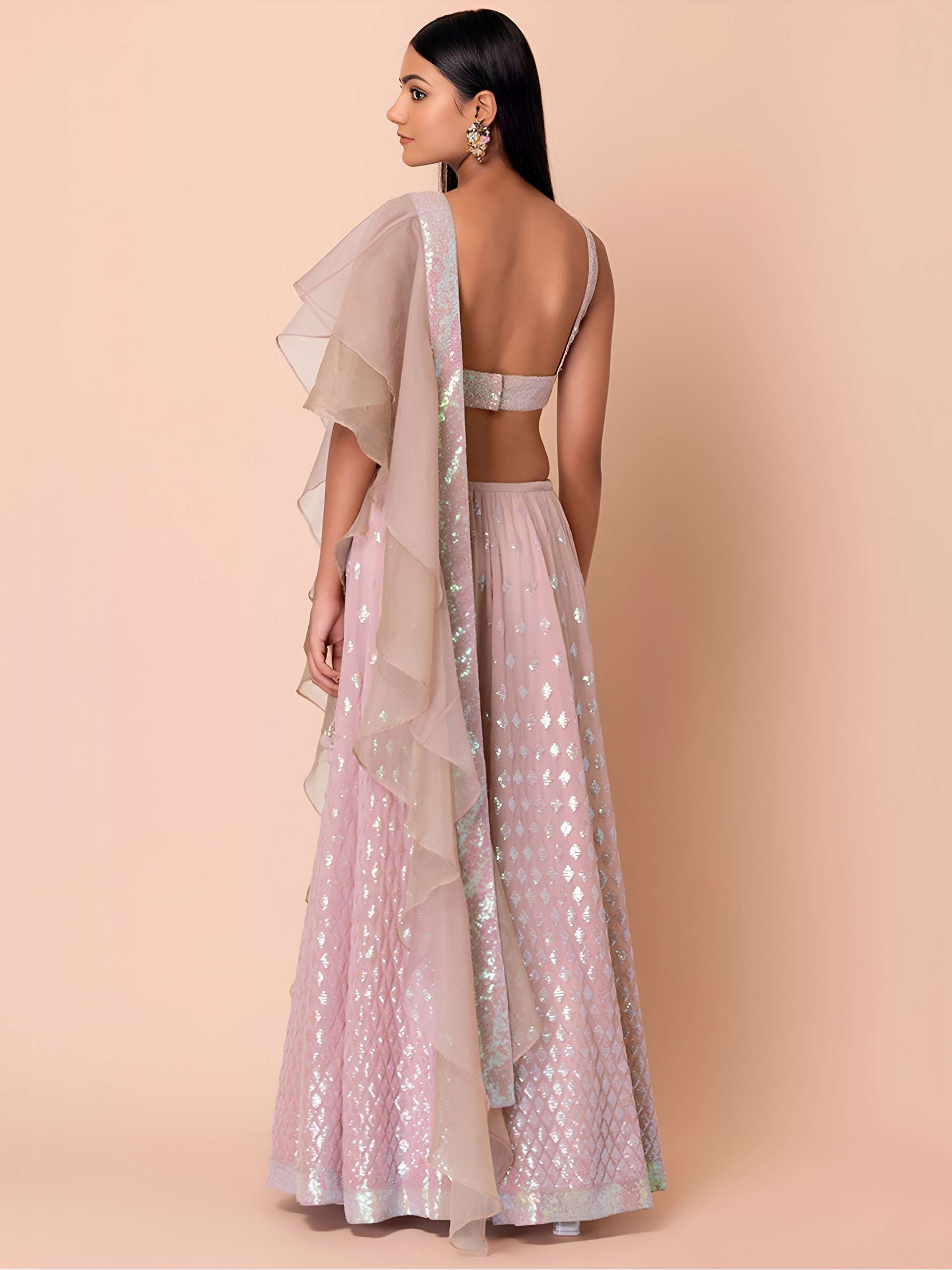 *🎉 Product Code: 15087-Pink 🎀* 🩷 A flowing pastel pink lehenga adorned with iridescent sequin and thread work geometric motifs all over. The fabric shines delicately, adding a dreamy charm with a graceful flare.