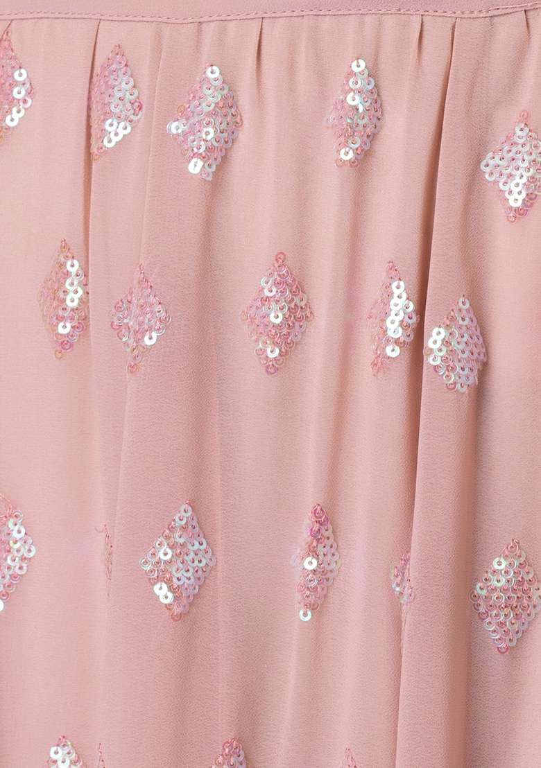 🩷 A soft, sheer organza dupatta in matching pastel pink with layered ruffled edges for a dramatic effect. It features a light shimmer sequin border that ties the whole look together elegantly.