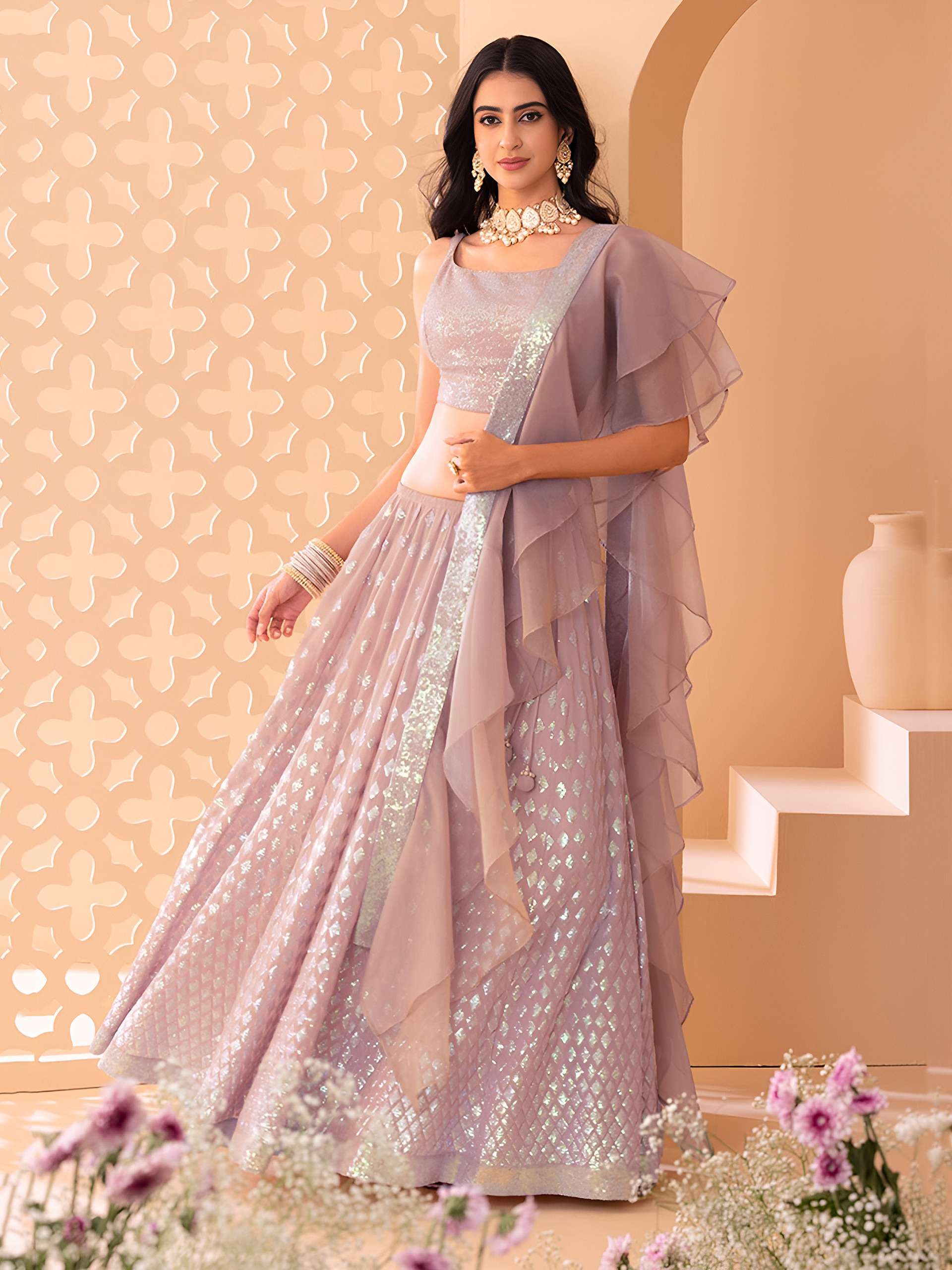 🩷 The blouse comes with round neckline, fully embellished with shimmering sequins in a subtle textured pattern. Its fitted silhouette complements the lehenga beautifully.