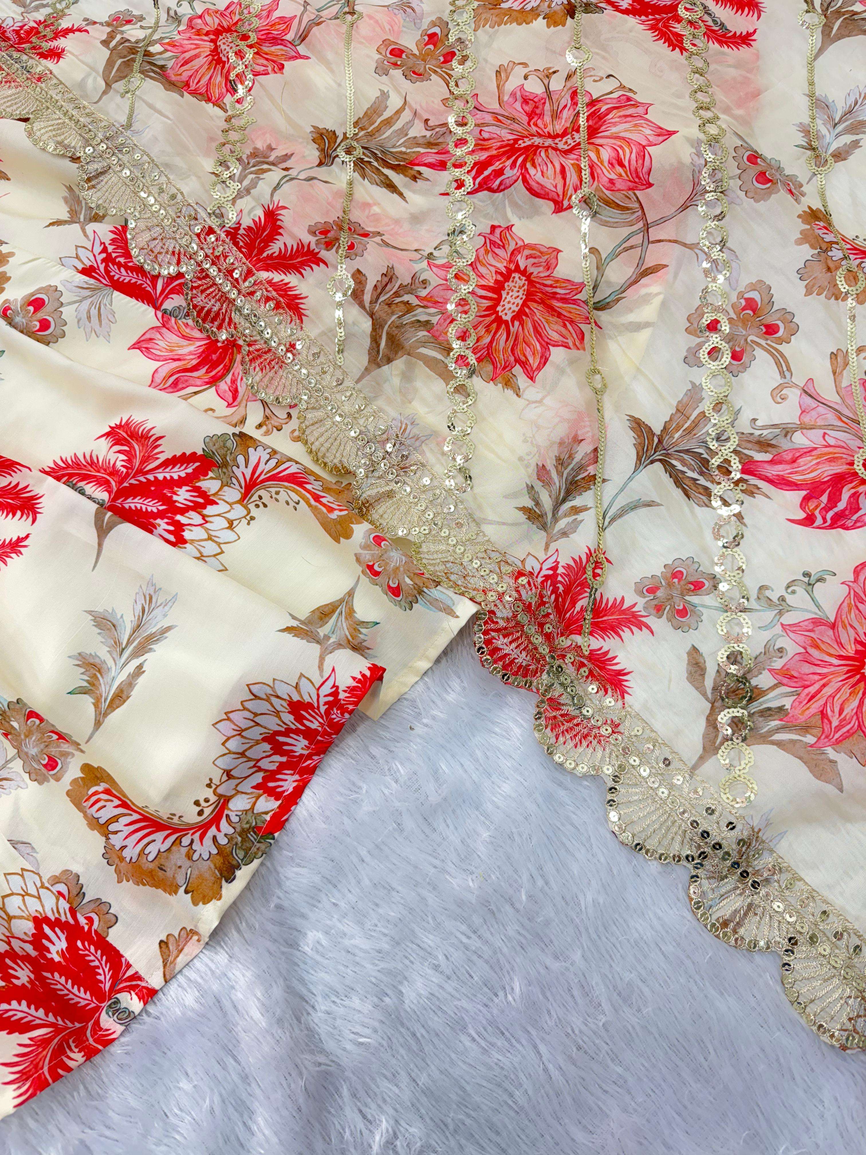 *DUPPTA*: 2.3 MTR PURE SOFT LIGHTWEIGHT ORGANZA FLORAL PRINT EMBROIDERY SEQUENCE WORK WITH BOADER LACE WORK
