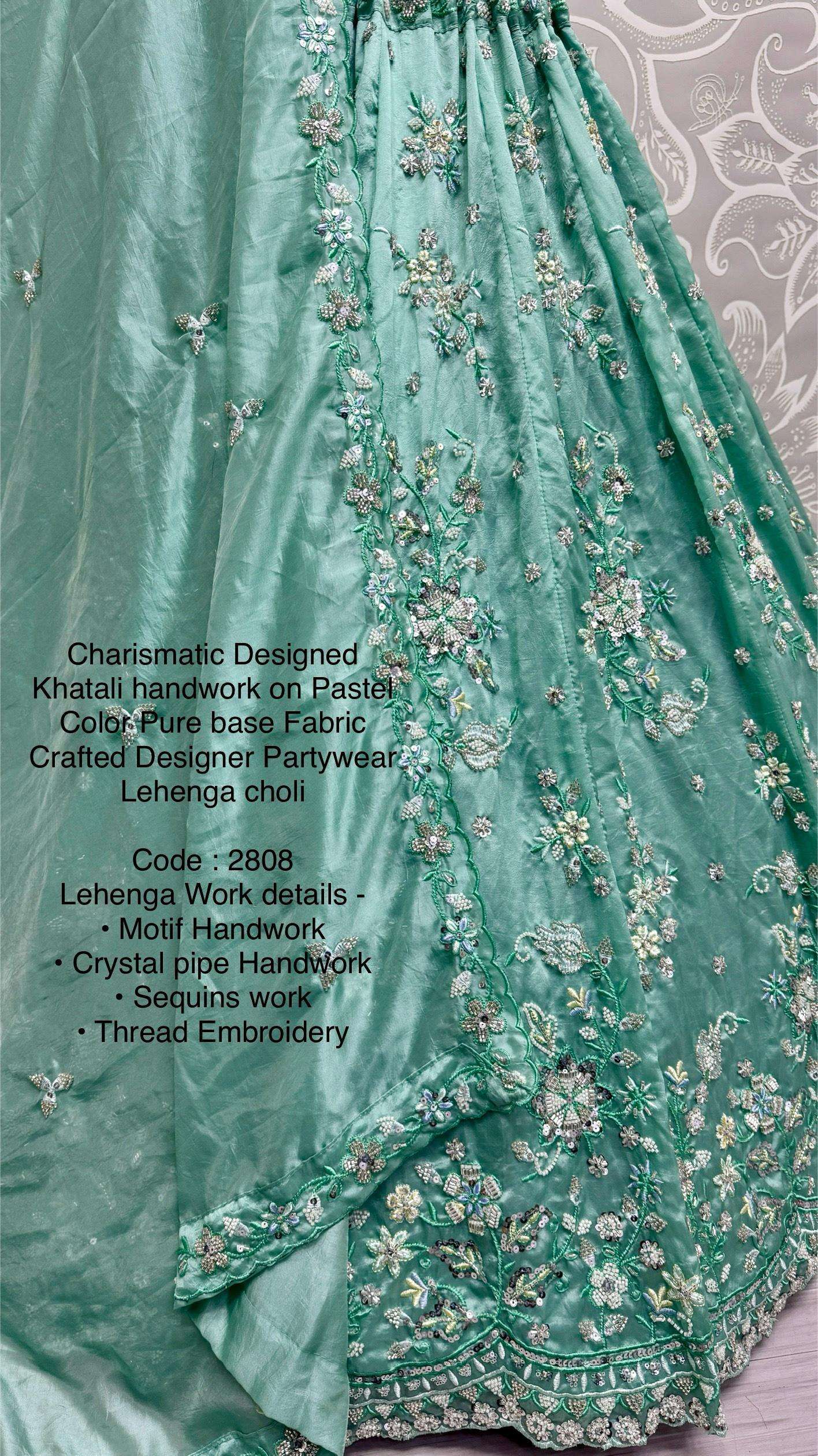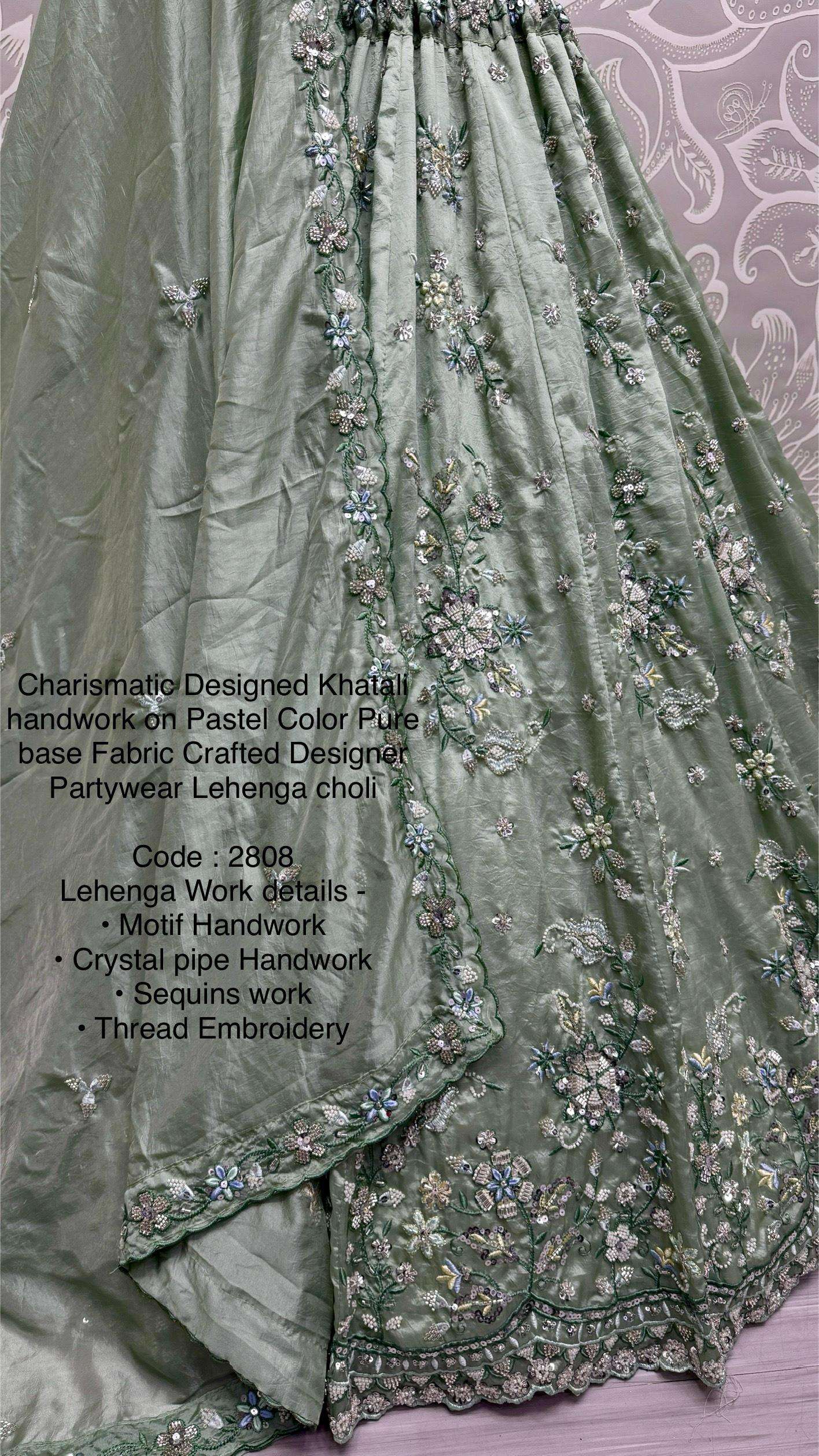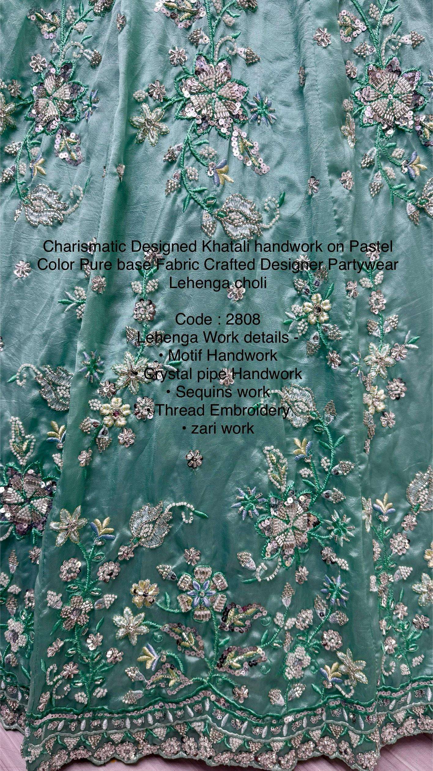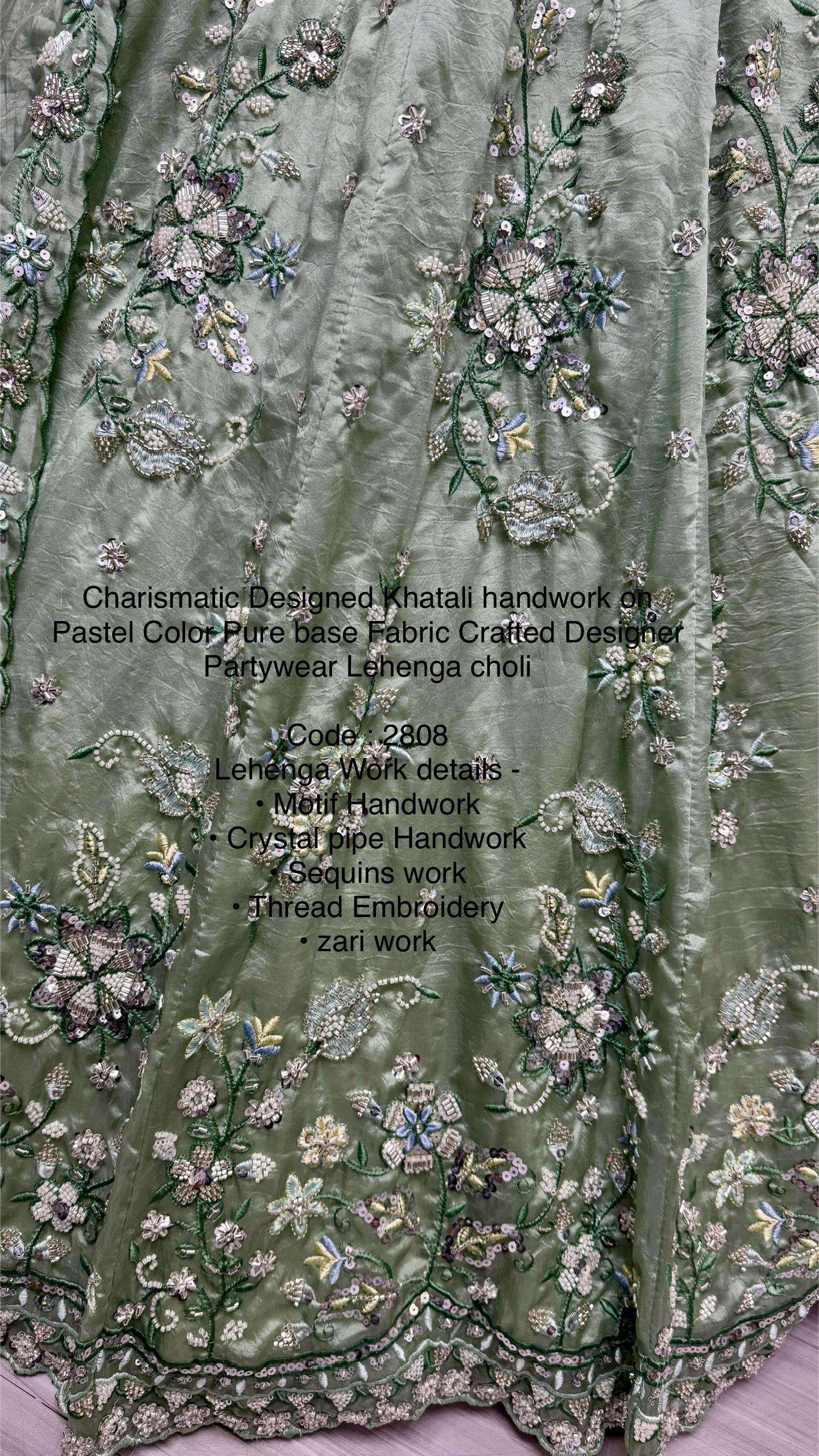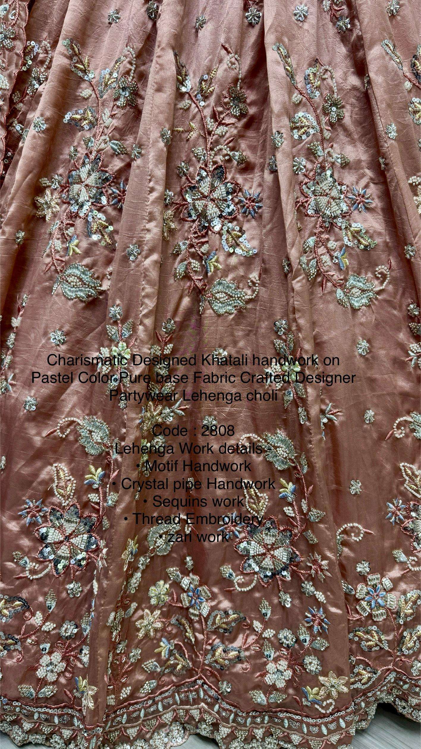 Code : 2808 Lehenga : Fabric - Gold Crush Pure Work - • Motif Handwork • Crystal pipe Handwork • Sequins work • Thread Embroidery • zari work Stitching - standard cancan and canvas attached free size lehenga Size - free size up to 42
