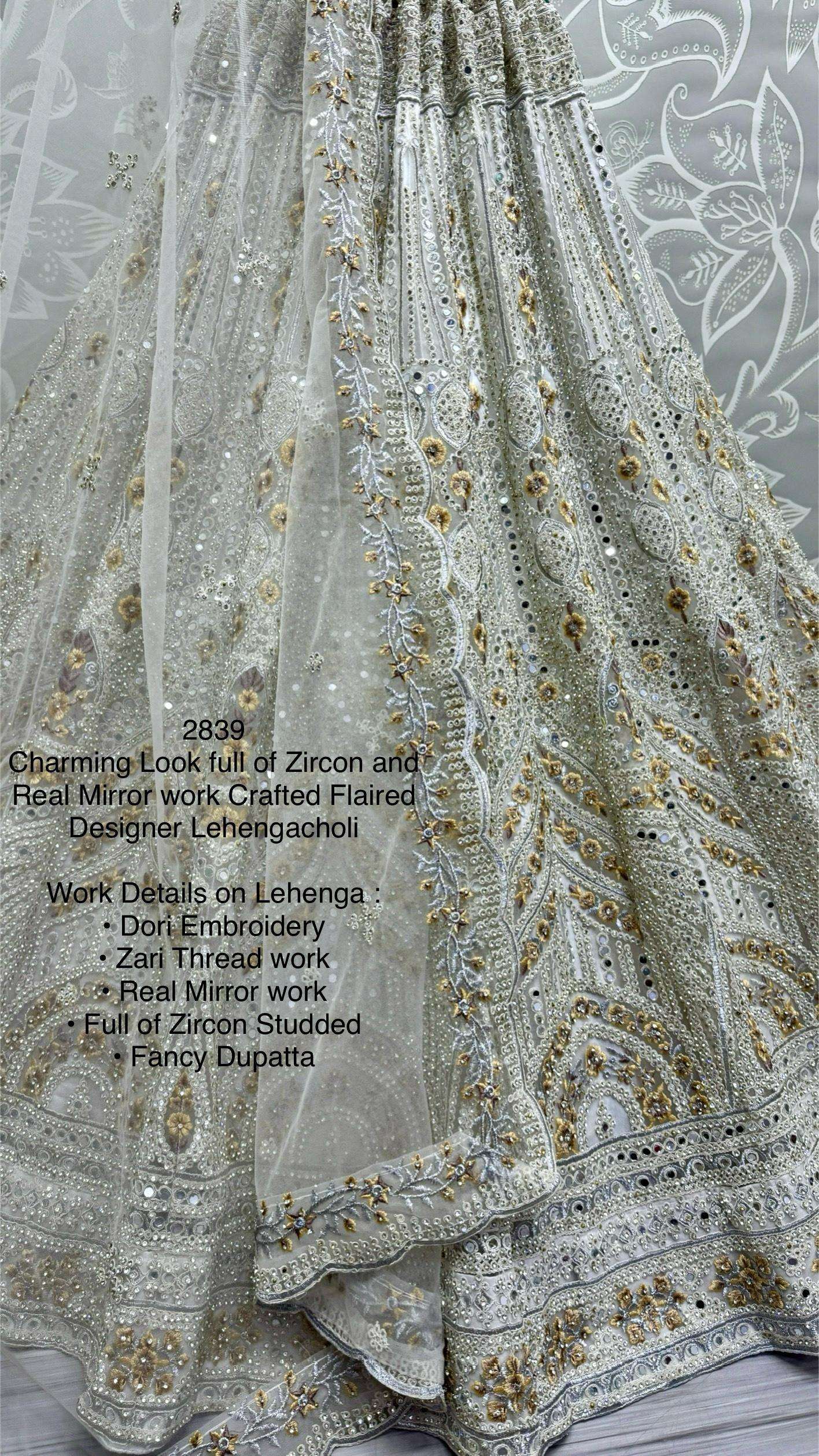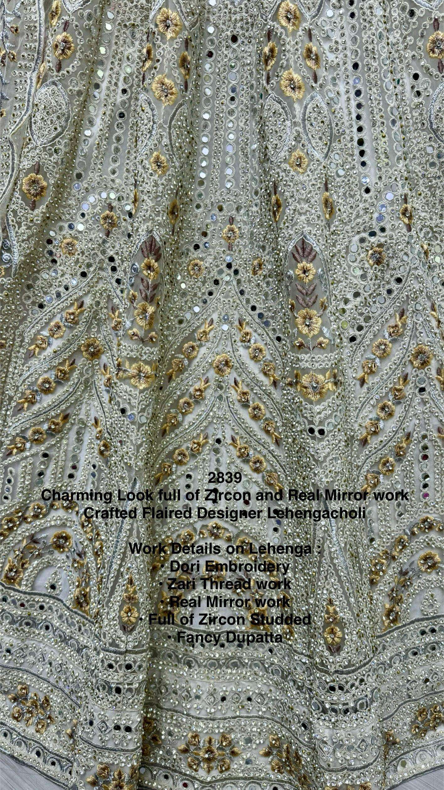 Code : 2839 Lehenga : Fabric - Heavy Net Work - • Dori Embroidery • Zari Thread work • Real Mirror work • Full of Zircon Studded • Fancy Dupatta Stitching - standard cancan and canvas attached free size lehenga Size - free size up to 42 Flair - Four Meter Plus
