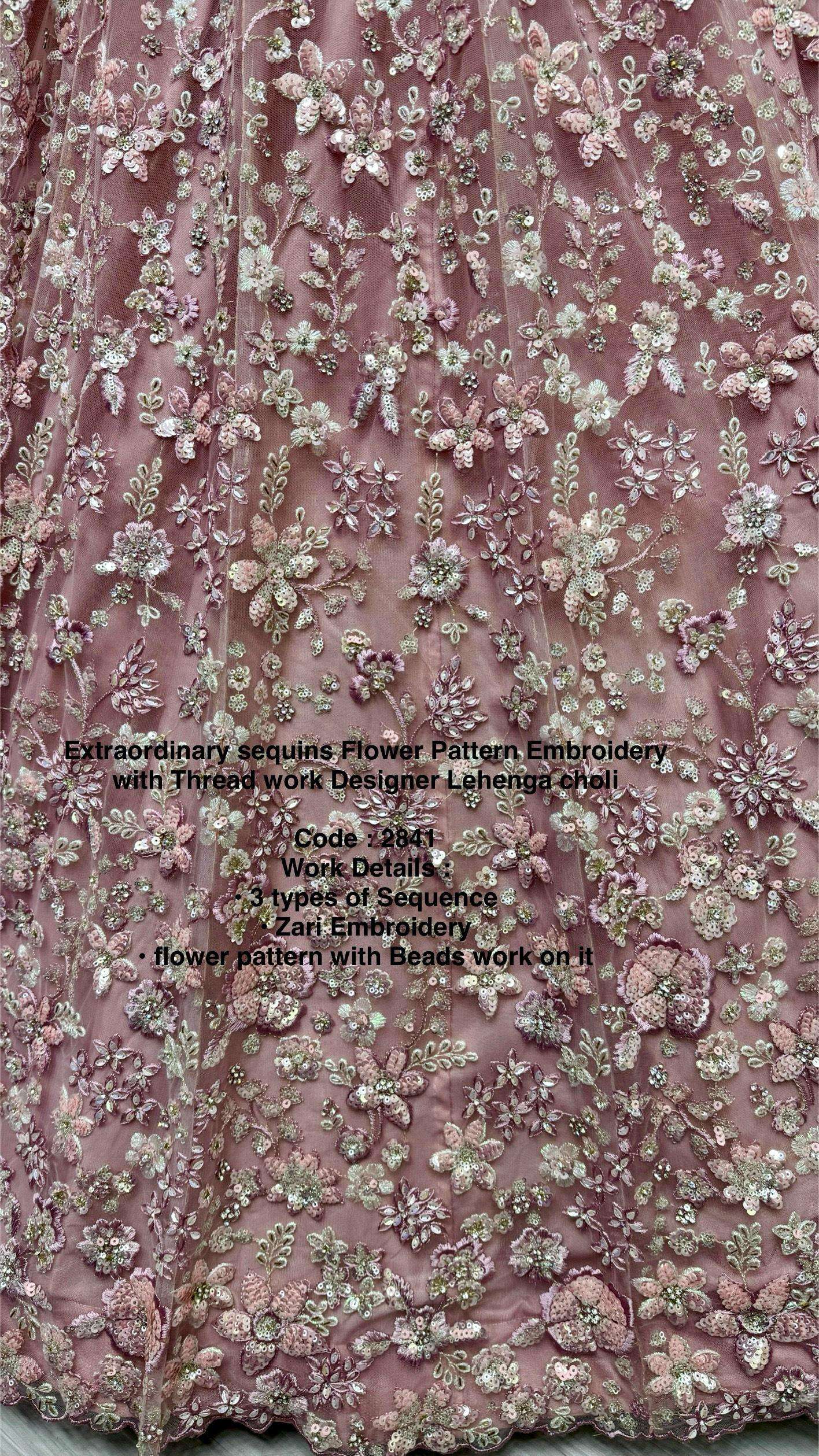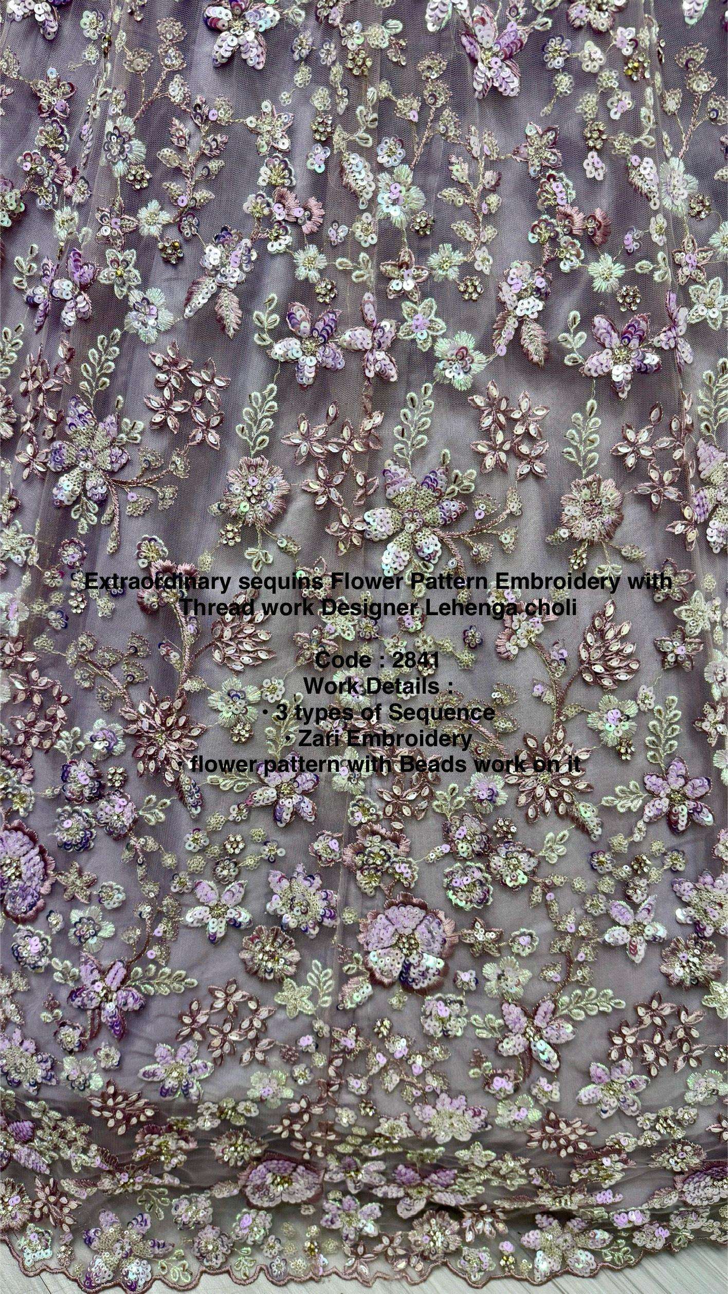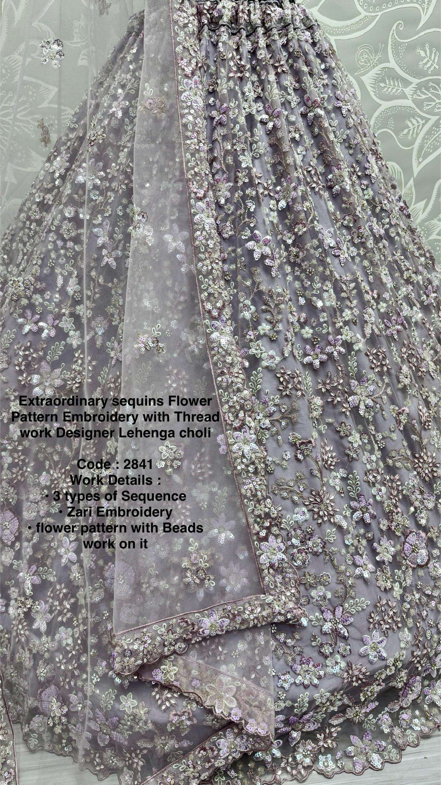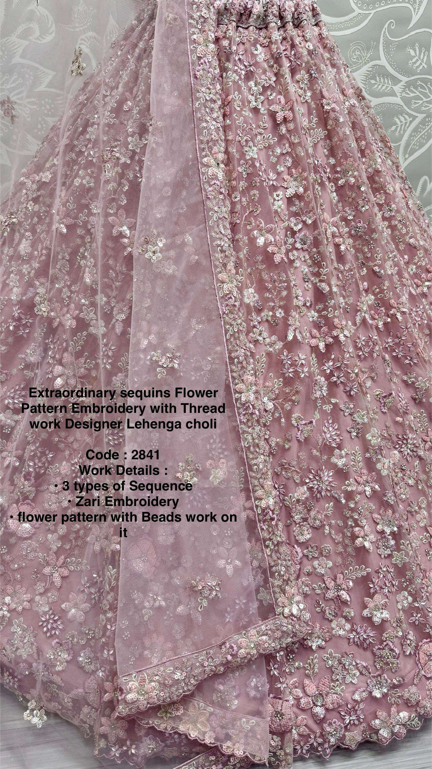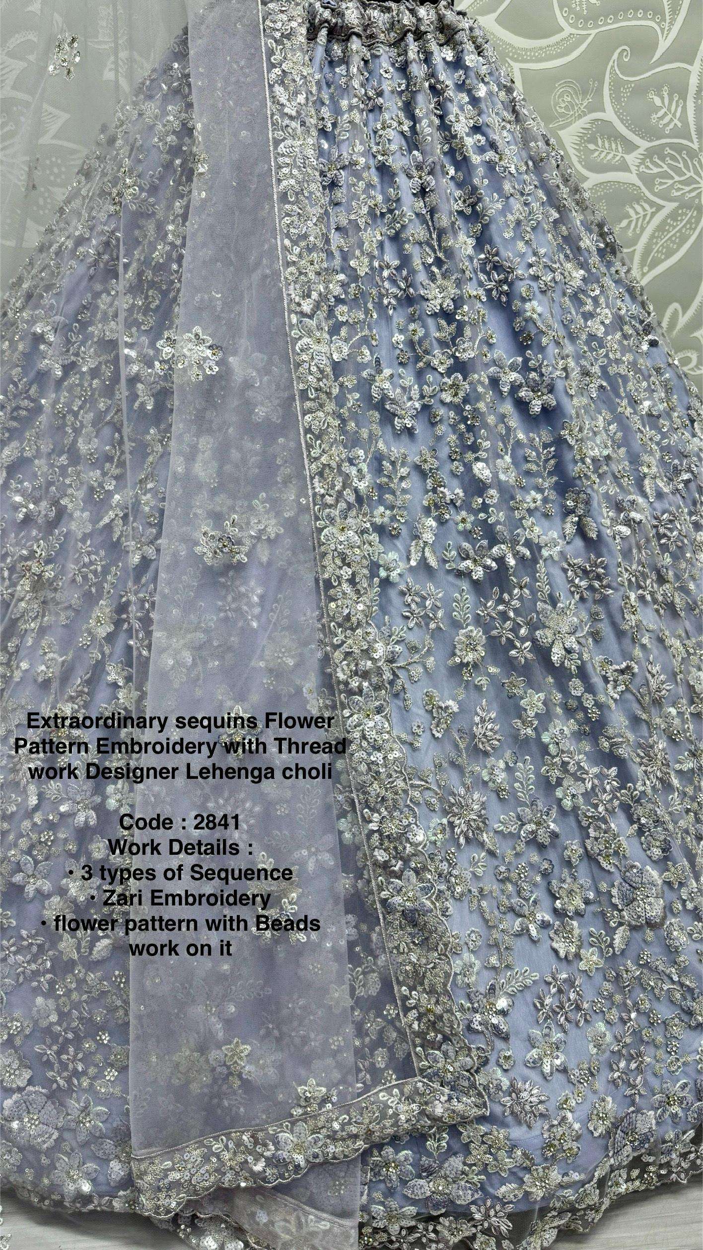 Code : 2841 Lehenga : Fabric - Heavy Net Crafted Work - • 3 types of Sequence • Zari Embroidery • flower pattern with Beads work on it • Fancy Embroidery work • zircon diamond studded Stitching - standard cancan and canvas attached free size lehenga Size - free size up to 42