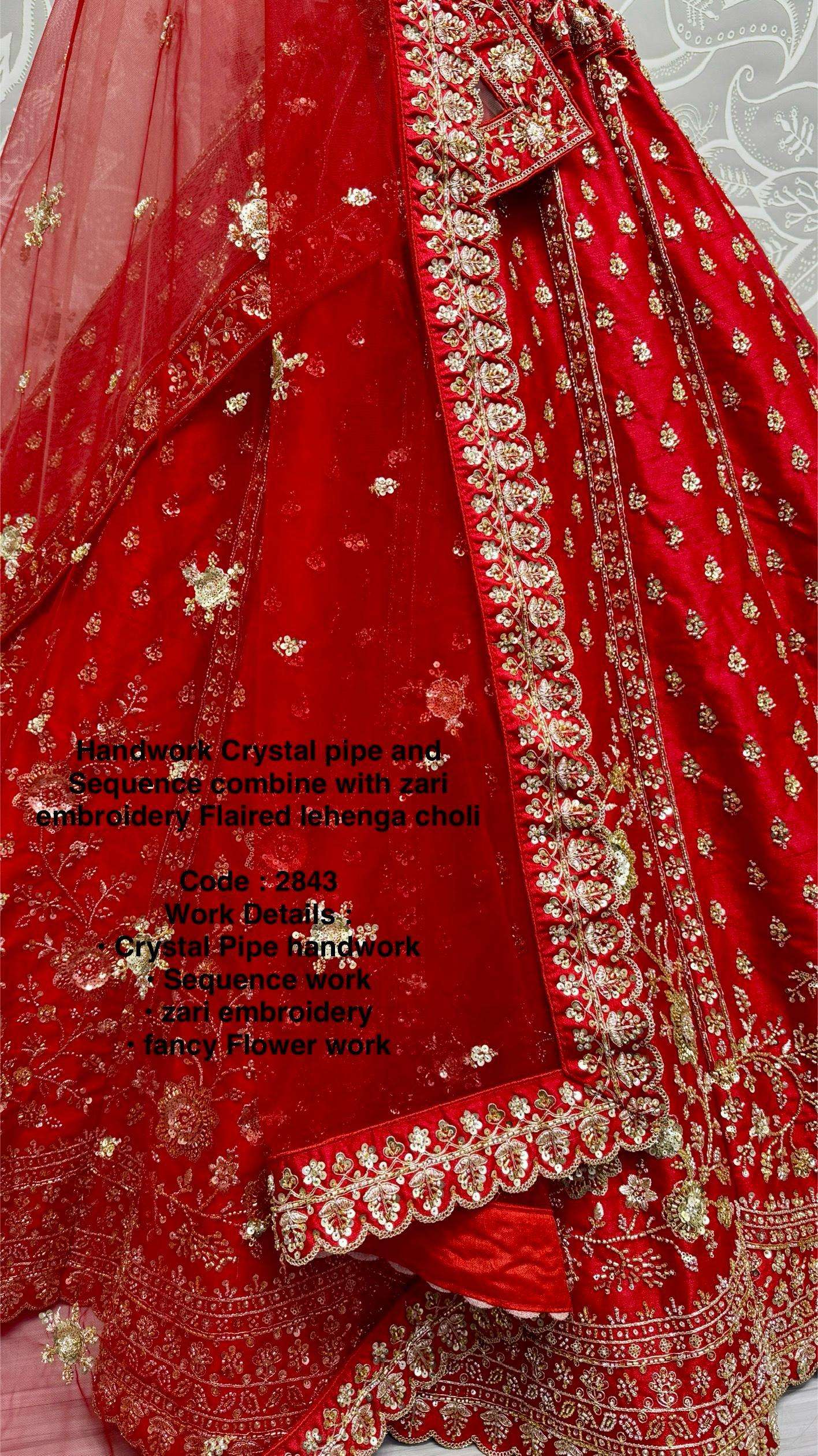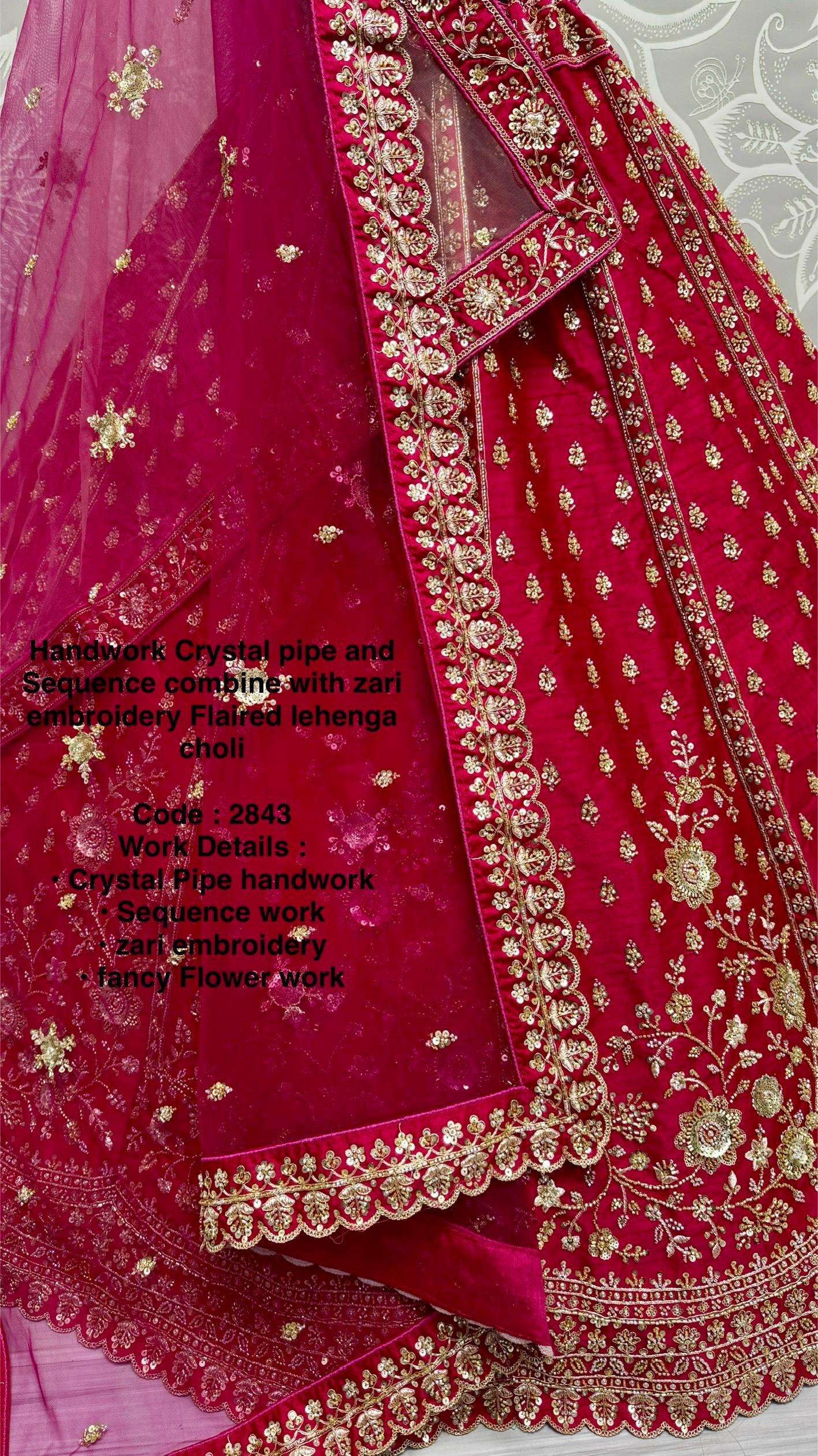 Code 2843 Lehenga : Fabric - Silk Work - • Crystal Pipe handwork • Sequence work • Zari embroidery • Fancy Flower work Stitching - standard cancan and canvas attached free size lehenga Size - free size up to 42