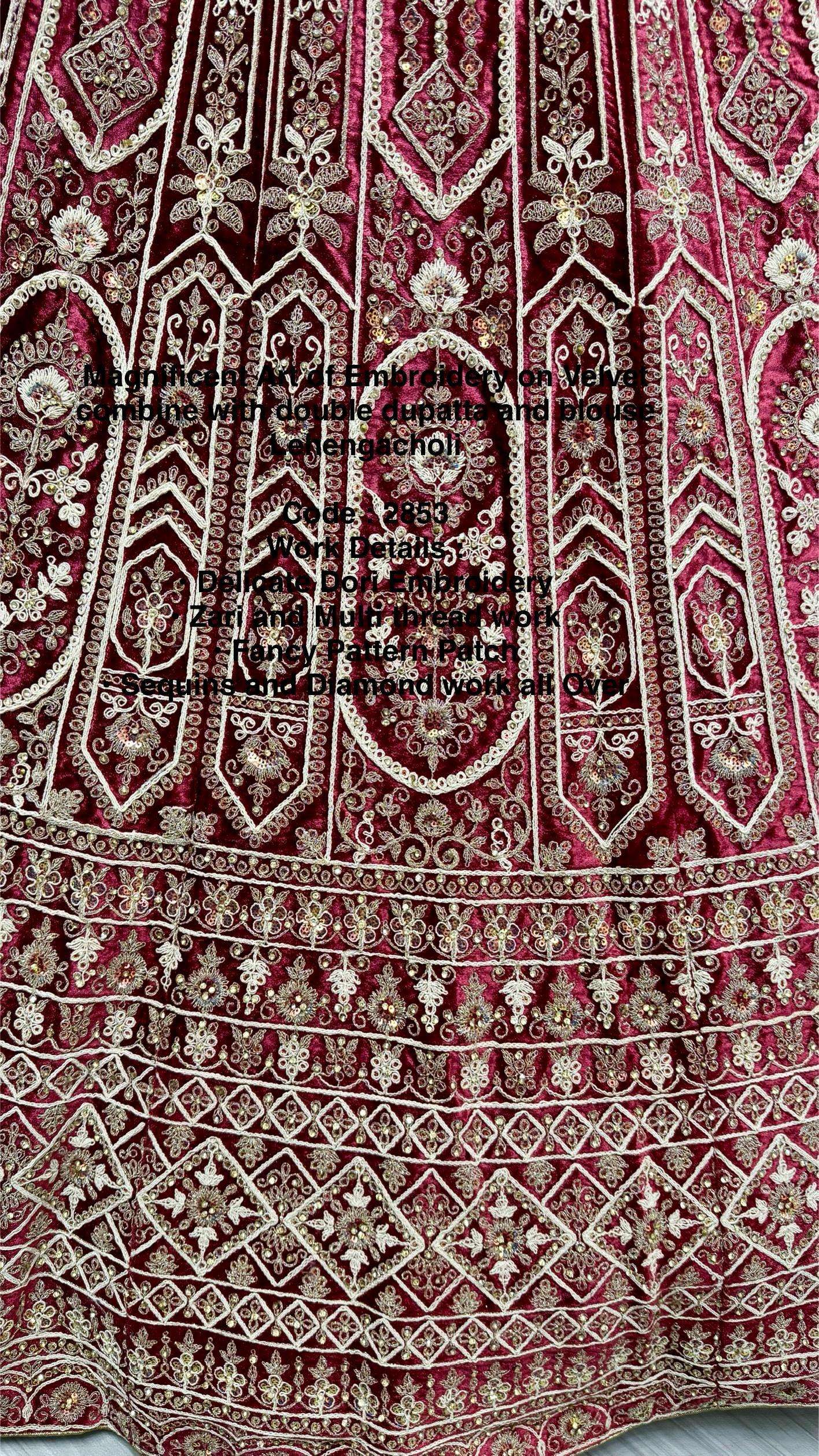Magnificent Art of Embroidery on Velvet combine with double dupatta and blouse Lehengacholi