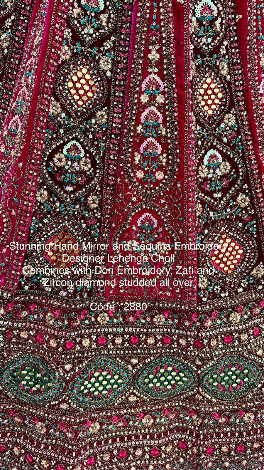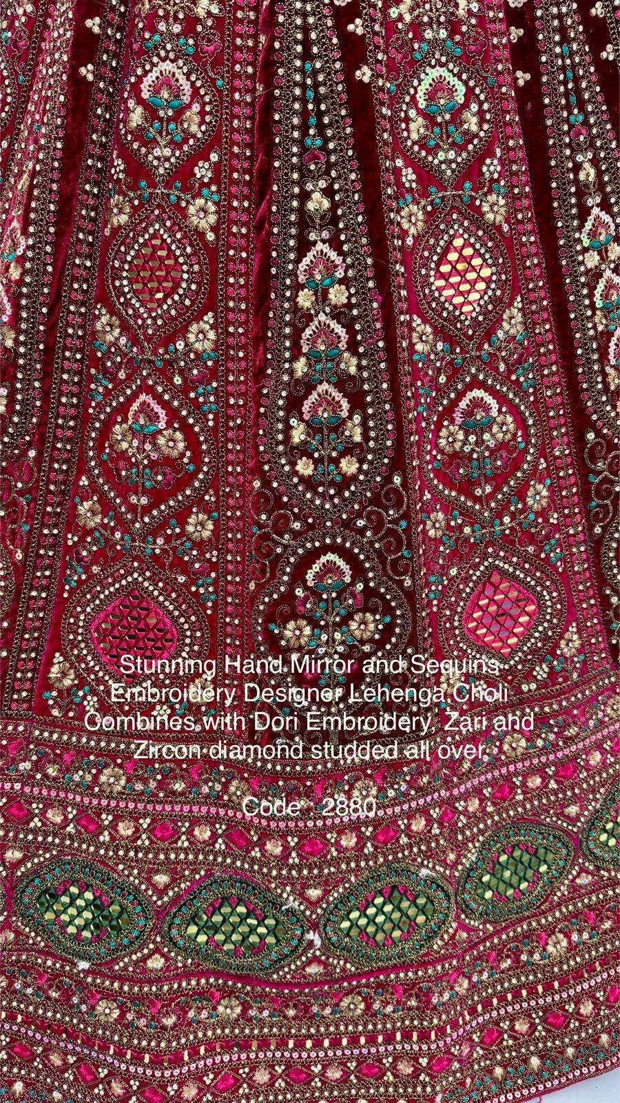 Code : 2880 Lehenga : Fabric - Velvet Work - Hand Mirror Crafted with Zari and thread work for shining sequins and Zircon studded all over Stitching - Standard cancan and canvas attached free size up to 42