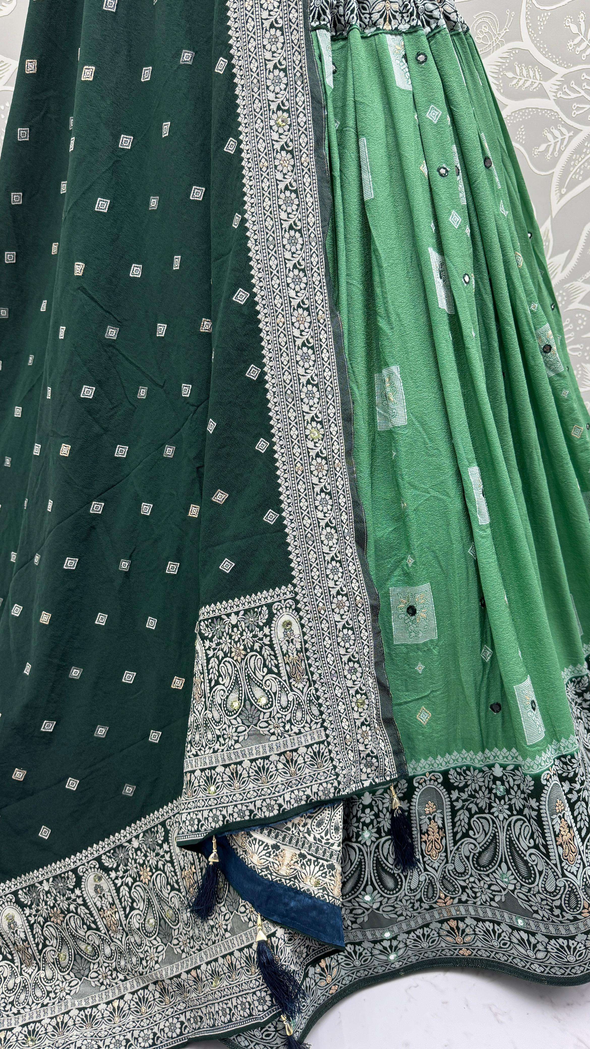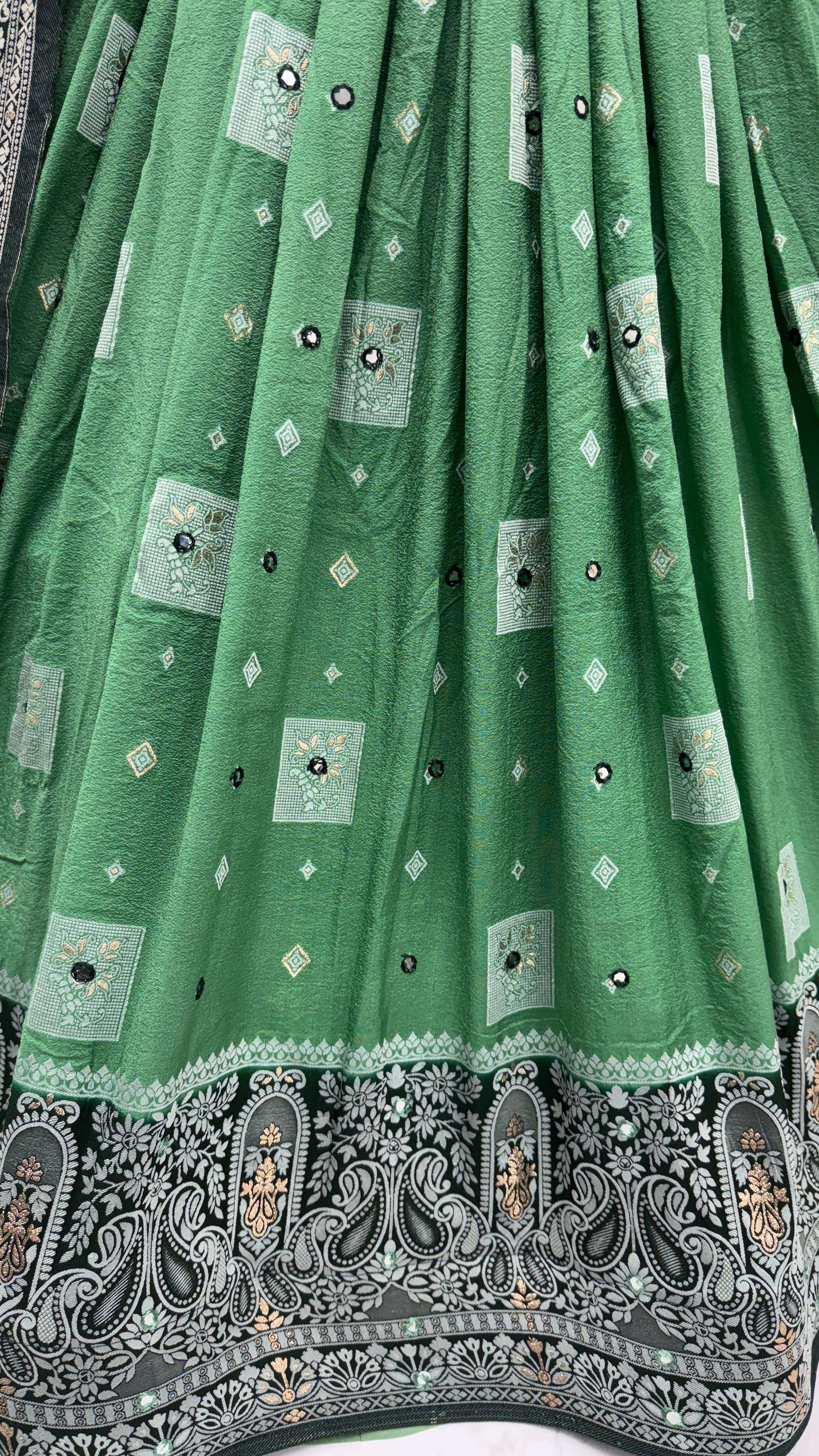 Code : 2884 Lehenga : Fabric - Georgette Work - sober mirror work Stitching - Standard cancan and canvas attached free size up to 42 Flair - Three meter