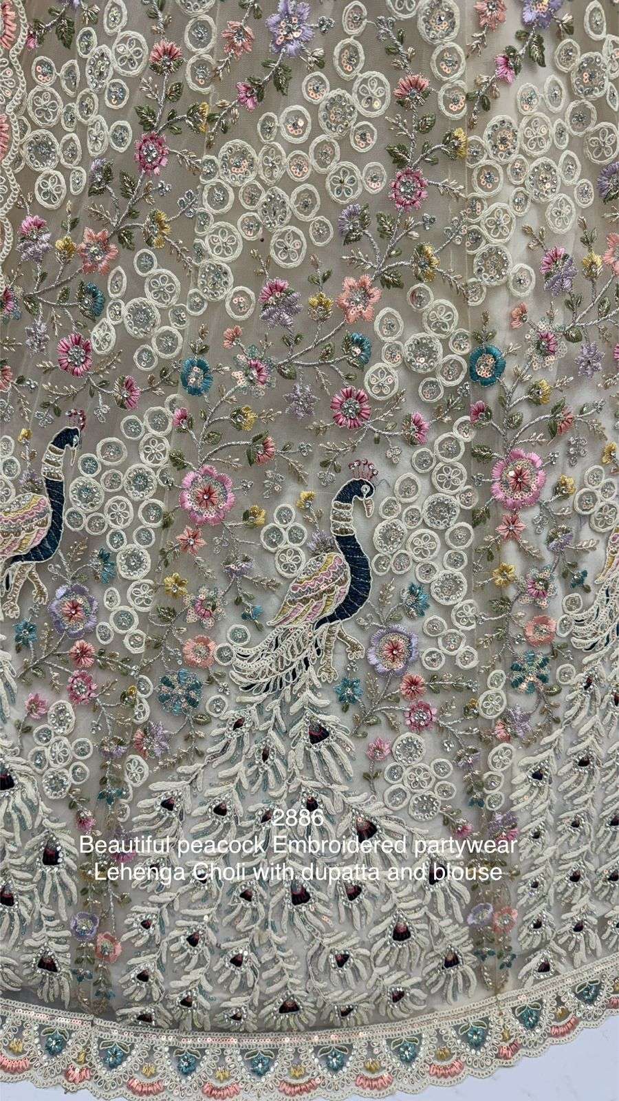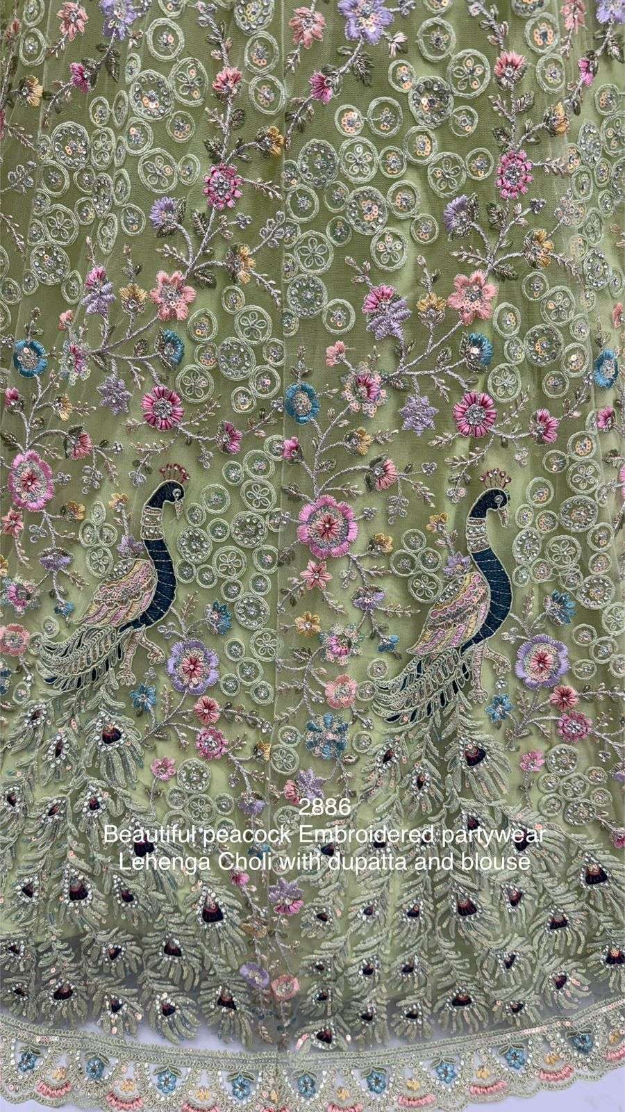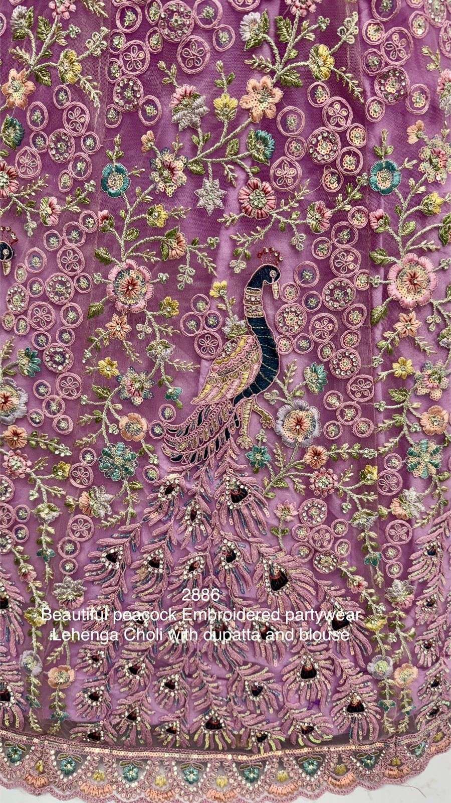 Code : 2886 Lehenga : Fabric - Net Work - Peacock pattern Crafted in Dori and Thread work with lots of Zircon diamond studded all over Stitching - Free size standard cancan and canvas attached possible up to 42 waist size
