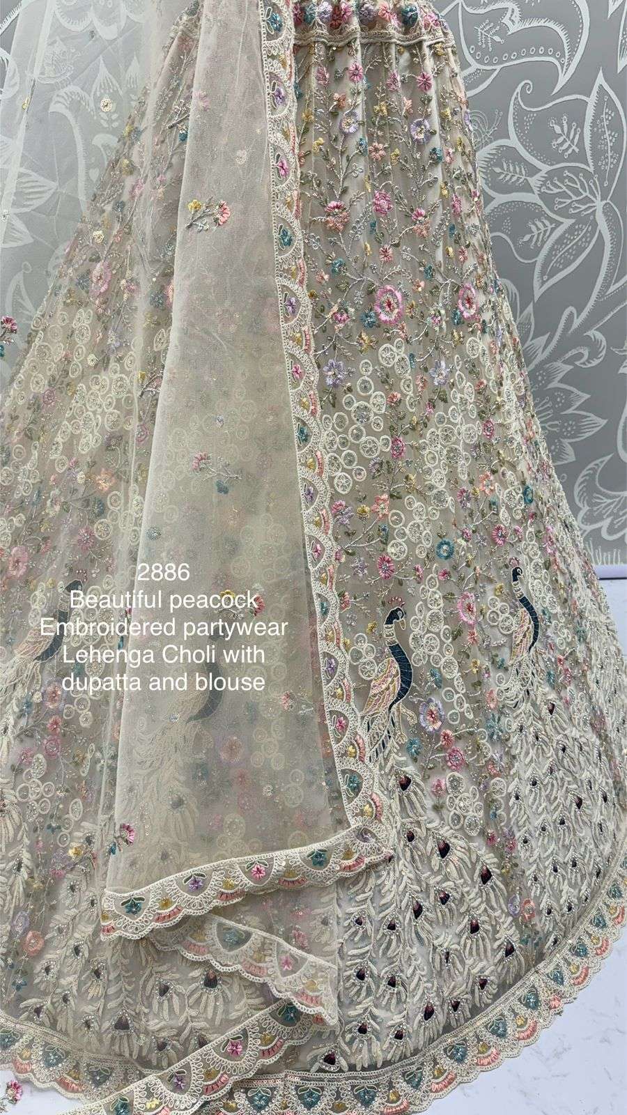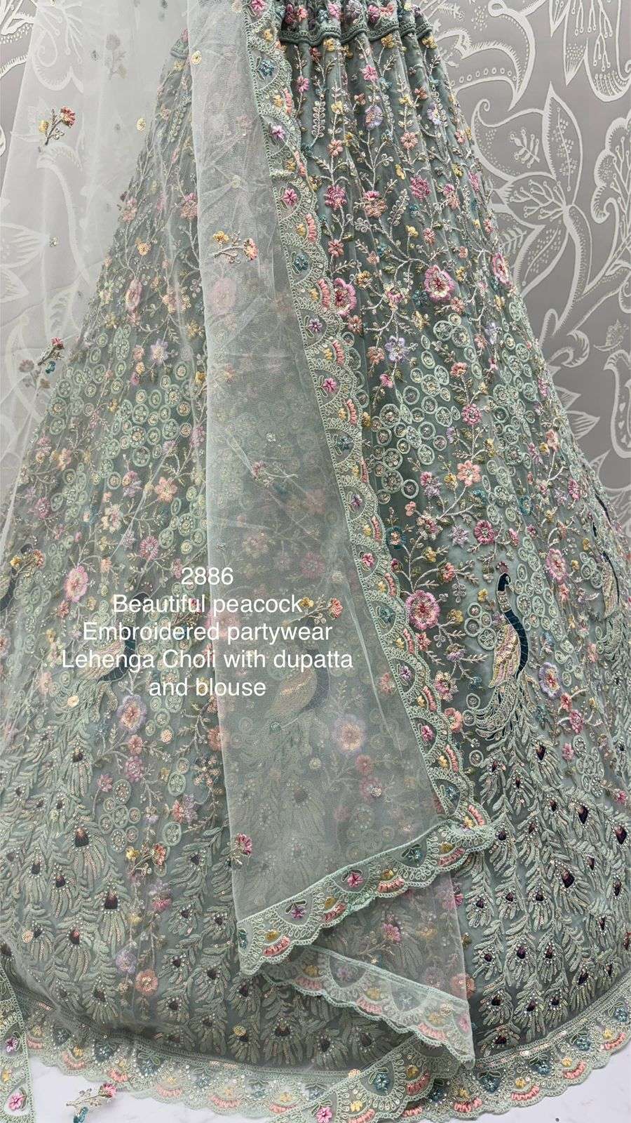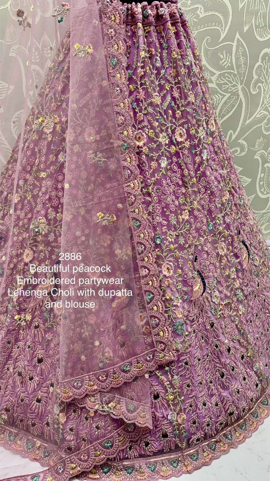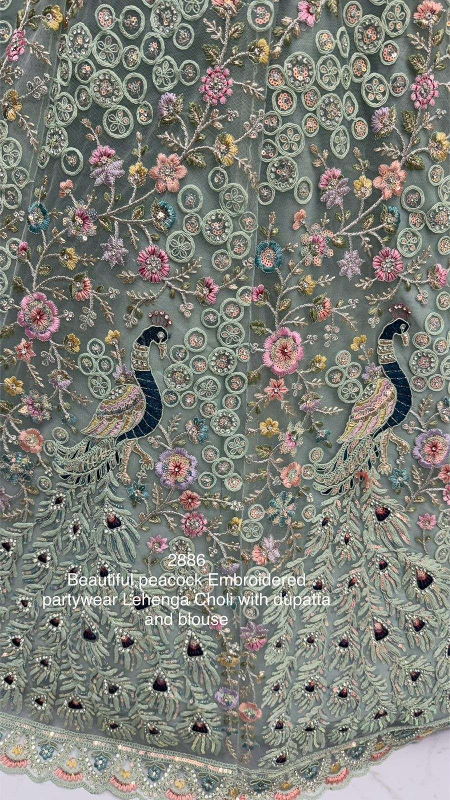 Code : 2886 Lehenga : Fabric - Net Work - Peacock pattern Crafted in Dori and Thread work with lots of Zircon diamond studded all over Stitching - Free size standard cancan and canvas attached possible up to 42 waist size