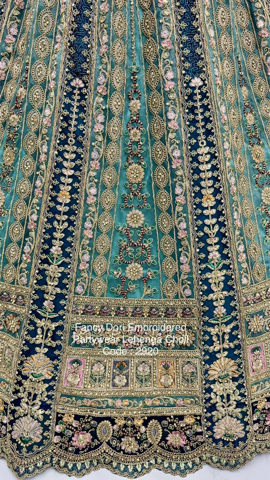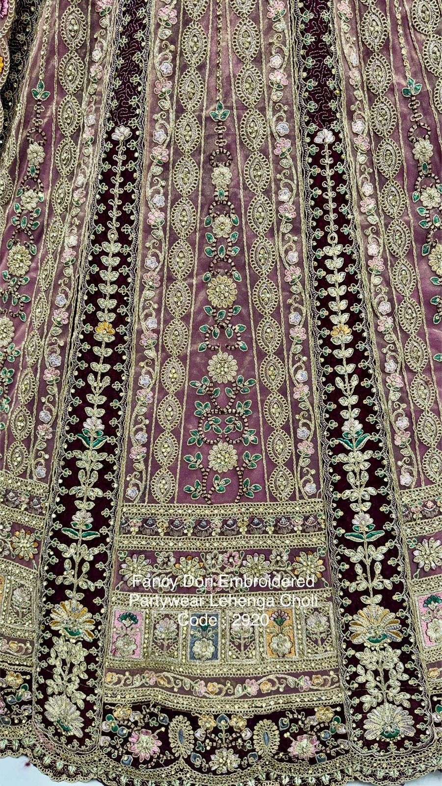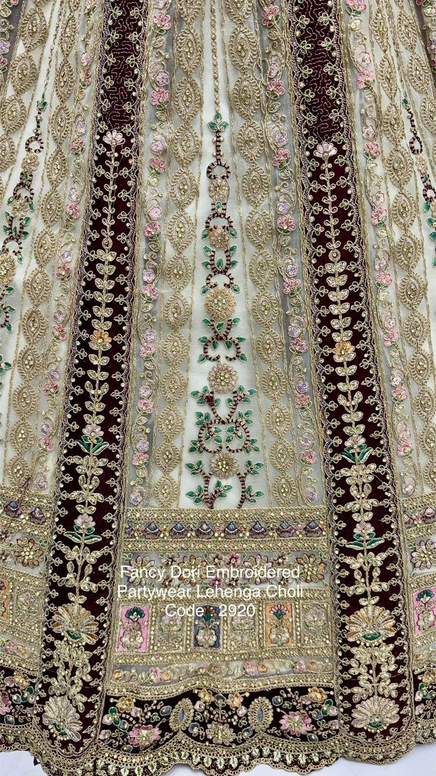 Code : 2920 Lehenga : Fabric - Net Work - Dori Work Multi thread Zari and sequins work Diamond work Stitching - Standard cancan and canvas attached free size up to 42