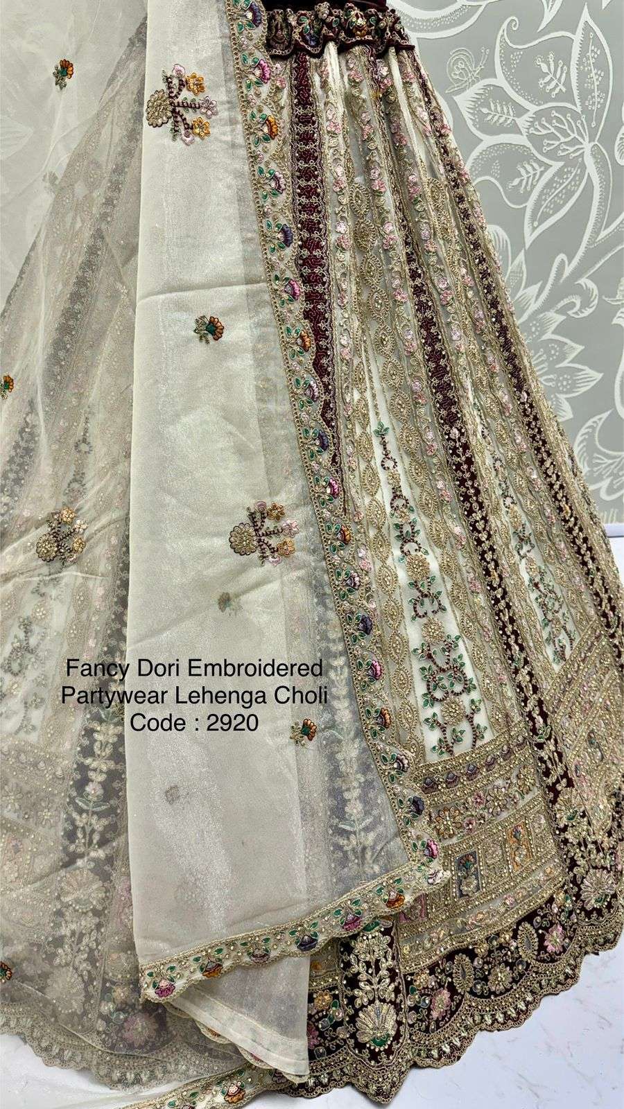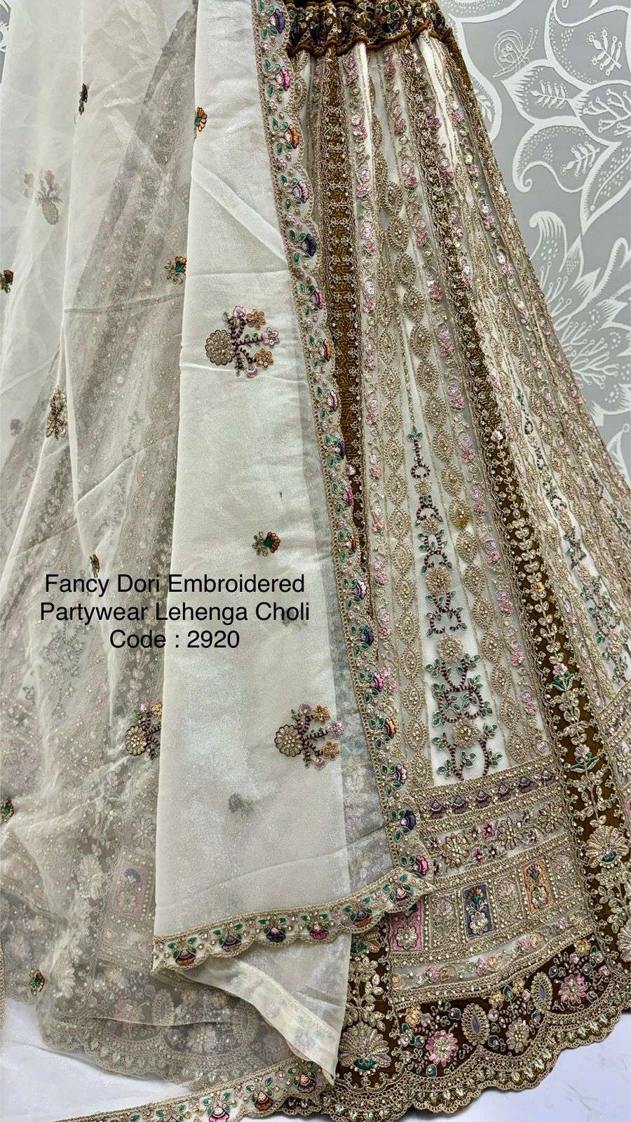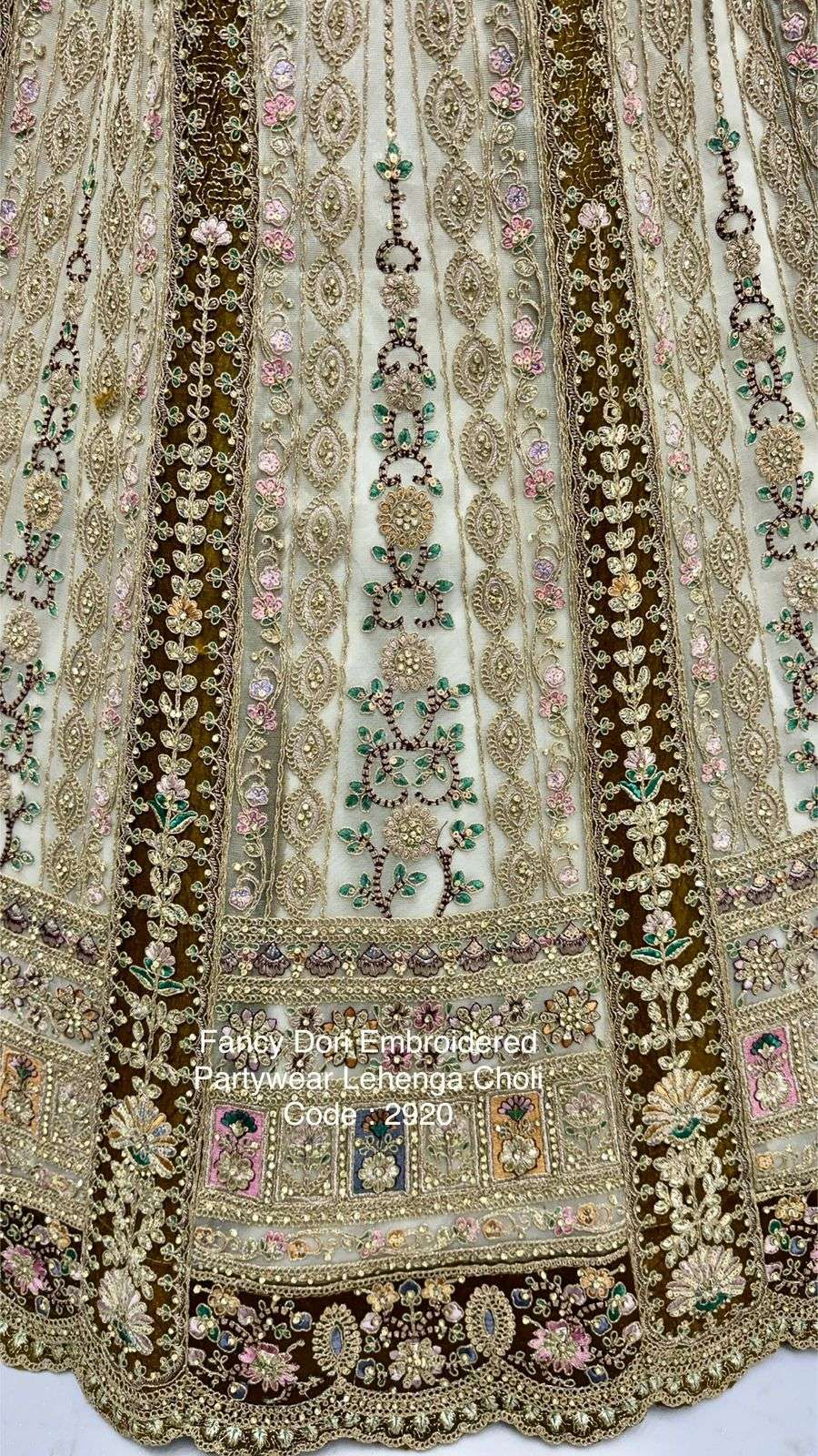 Code : 2920 Lehenga : Fabric - Net Work - Dori Work Multi thread Zari and sequins work Diamond work Stitching - Standard cancan and canvas attached free size up to 42