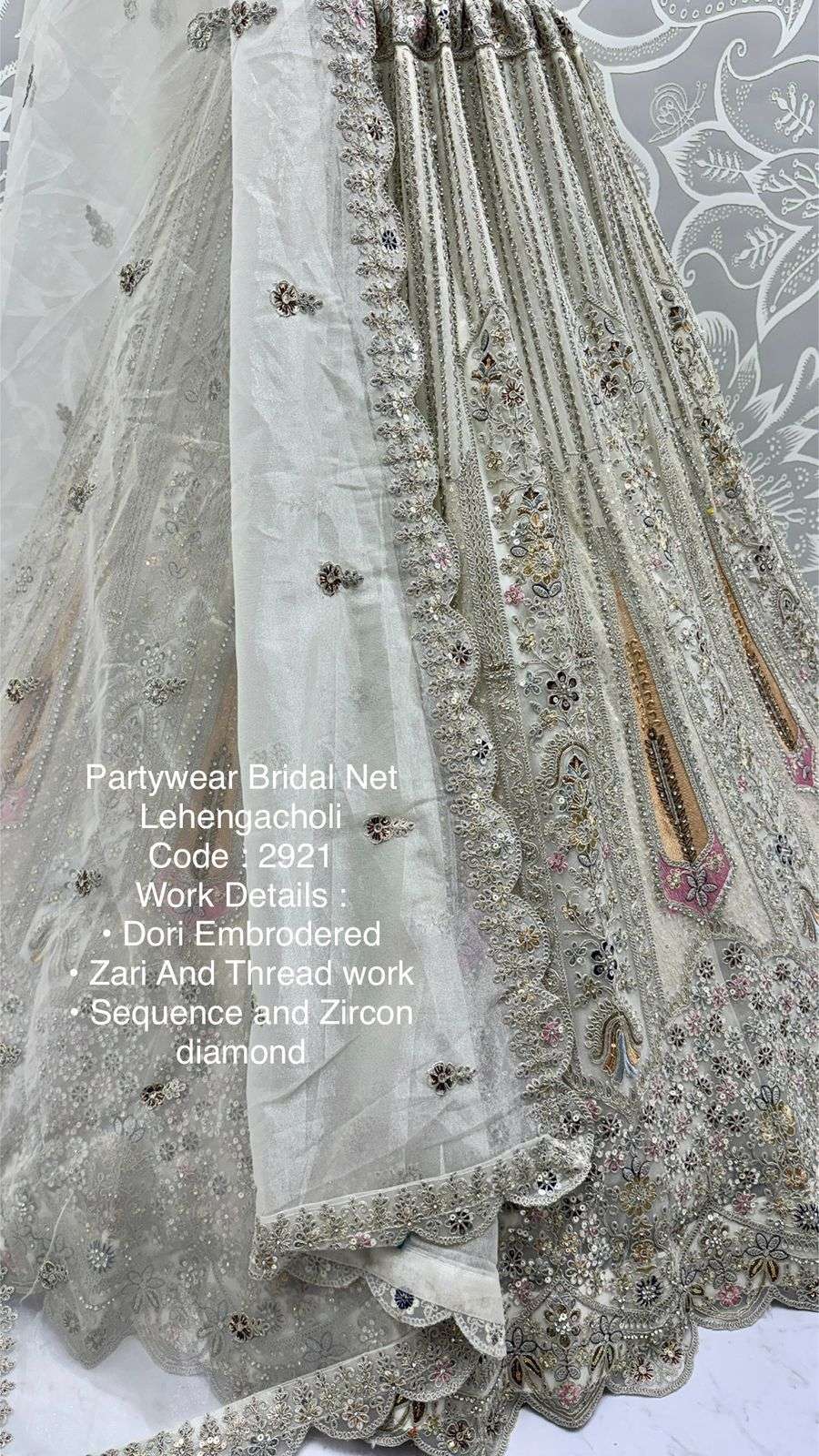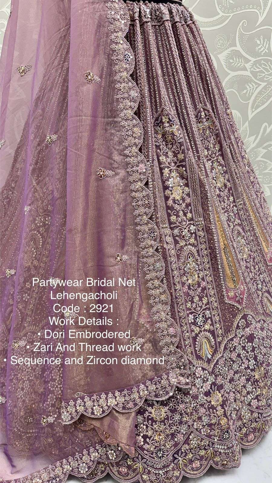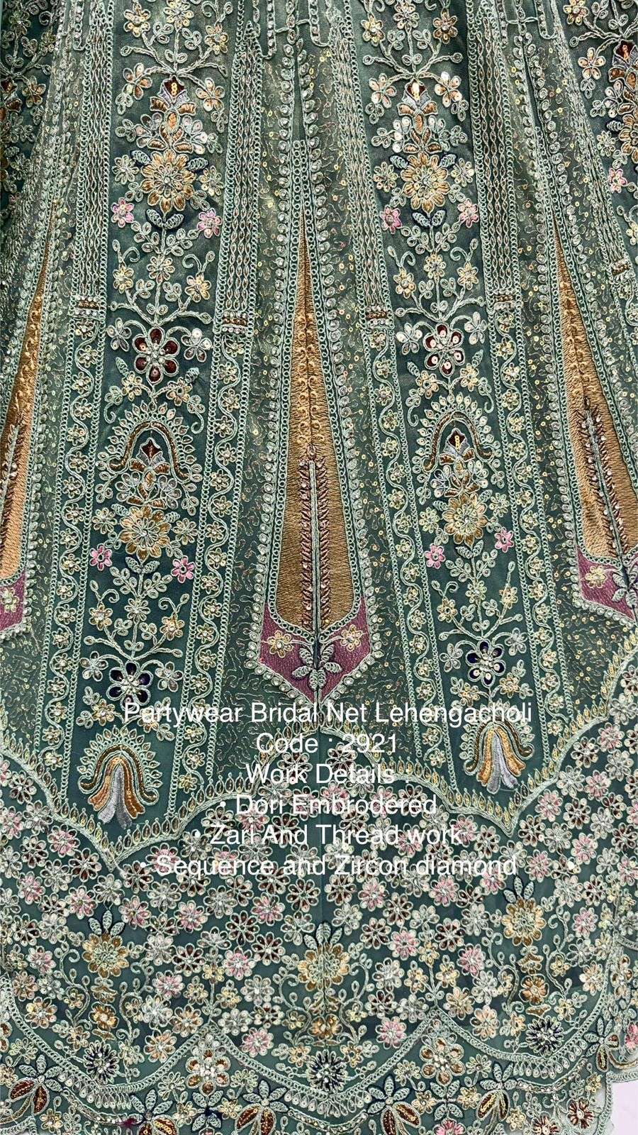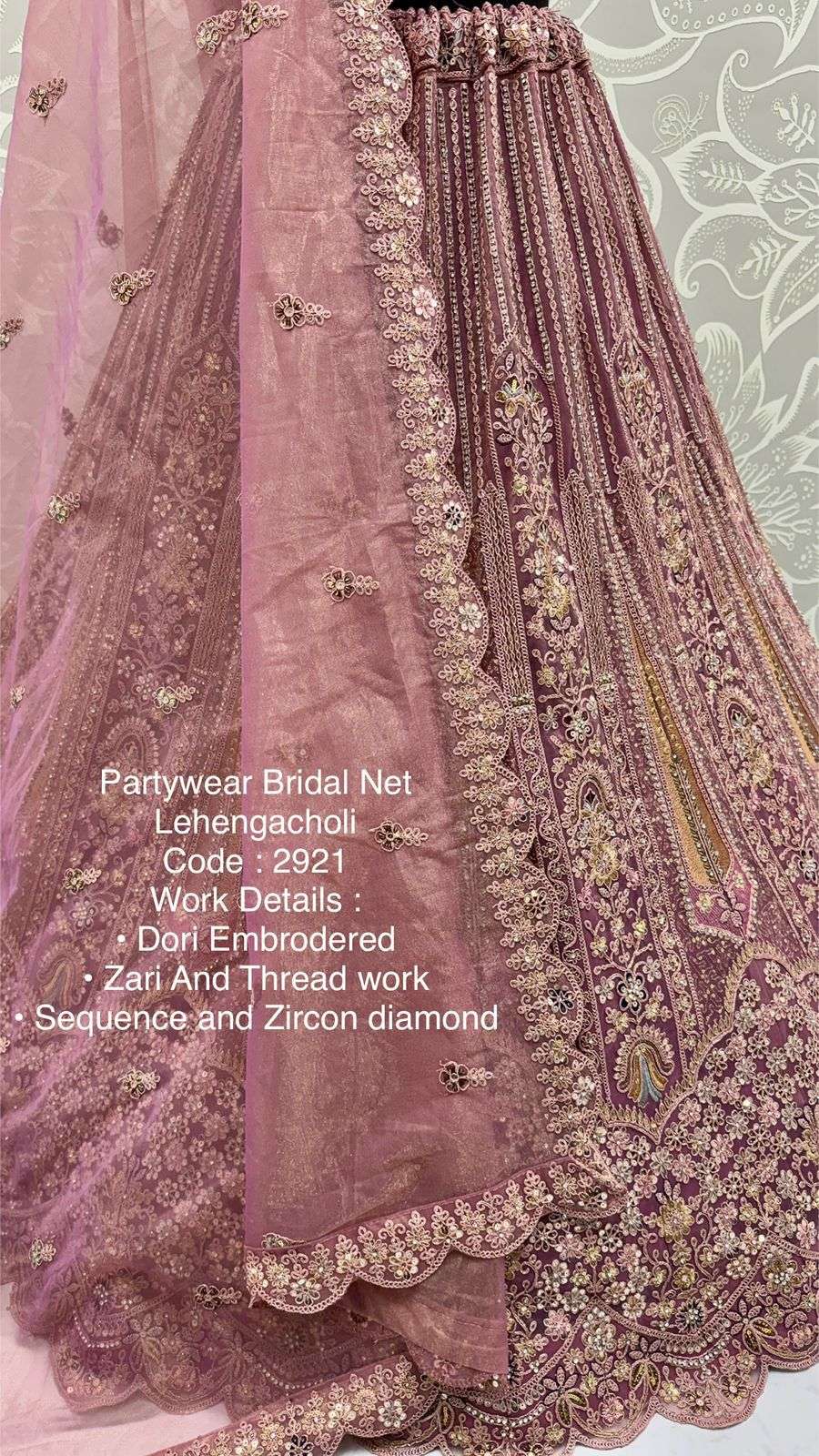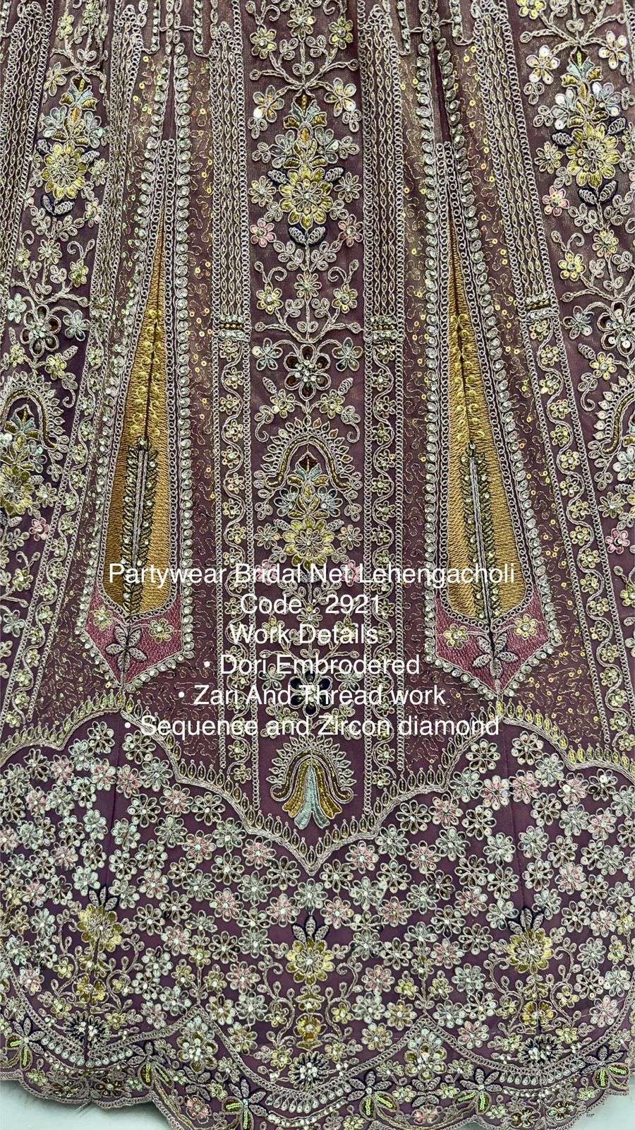 Code : 2921 Lehenga : Fabric - Bridal Net Work - • Dori Embrodered • Zari And Thread work • Sequence and Zircon diamond Stitching - Standard Cancan and Canvas attached free size upto 42