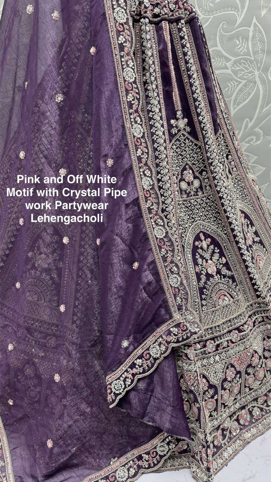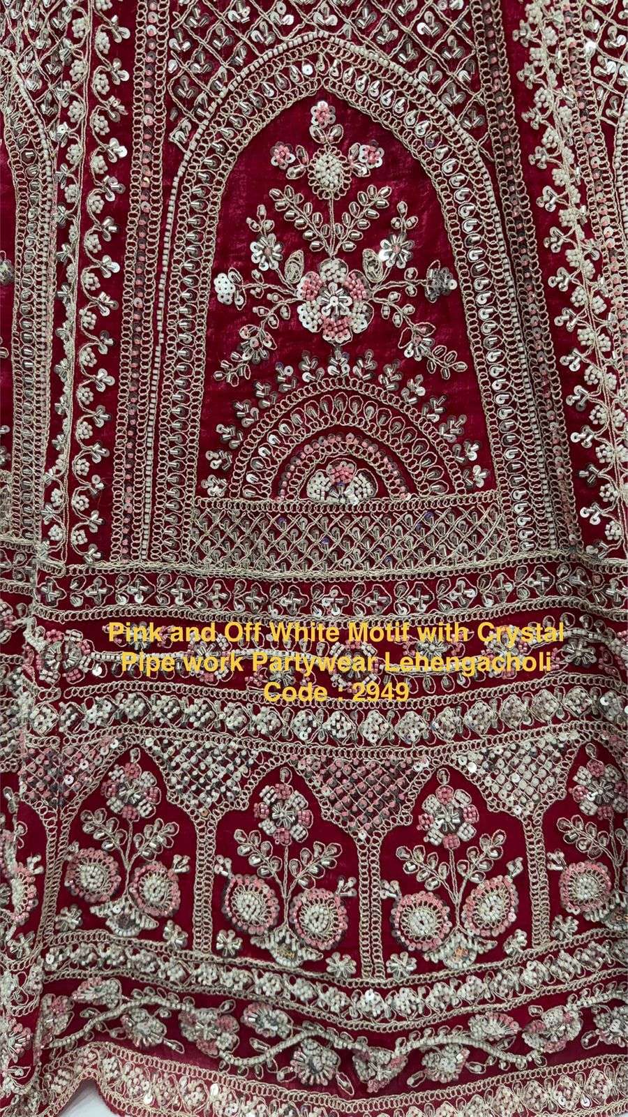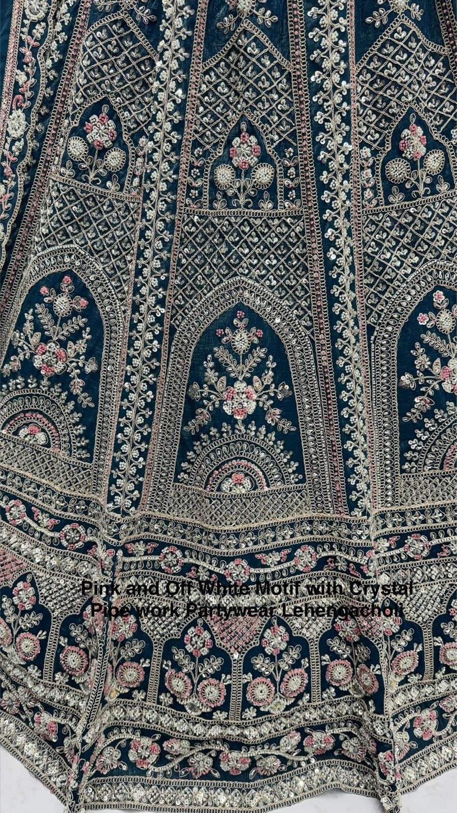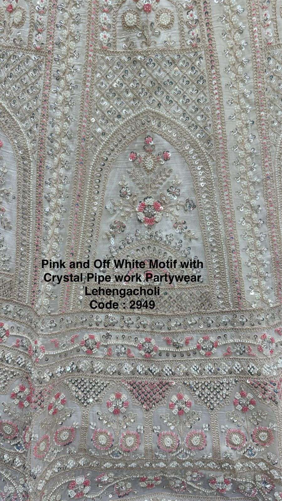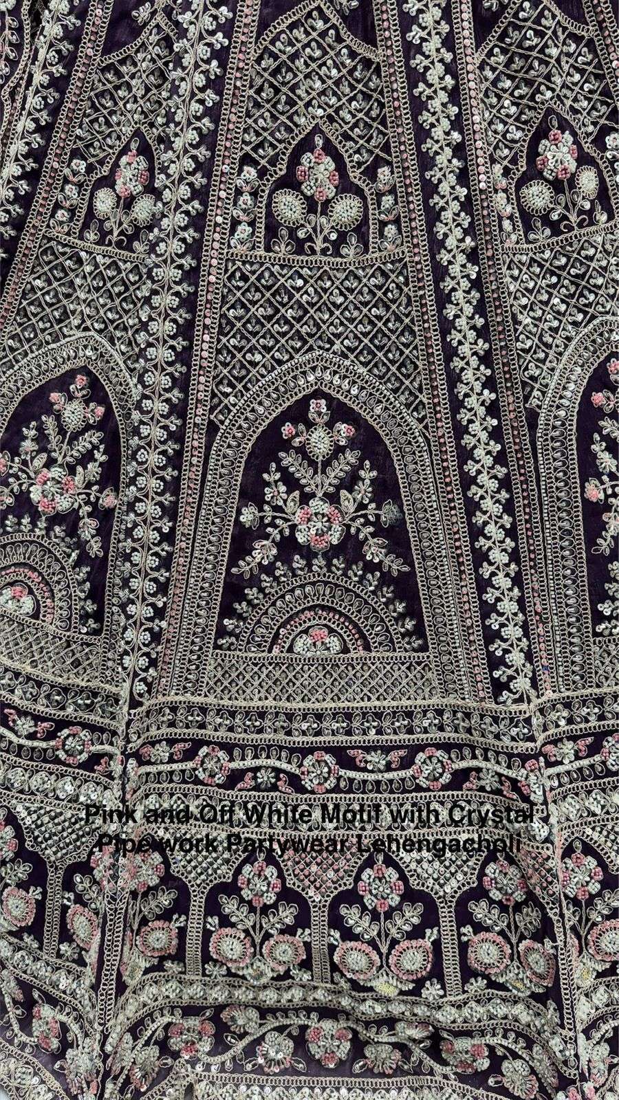 Pink and Off White Motif with Crystal Pipe work Partywear Lehengacholi