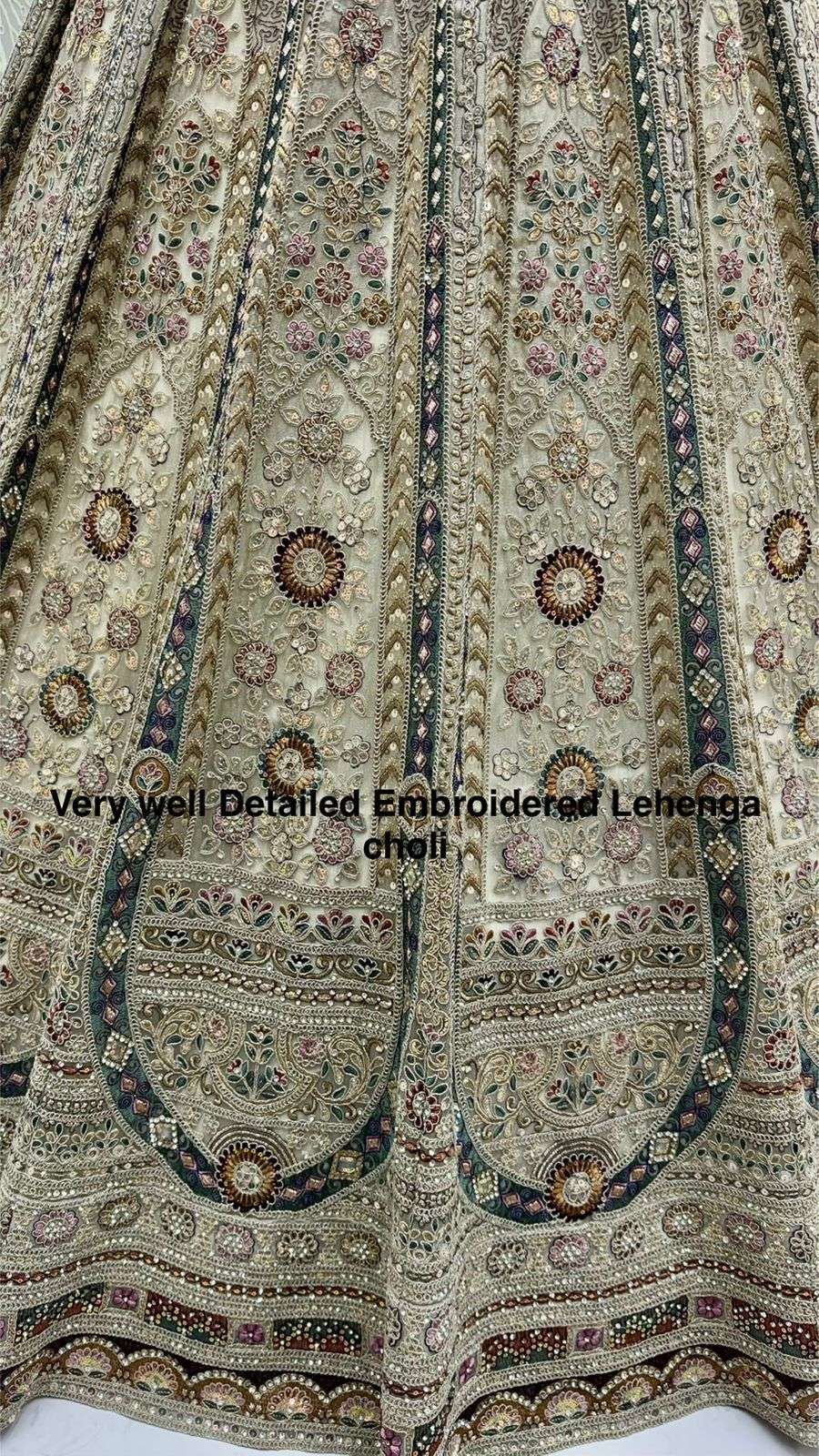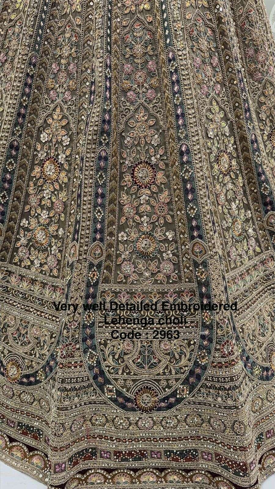 Code : 2963 Lehenga : Fabric - Twirl Net Work - Various Sequins Multi Thread and Zari work Dori embroidered flower Diamond work Stitching - Standard Double layer cancan and canvas Flair - 4 Meter plus