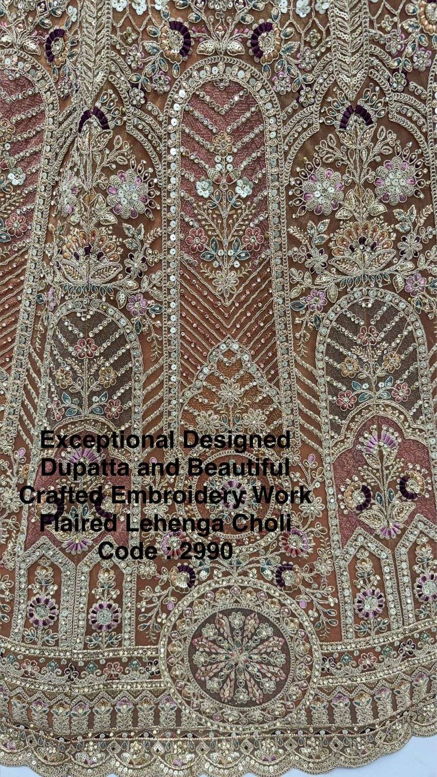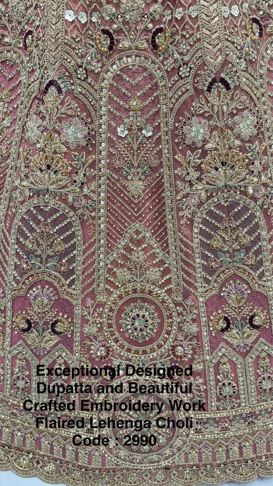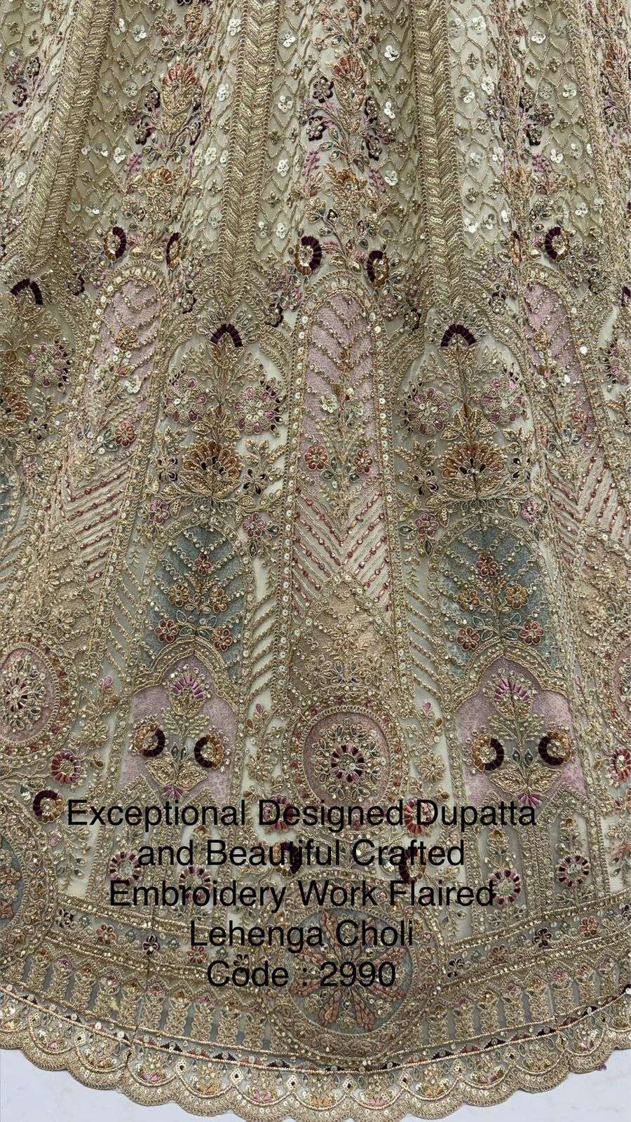 Code : 2990 Lehenga : Fabric - Bridal Net Work - Fancy Chapat Zari Multi Thread Embroidery Dori Wor Sequince and Zircon Diamond Stitching - Standard Cancan and Canvas attached free size up to 42 Flair - Four Meter Plus