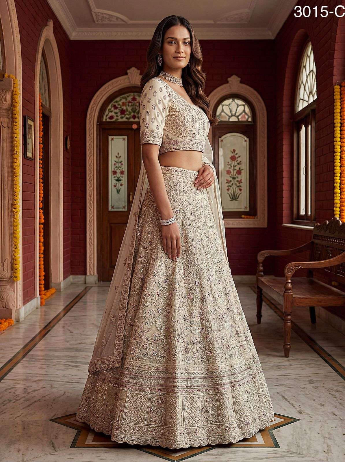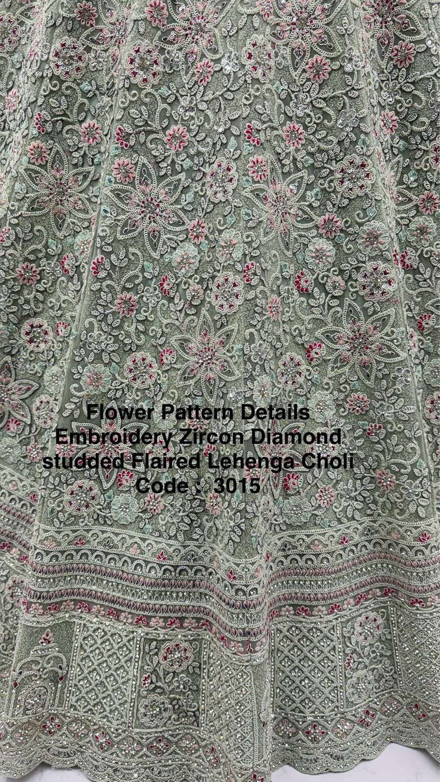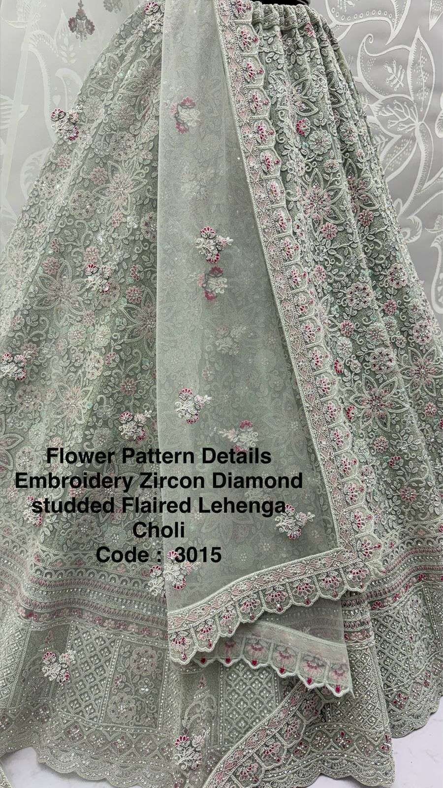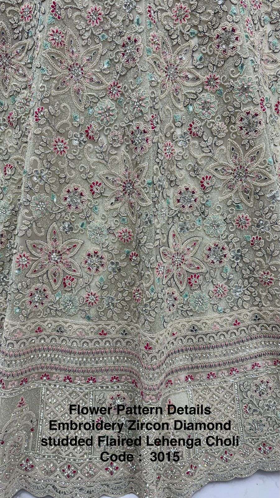 Code : 3015 Lehenga : Fabric - Bridal Net Work - Fancy Chapat Zari Multi Thread Embroidery Dori Wor Sequince and Zircon Diamond Stitching - Standard Cancan and Canvas attached free size up to 42 Flair - Four Meter Plus
