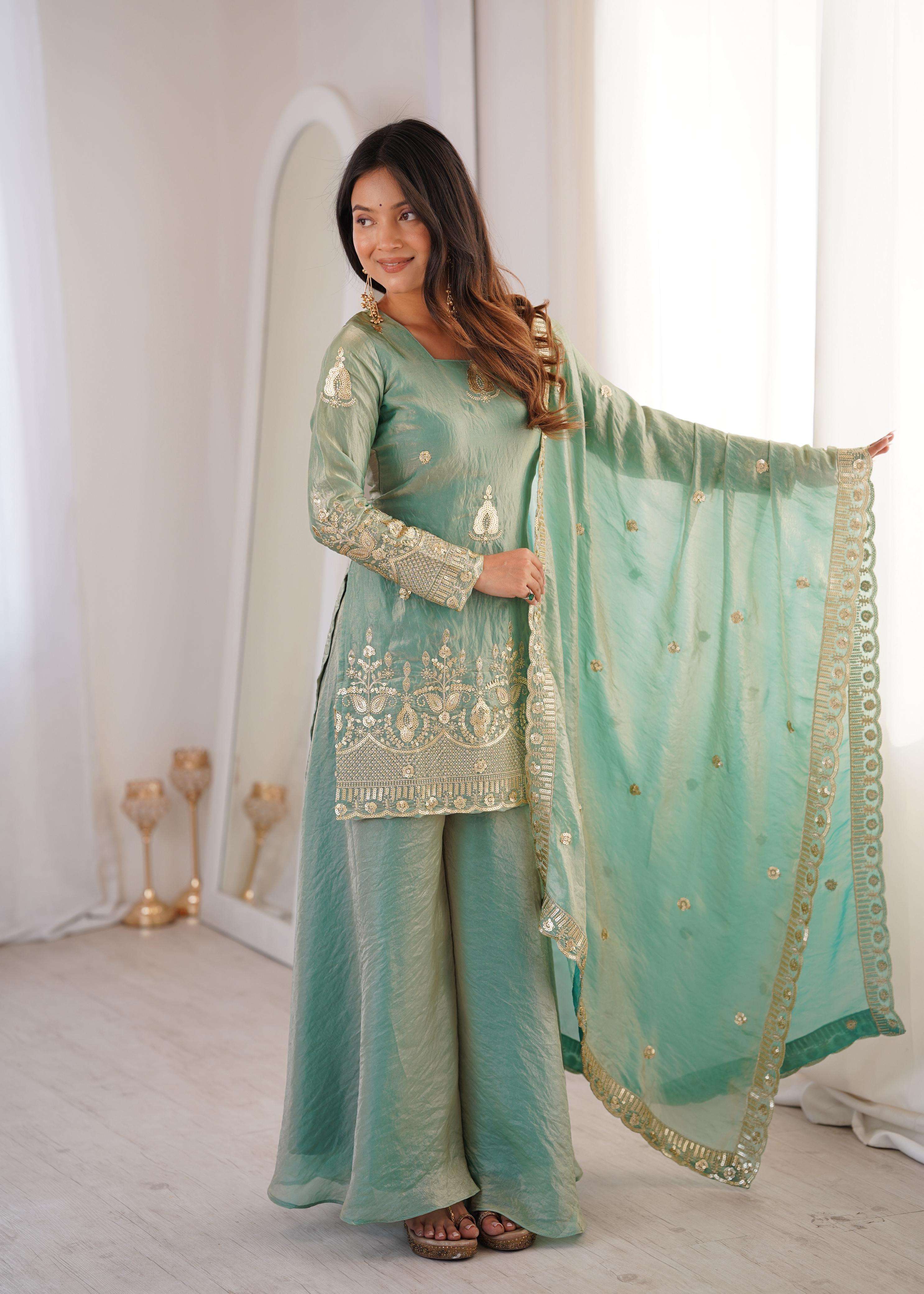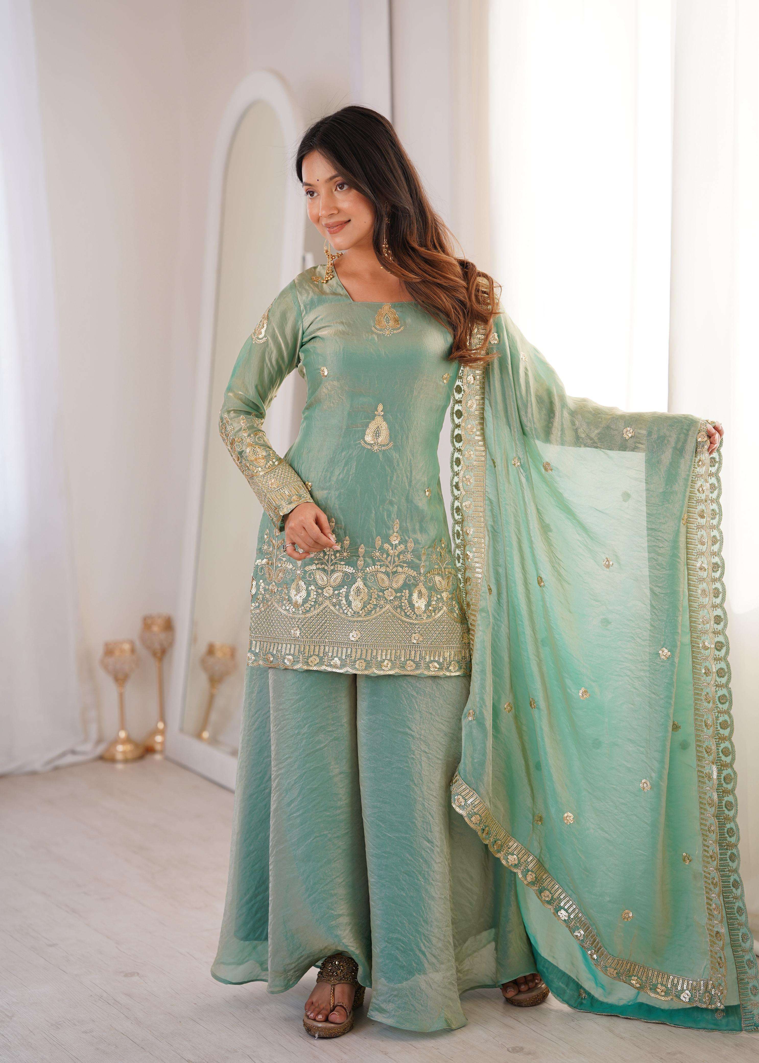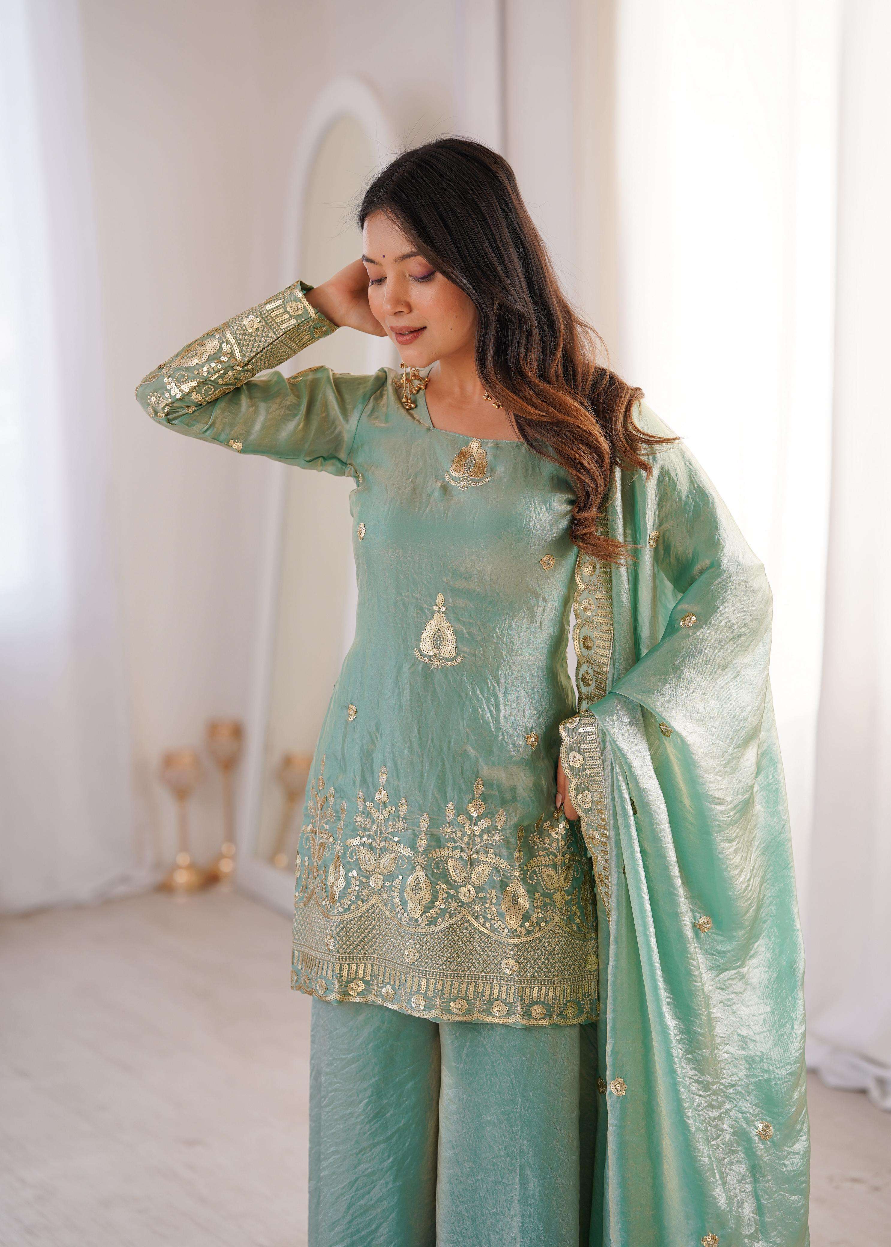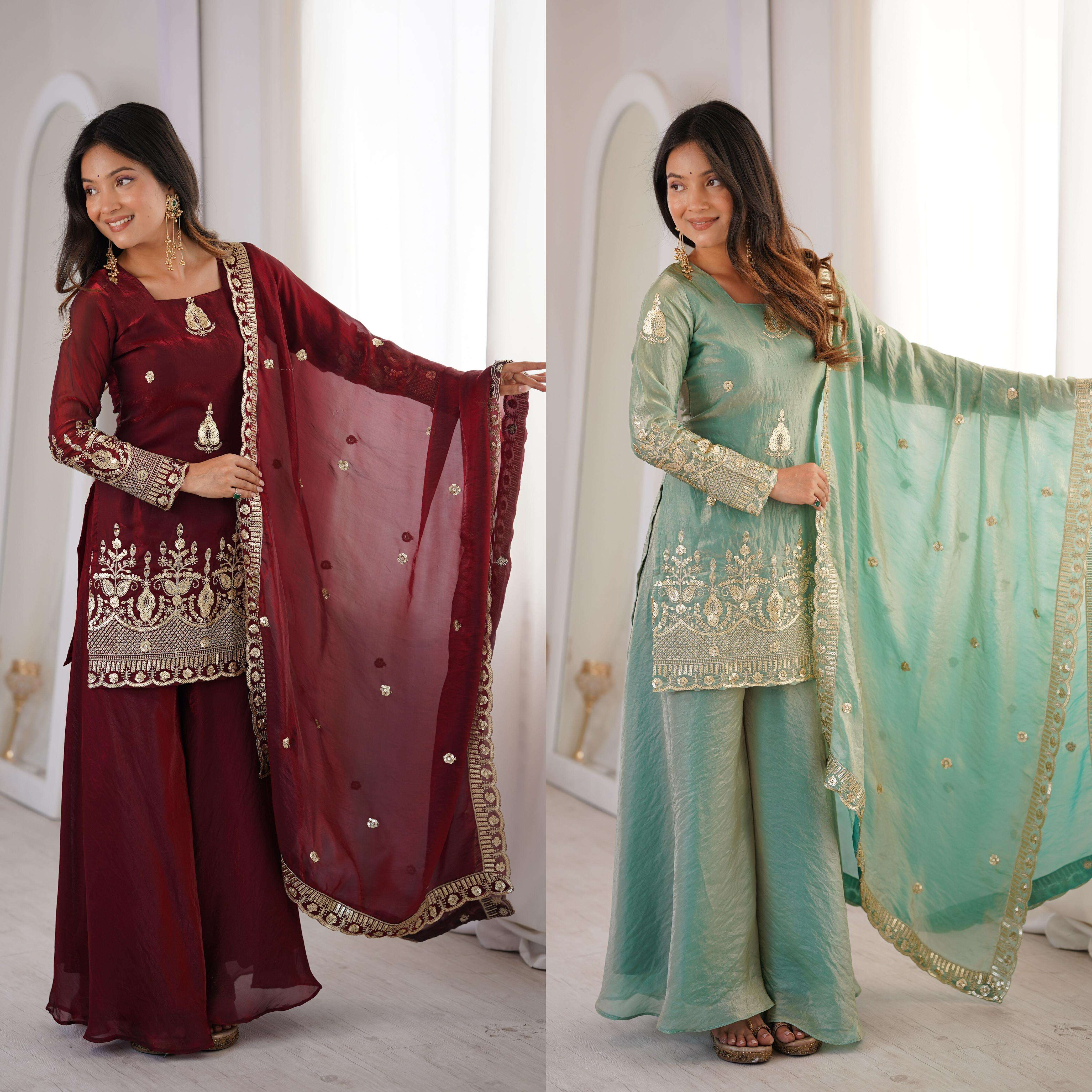 👚 *TOP:* • *Fabric:* *Fendy Silk* • *Design:* *Embroidery Sequence Work* • *Sleeves:* Full • *Inner:* Heavy Micro Cotton • *Length:* 28-29 inches 📏 *Sizes Available:* *M (38), L (40), XL (42), XXL (44)*