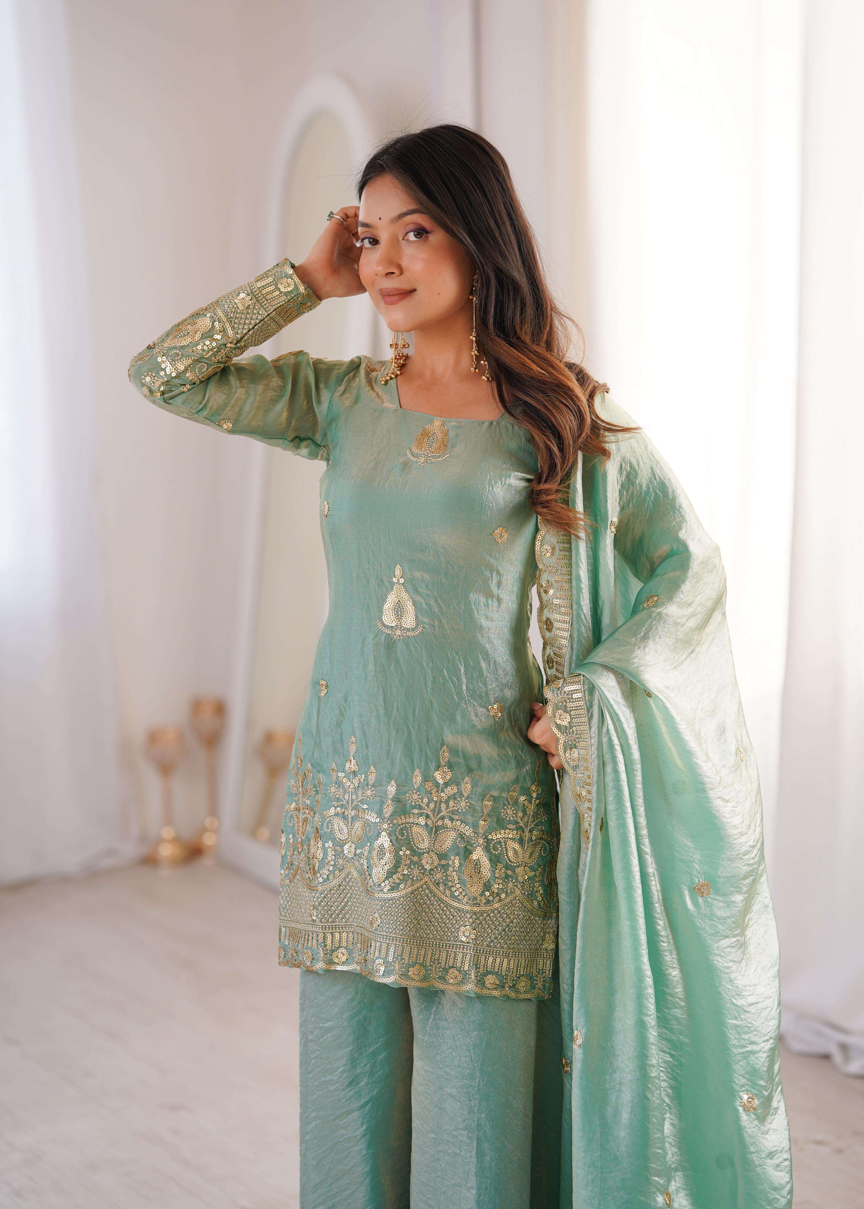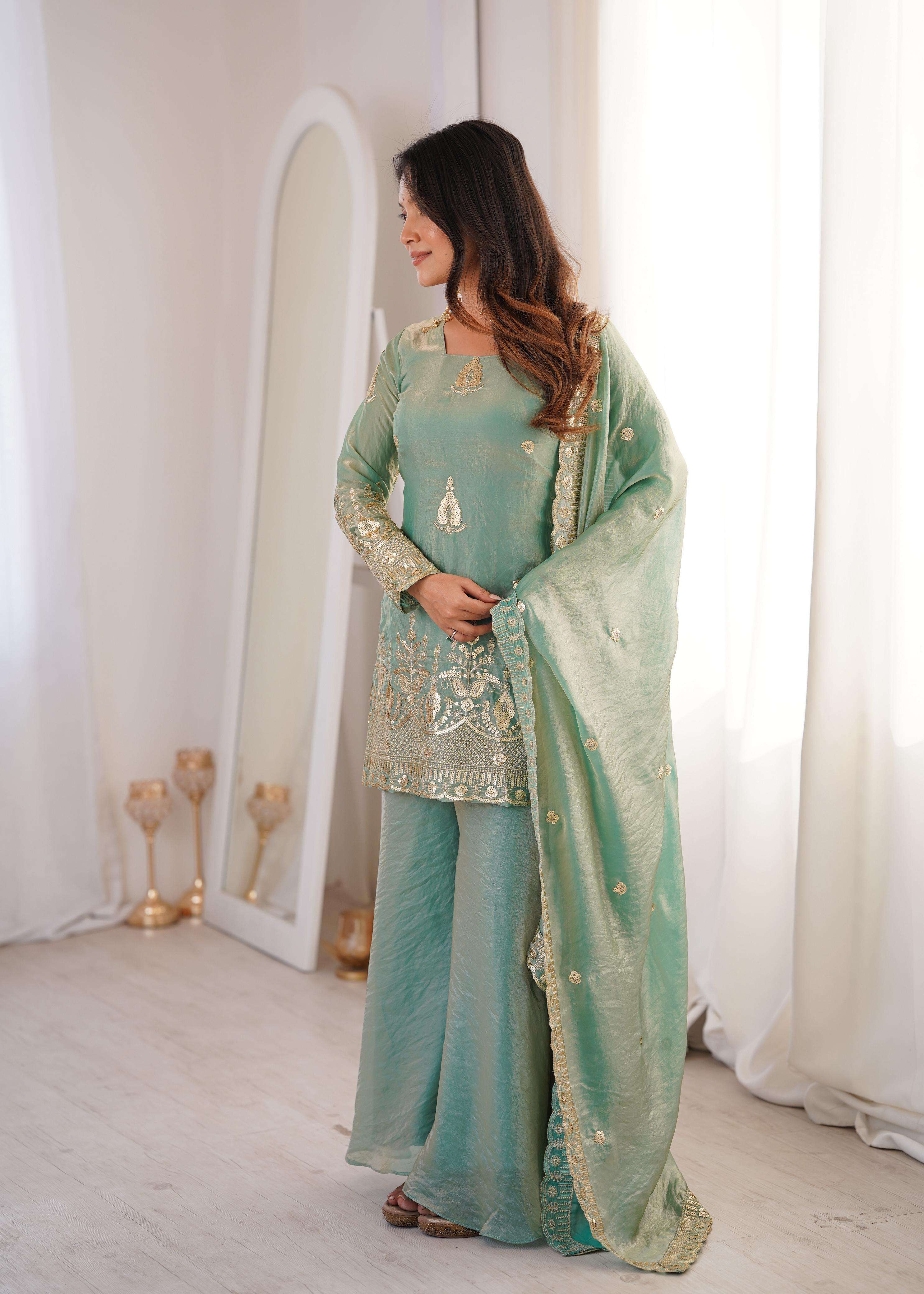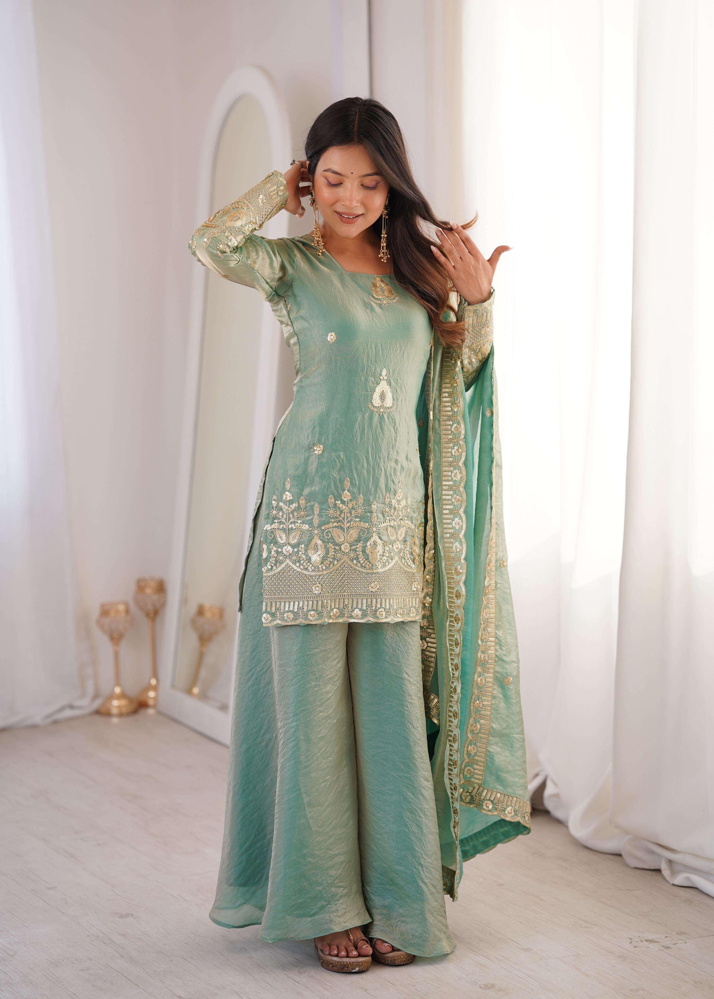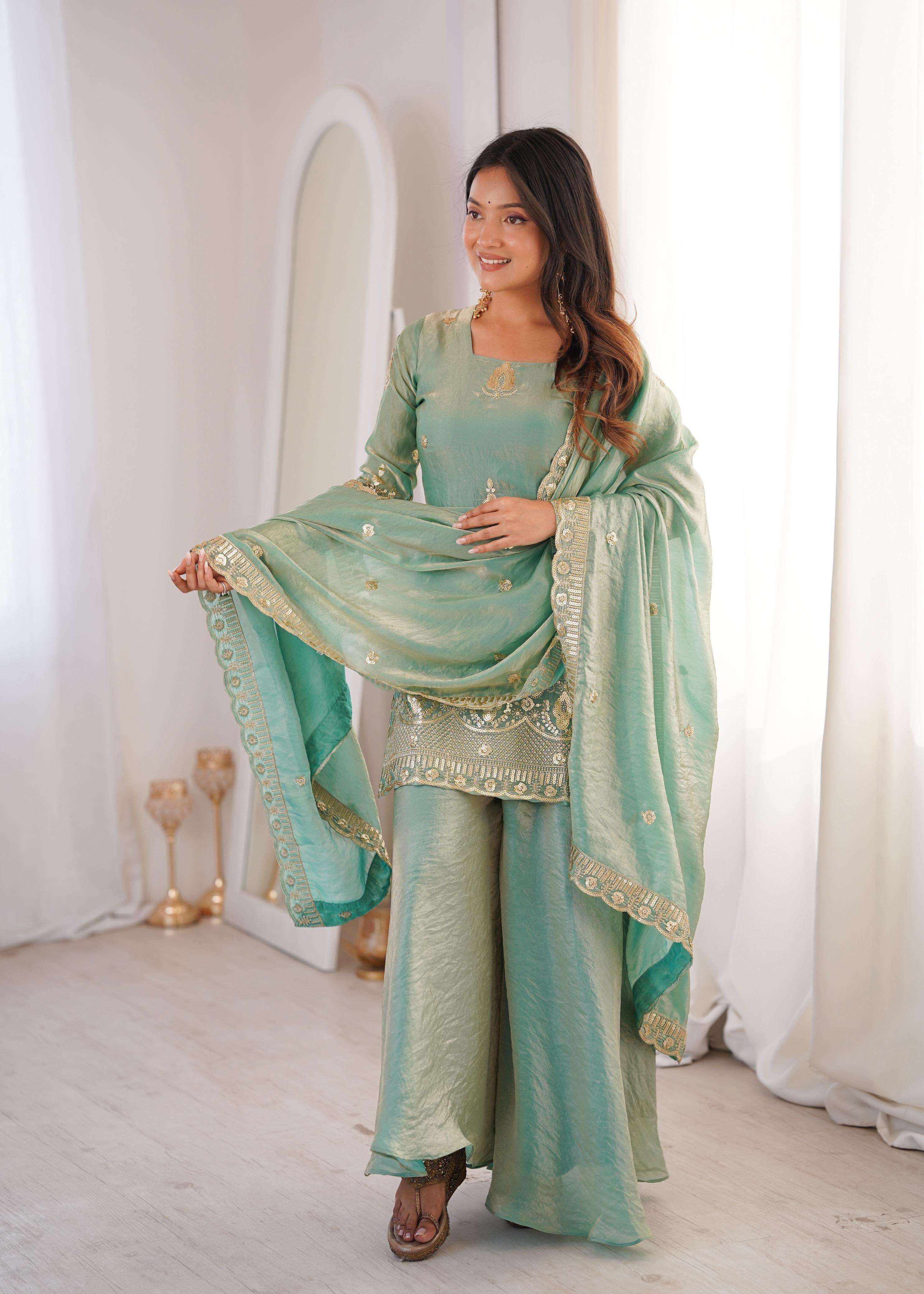 👚 *TOP:* • *Fabric:* *Fendy Silk* • *Design:* *Embroidery Sequence Work* • *Sleeves:* Full • *Inner:* Heavy Micro Cotton • *Length:* 28-29 inches 📏 *Sizes Available:* *M (38), L (40), XL (42), XXL (44)*