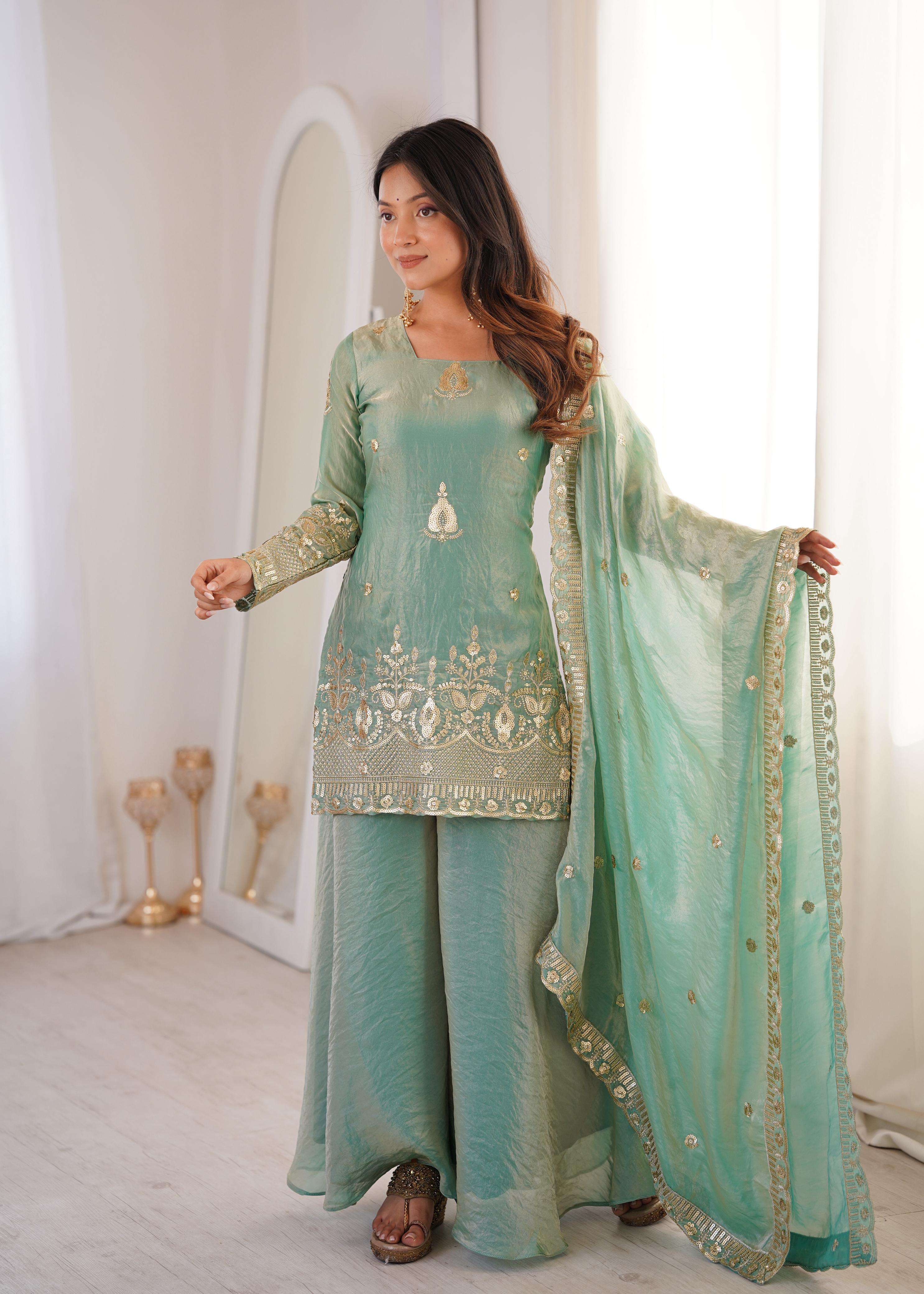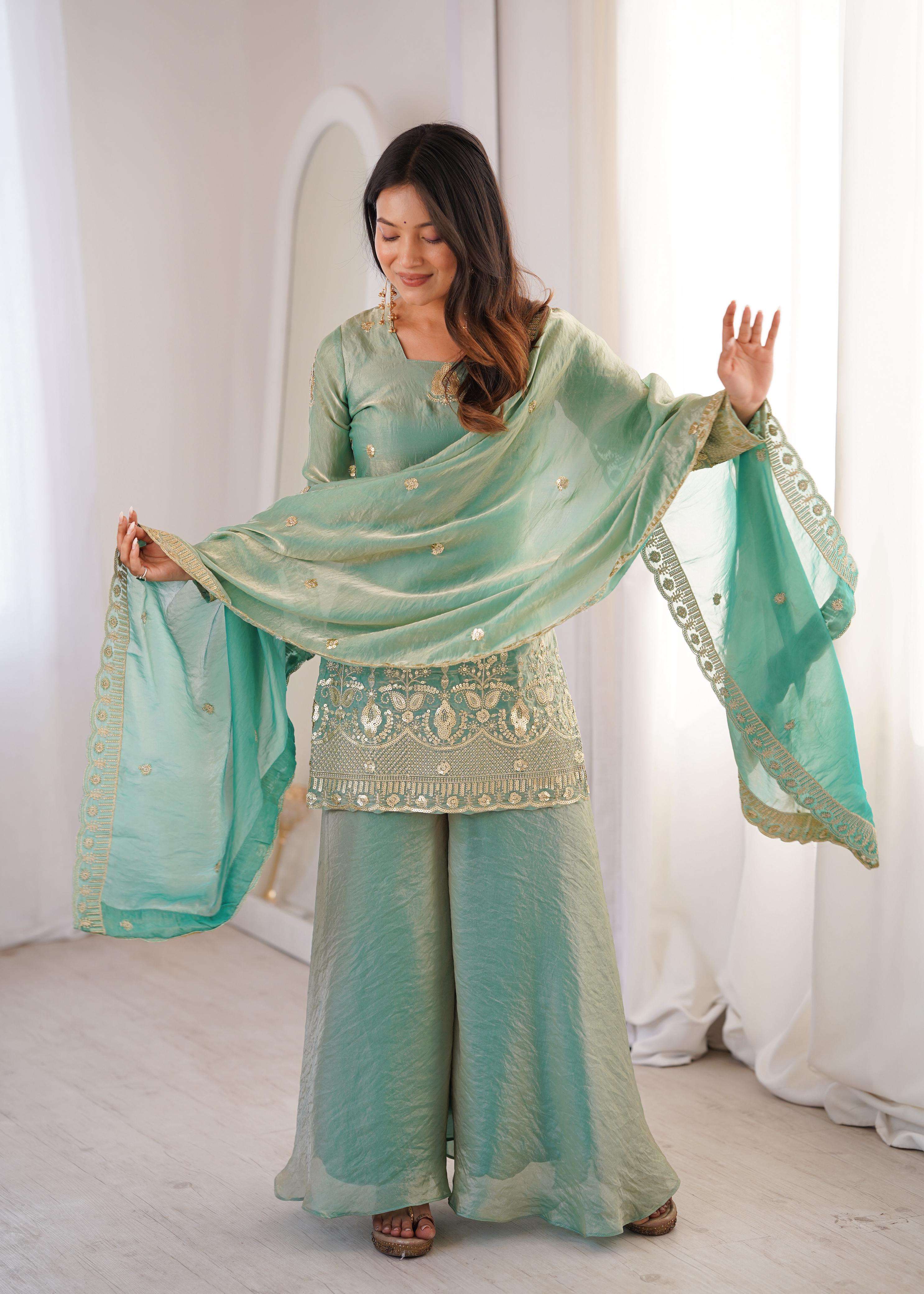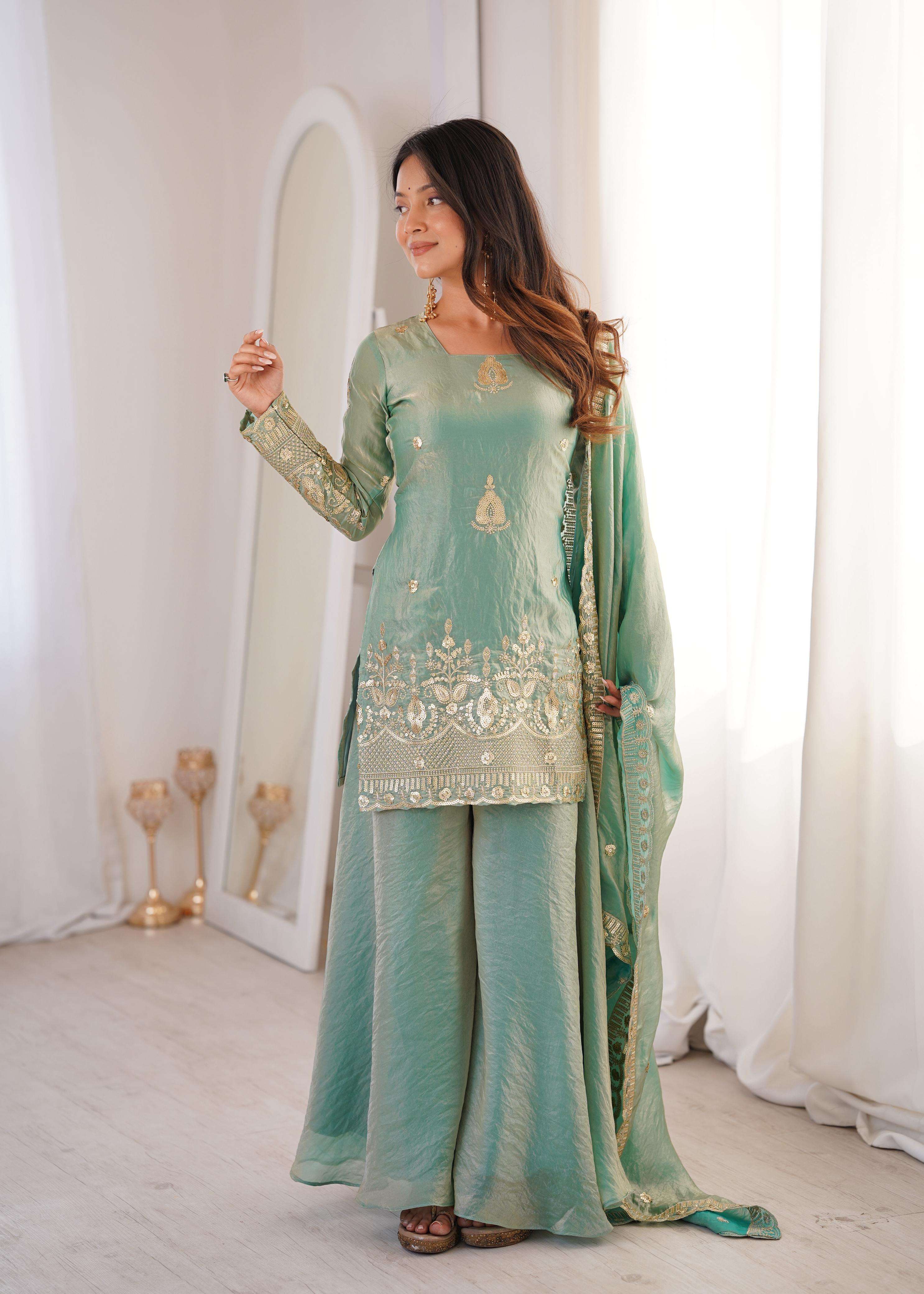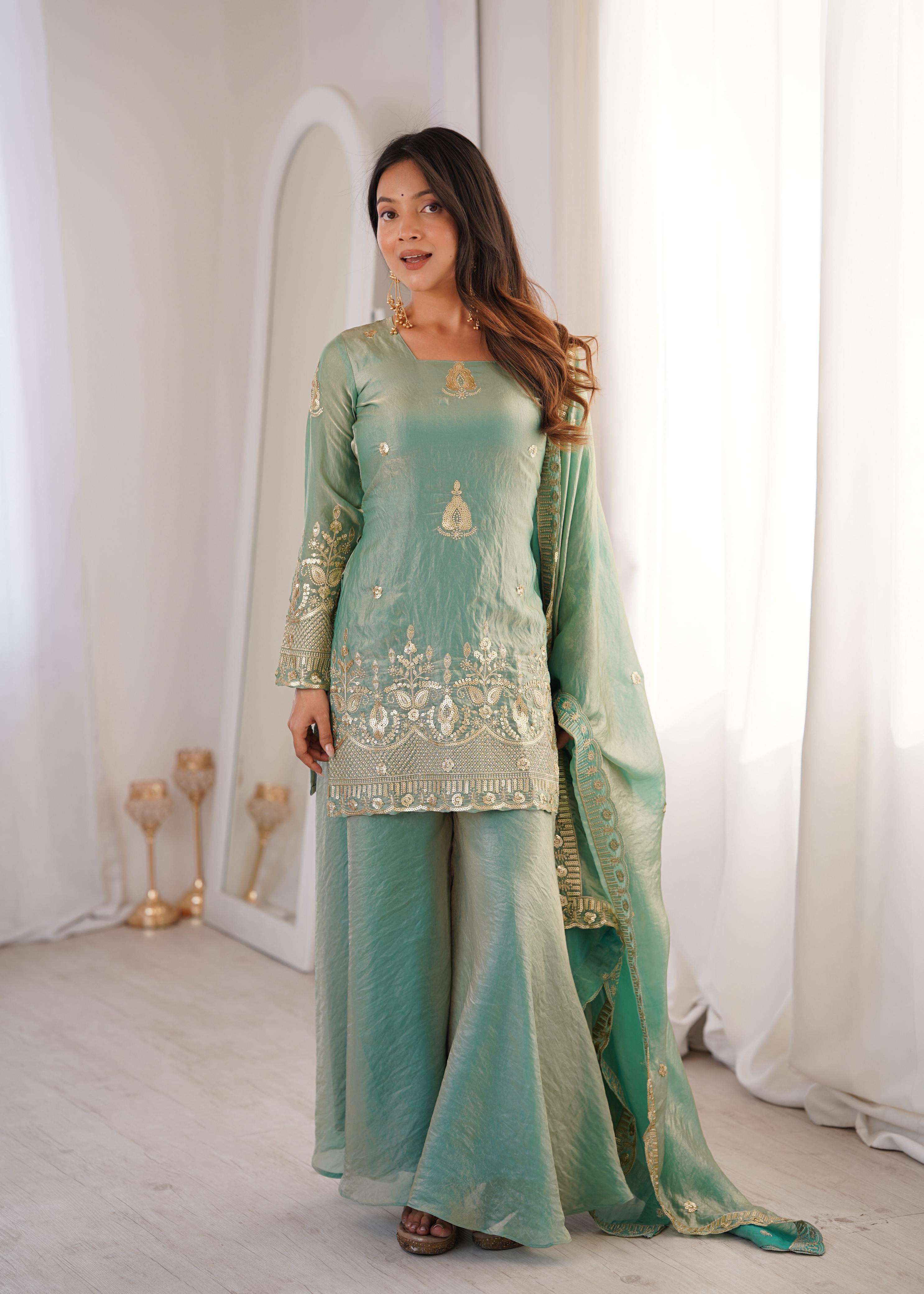 👚 *TOP:* • *Fabric:* *Fendy Silk* • *Design:* *Embroidery Sequence Work* • *Sleeves:* Full • *Inner:* Heavy Micro Cotton • *Length:* 28-29 inches 📏 *Sizes Available:* *M (38), L (40), XL (42), XXL (44)*