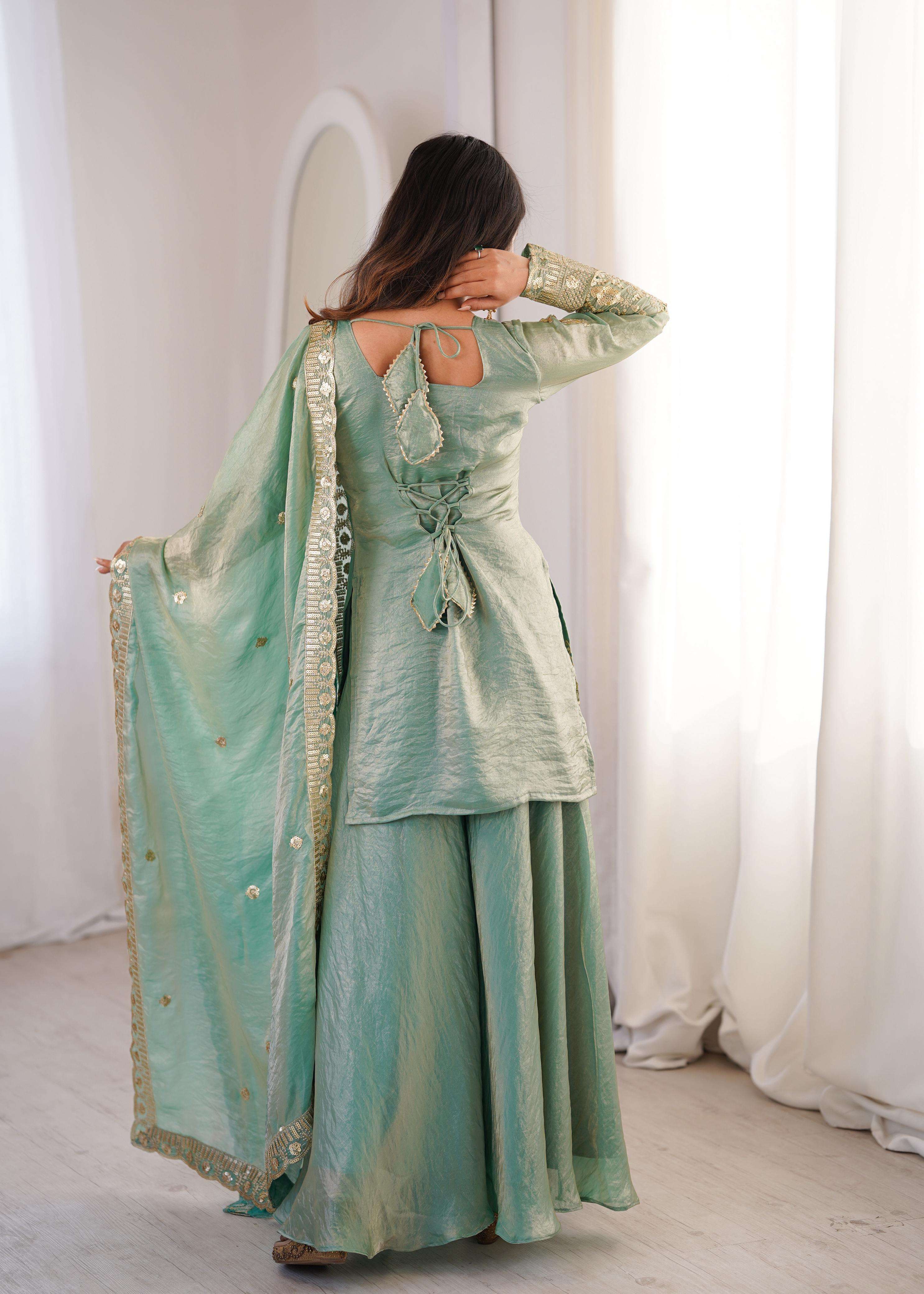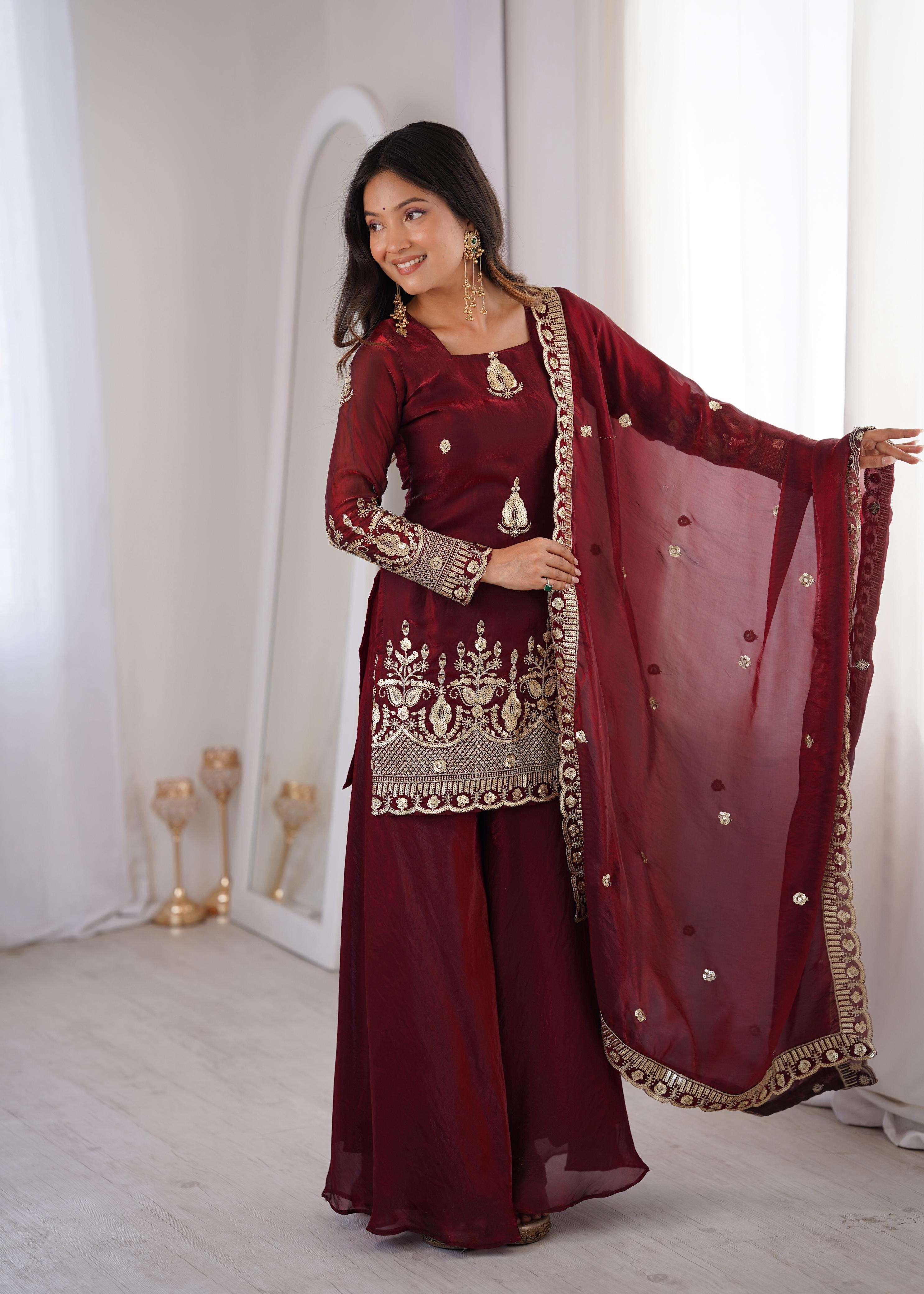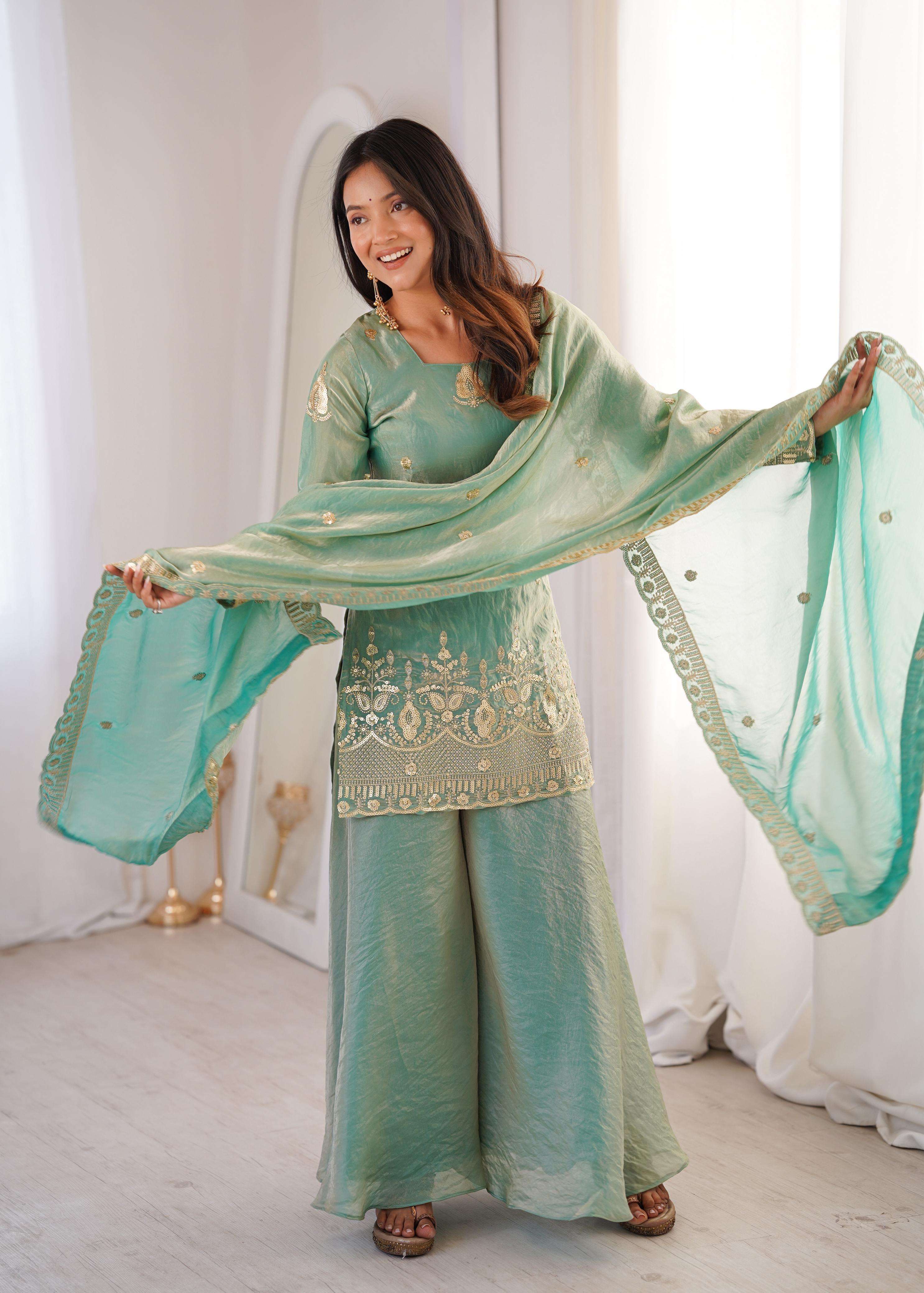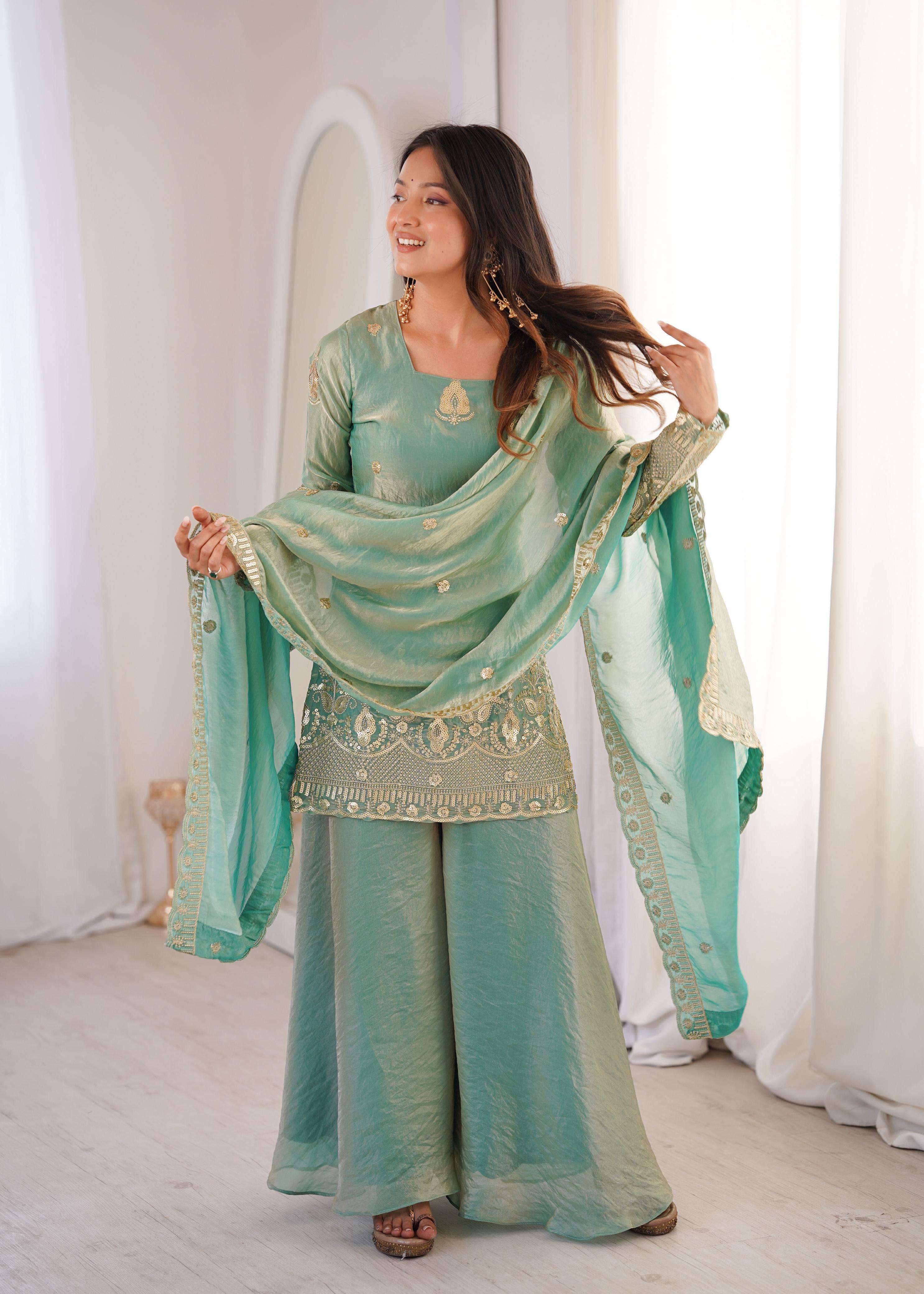 👖 *BOTTOM (Sharara Plazzo):* • *Fabric:* *Fendy Silk + Full Flair* • *Length:* 40-41 inches