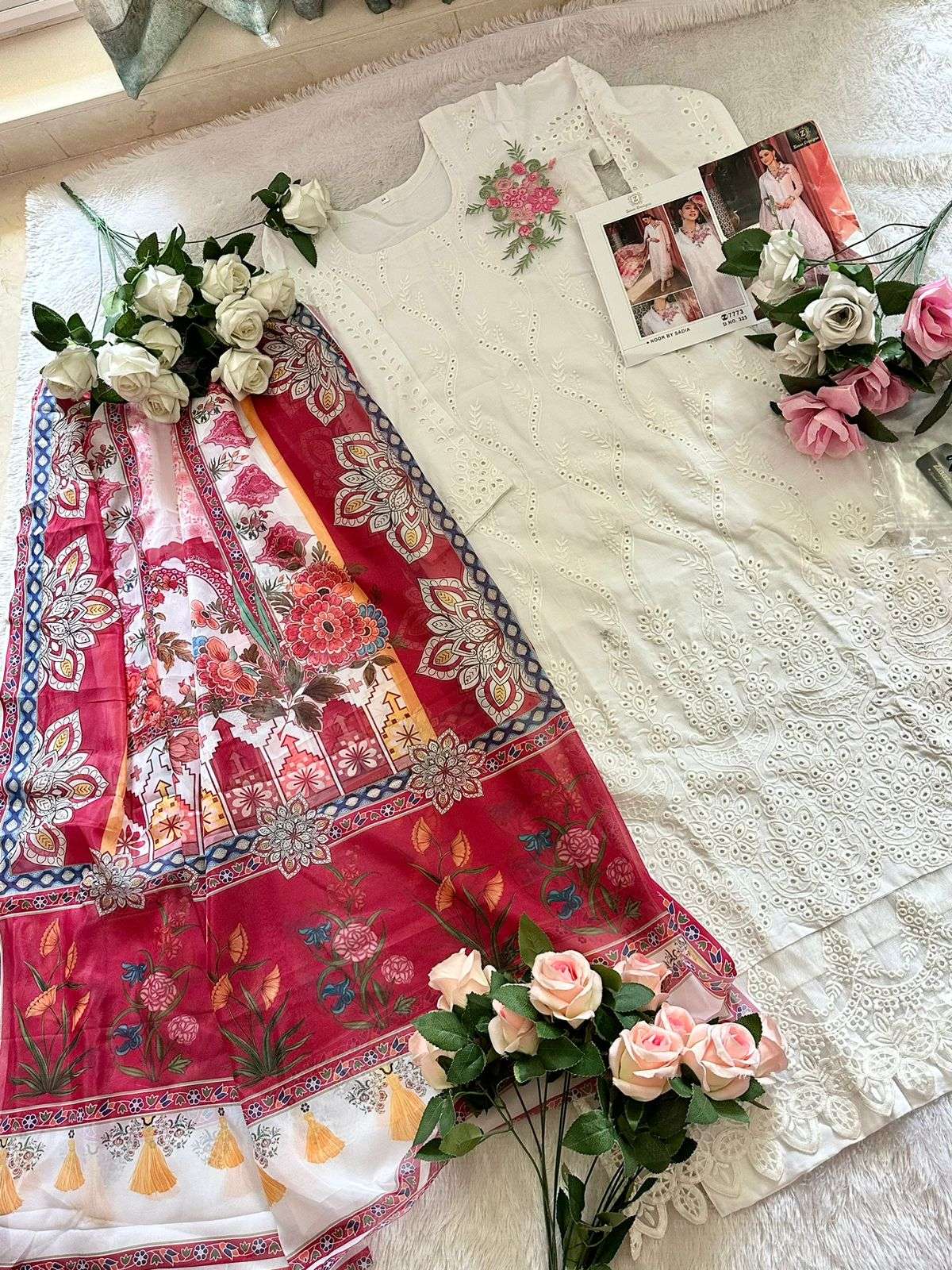 Rayon Self embroidered very beautiful white shade semi stitched outfit with unstitched rayon bottoms and tabby Silk printed dupatta