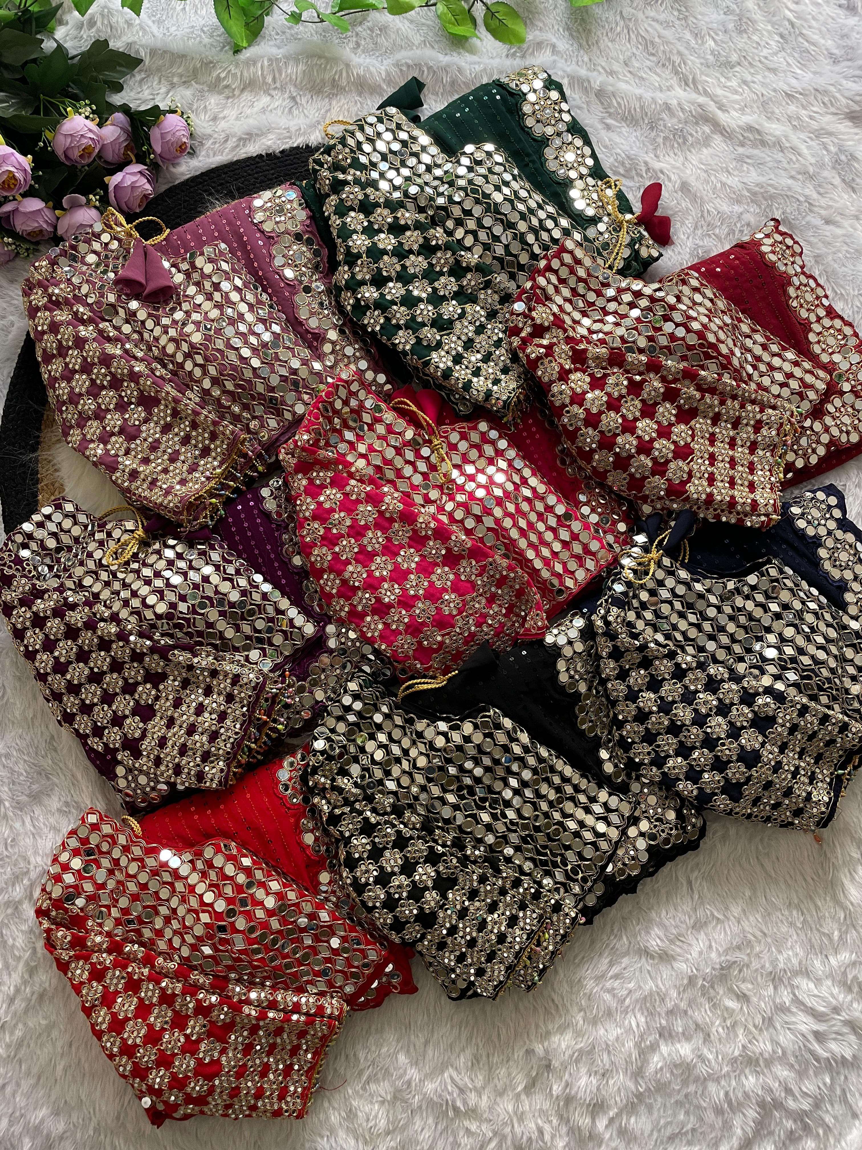 *STICHED BLOUSE* Heavy faux Georgette Blouse With Heavy Embroidery Front & Back With sleeves With Heavy Original Mirror nd tessels attached in Sleeves