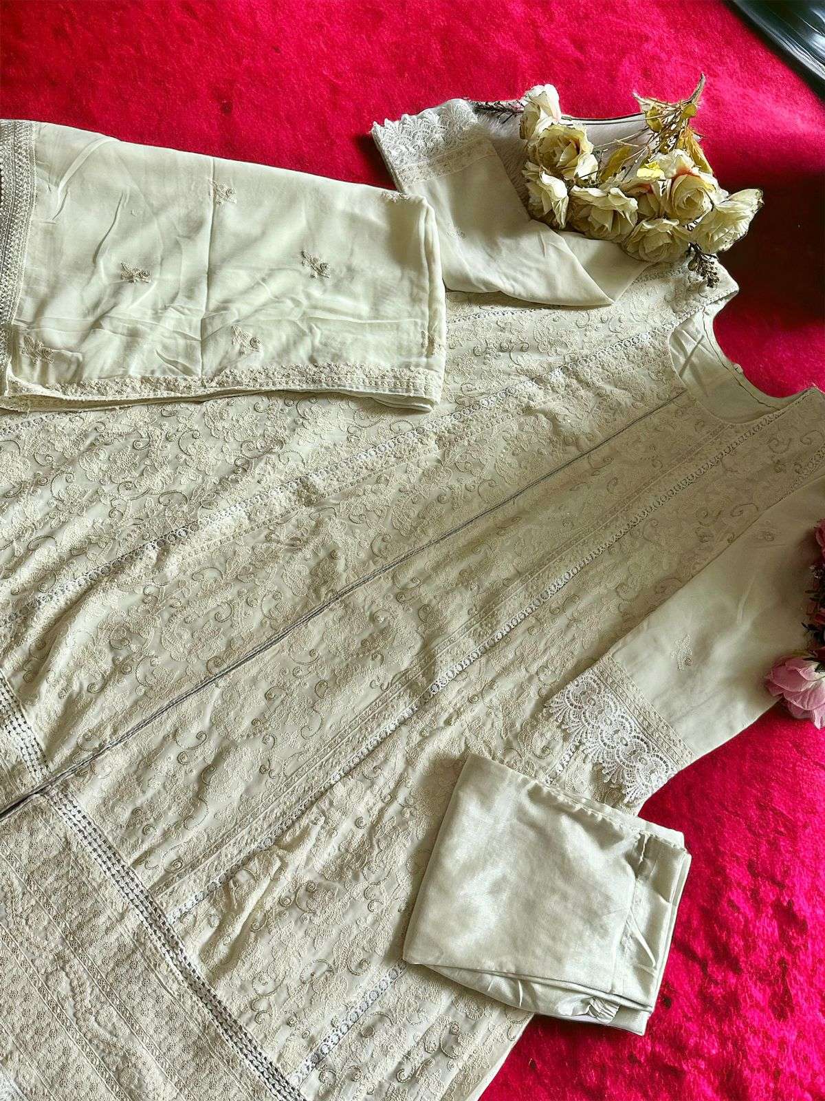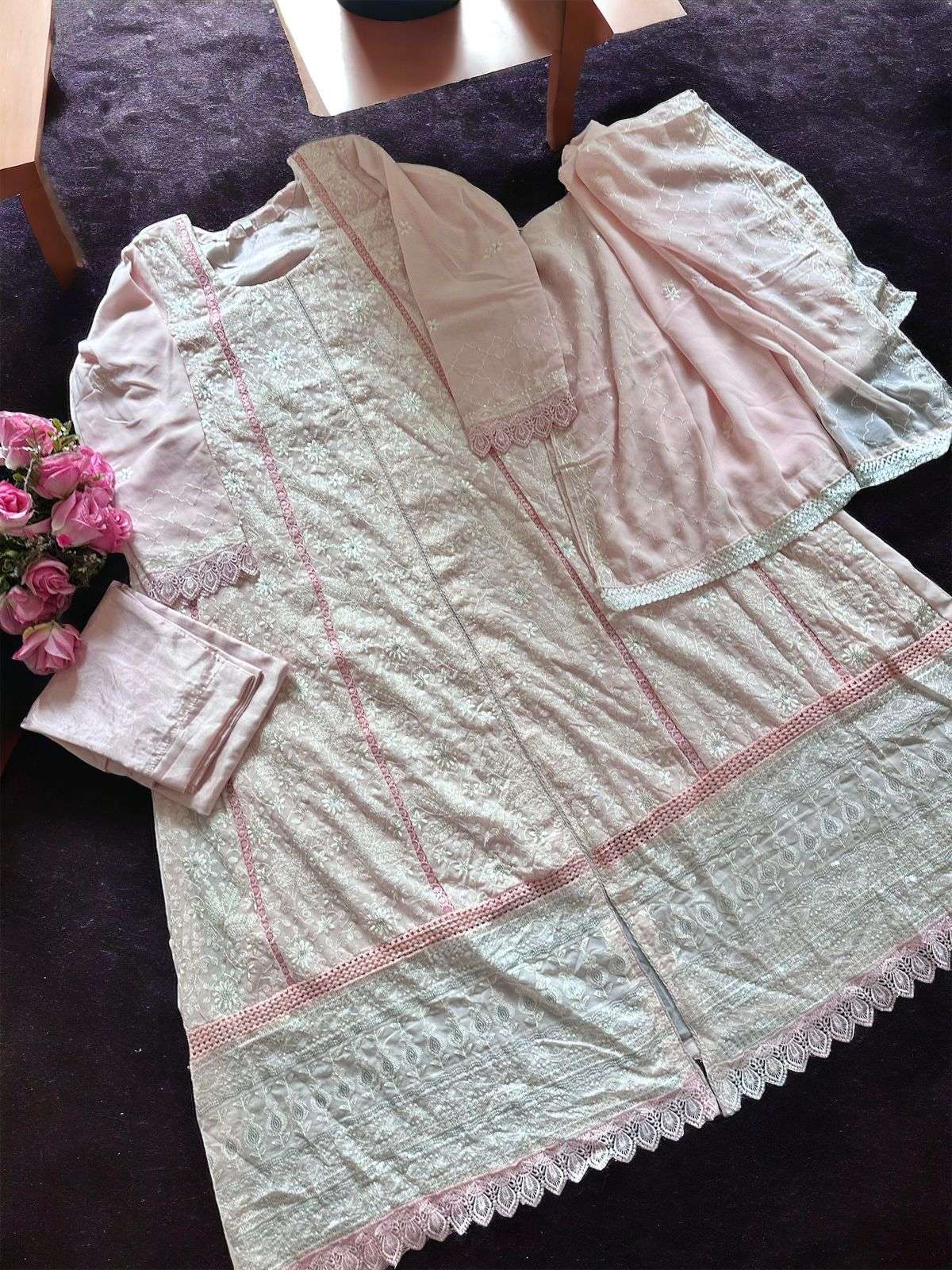 Georgette very heavy embroidered chikenkari work semi stitched outfits🩷🩷 length 48+ unstitched santoon inner and bottoms. Georrgtte embrdroidered heavy work gorgeous dupattas 😍