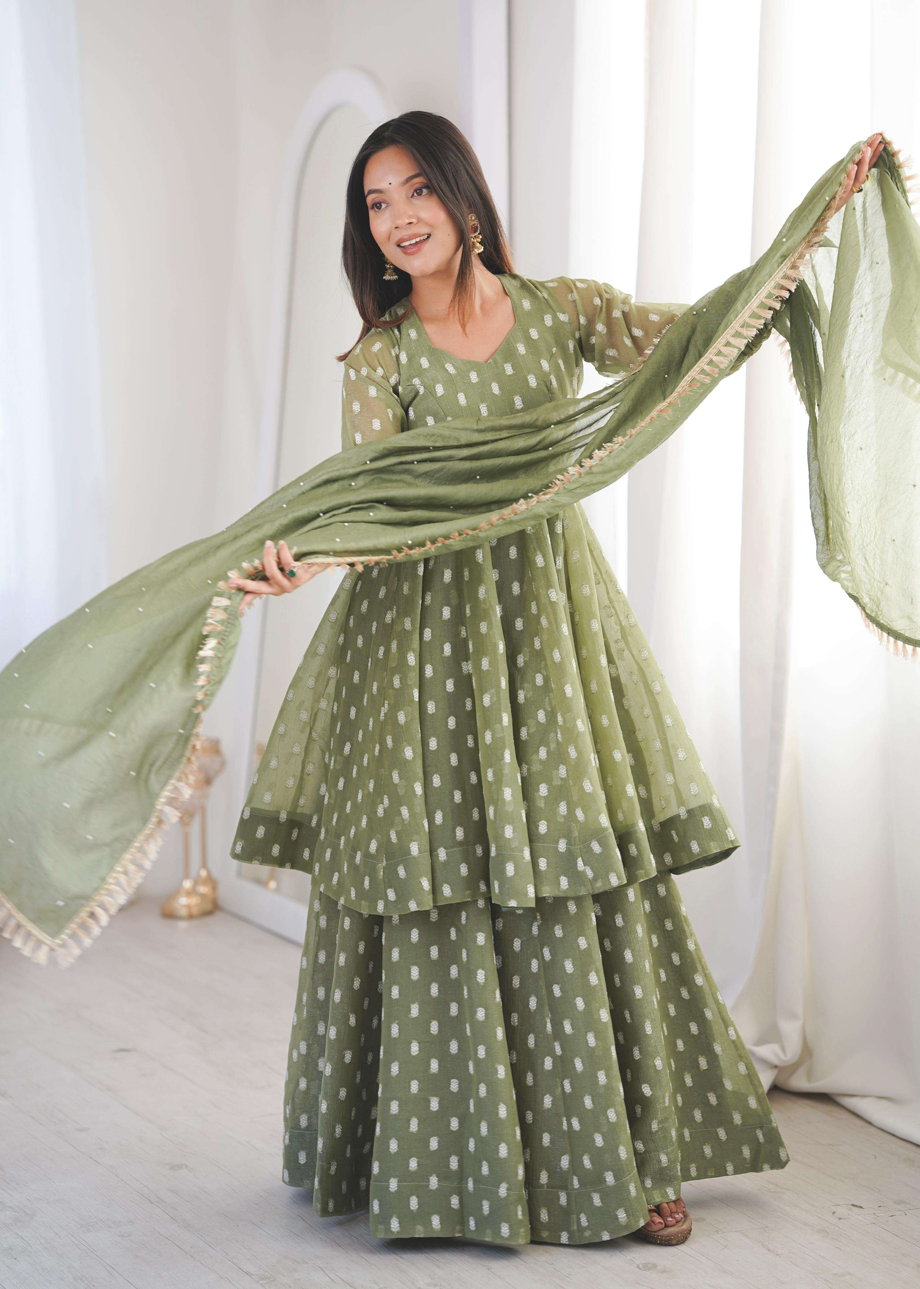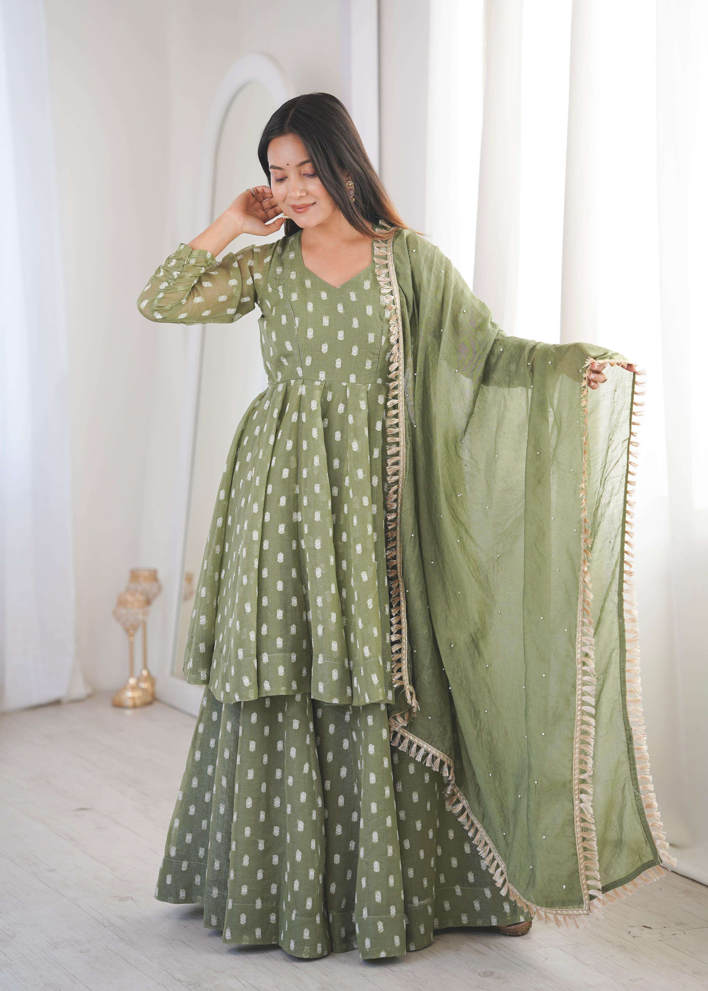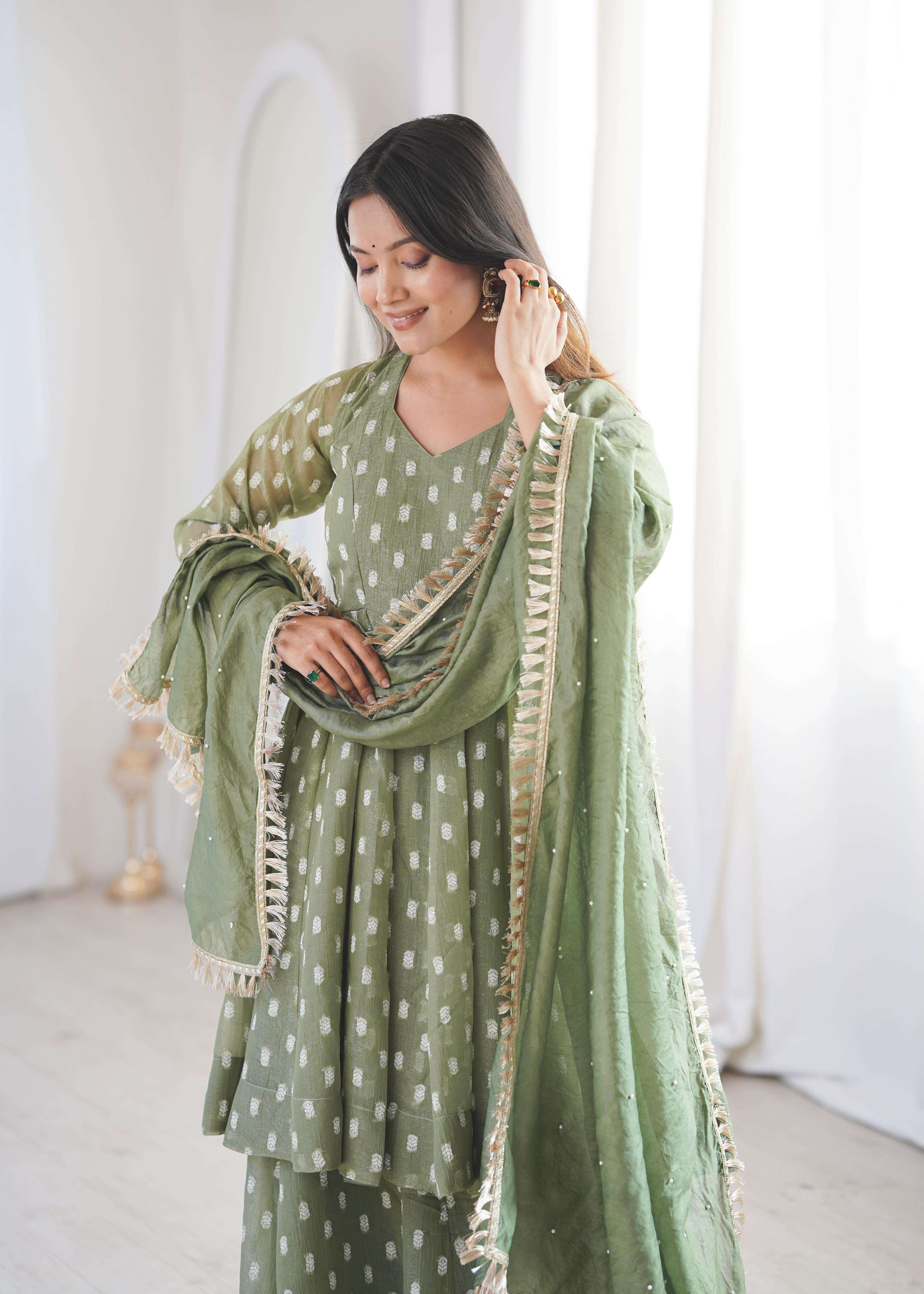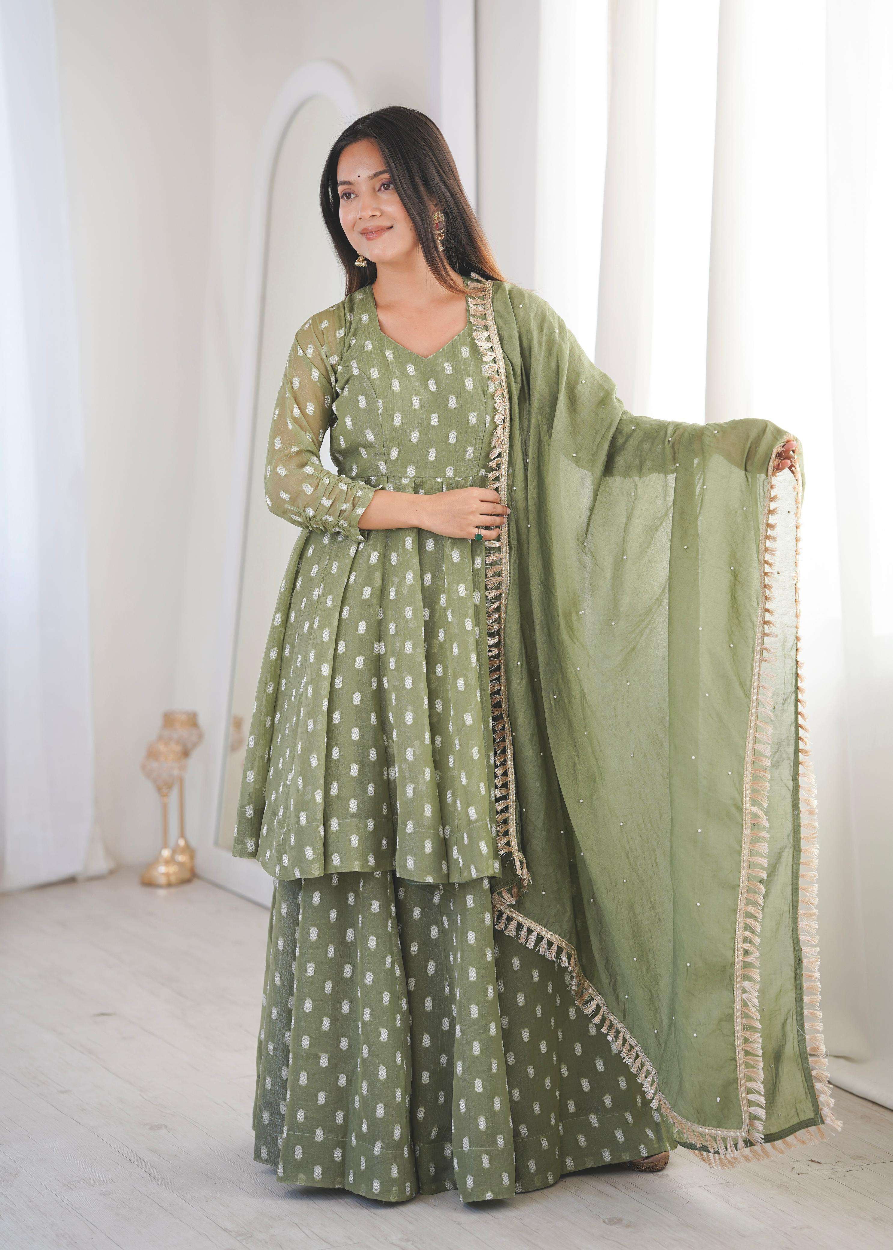 👖 *BOTTOM (Sharara Plazzo):* • *Fabric:* *Heavy Crunchy Silk With Jacquard Butty* • *Length:* 39-40 inches