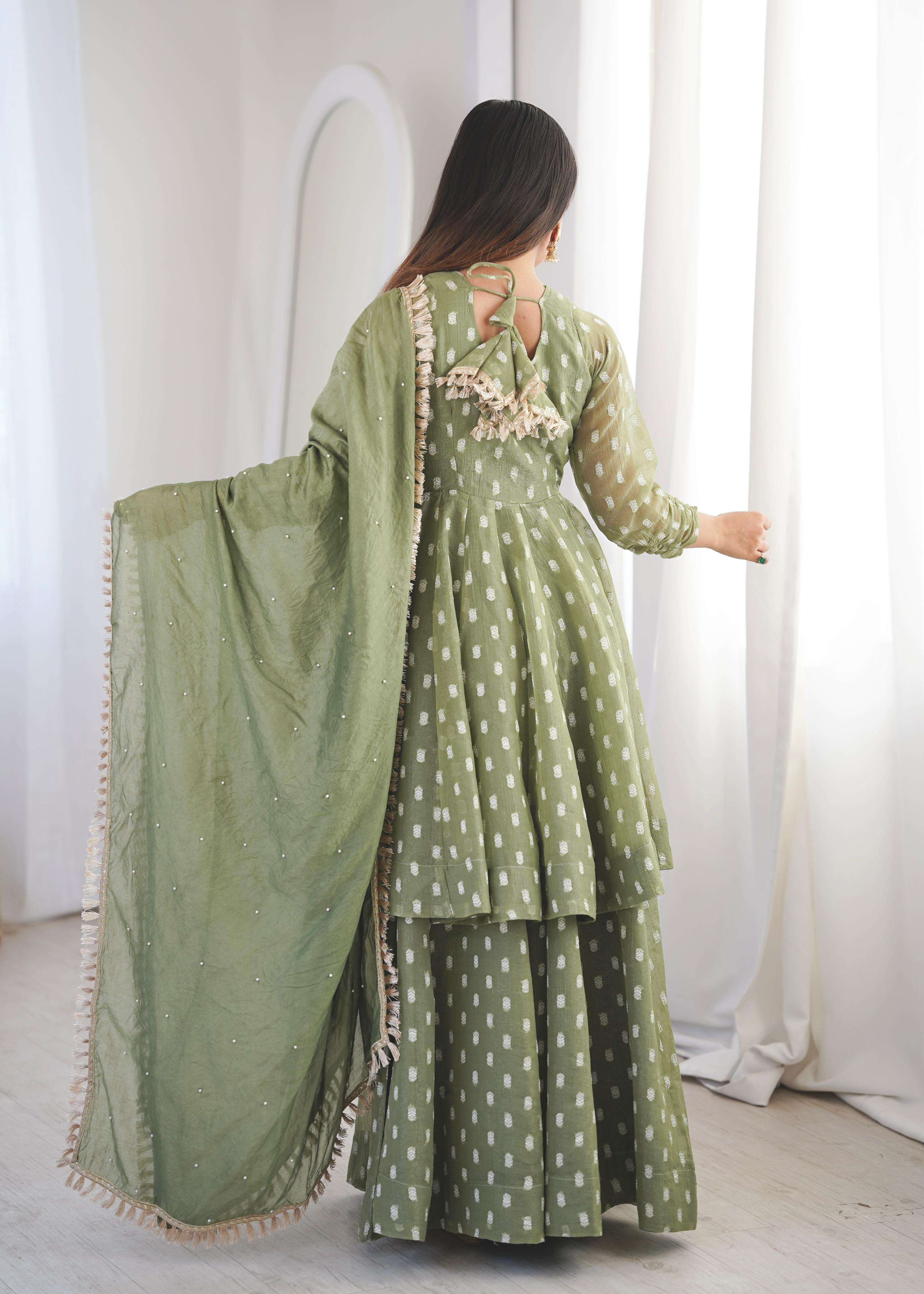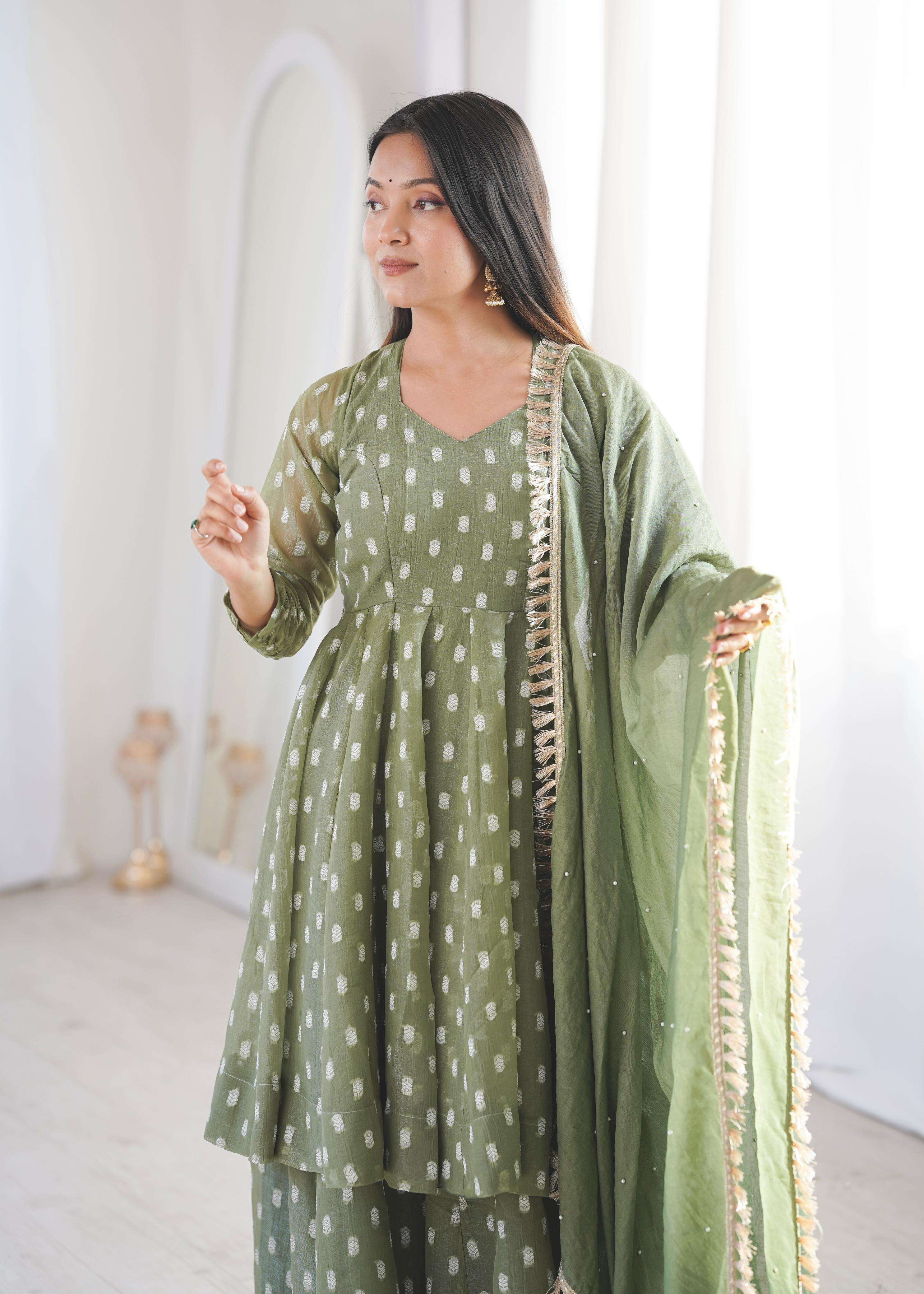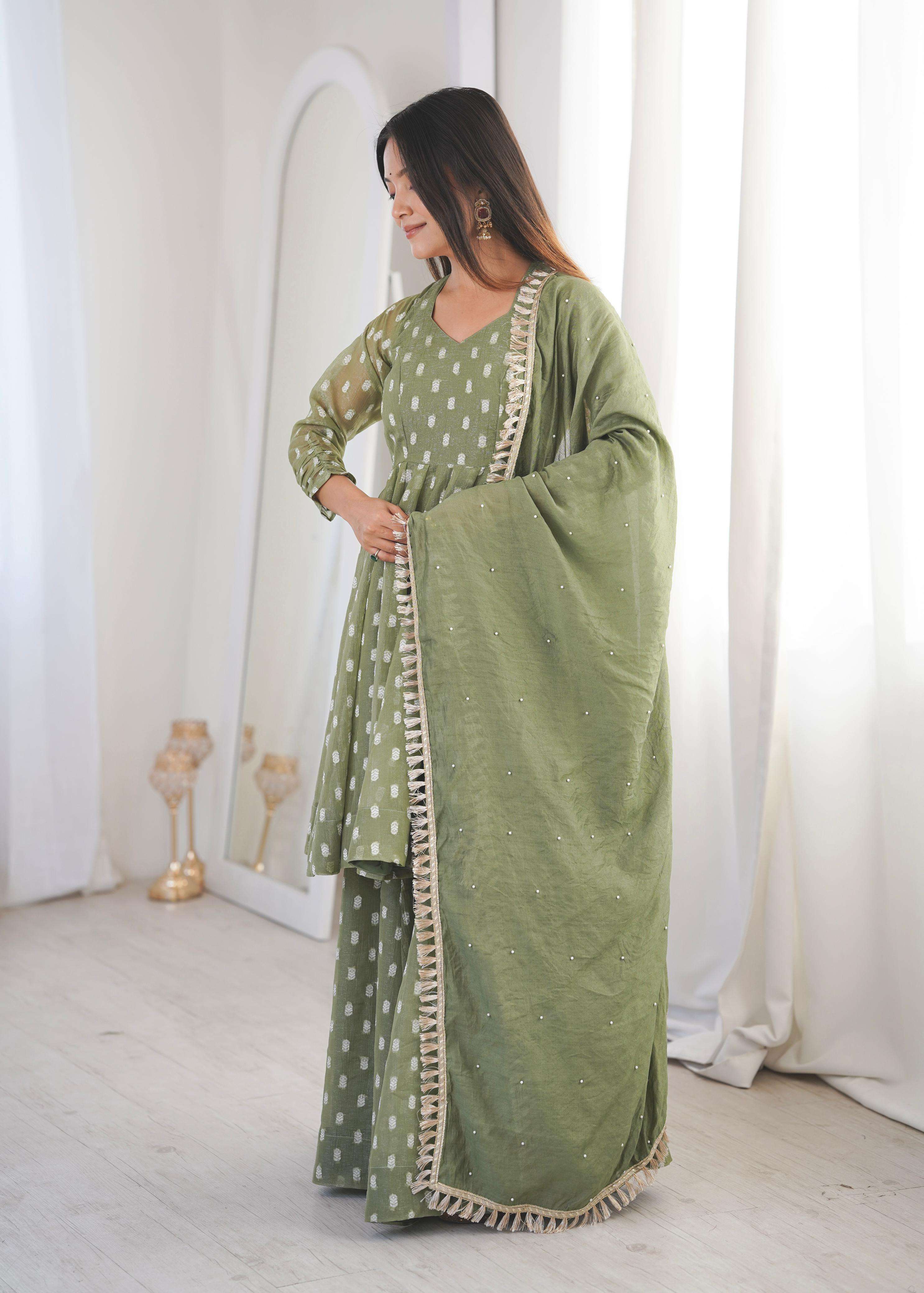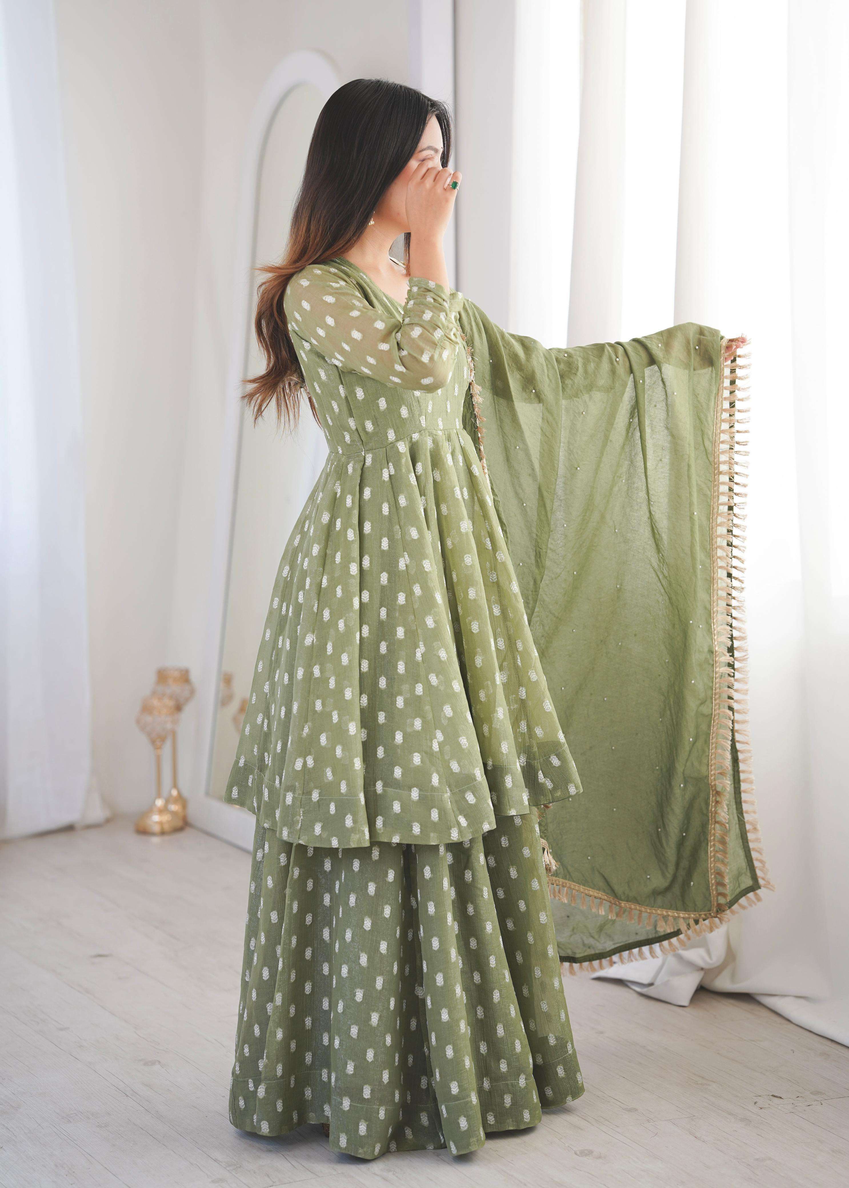 👖 *BOTTOM (Sharara Plazzo):* • *Fabric:* *Heavy Crunchy Silk With Jacquard Butty* • *Length:* 39-40 inches