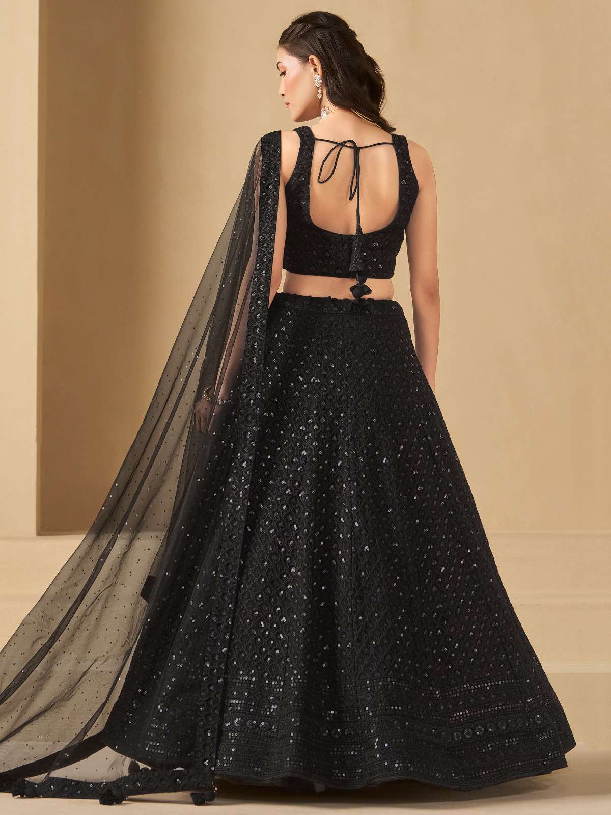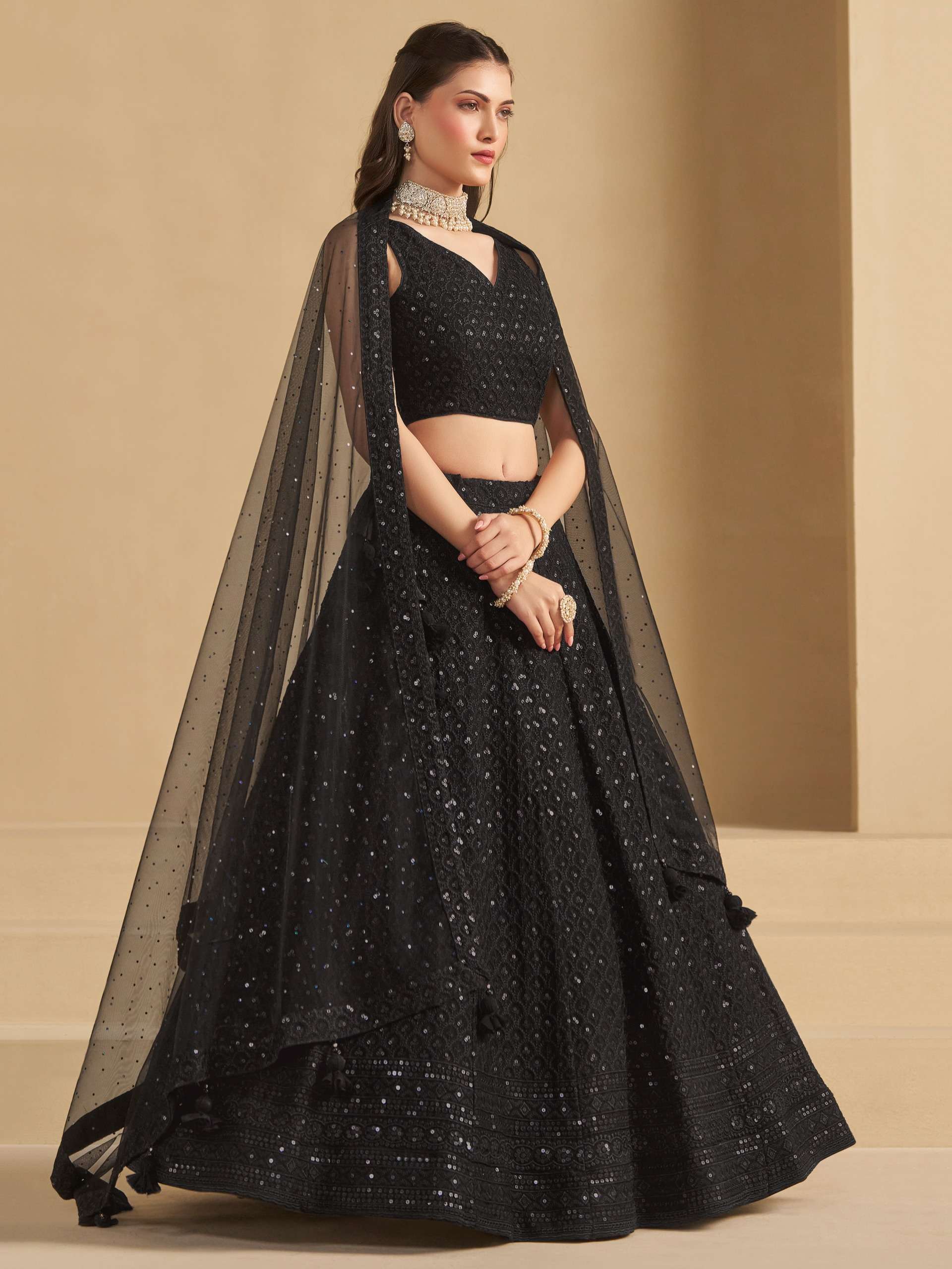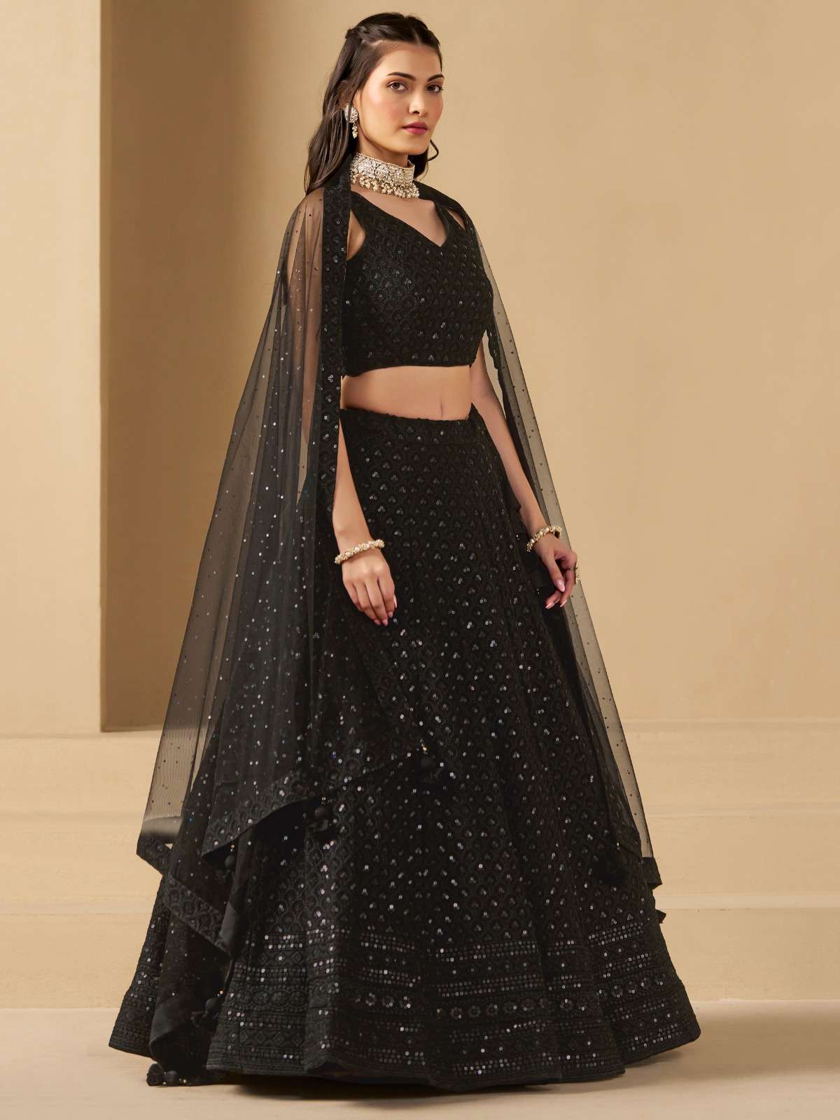 Turn heads in this captivating black georgette lehenga choli, beautifully designed with sequins and thread embroidery. The monochrome look adds elegance, perfect for parties and festive occasions.