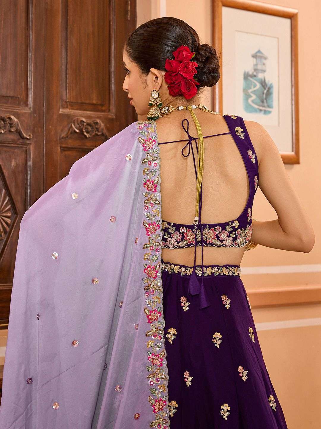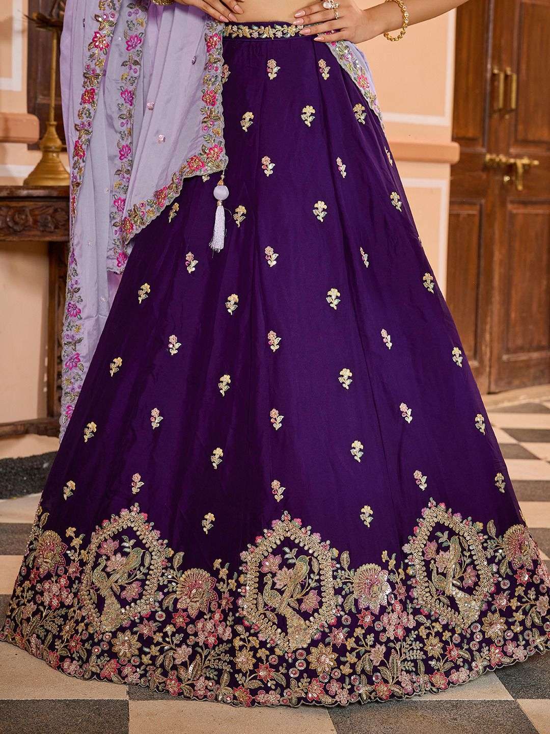 👗 Lehenga (Semi-Stitched) • Fabric: Premium Georgette • Color: Rich Purple • Work: Heavy Sequin, Mirror, Coding & Thread Embroidery with Cutwork Border • Flair: 3.5 Meters (Full Flair) • Inner: Double Shantoon with 18-inch Can Can (2 Layers of Buckram – 5” & 10”) • Waist: Customizable up to 40 inches • Length: 42 inches
