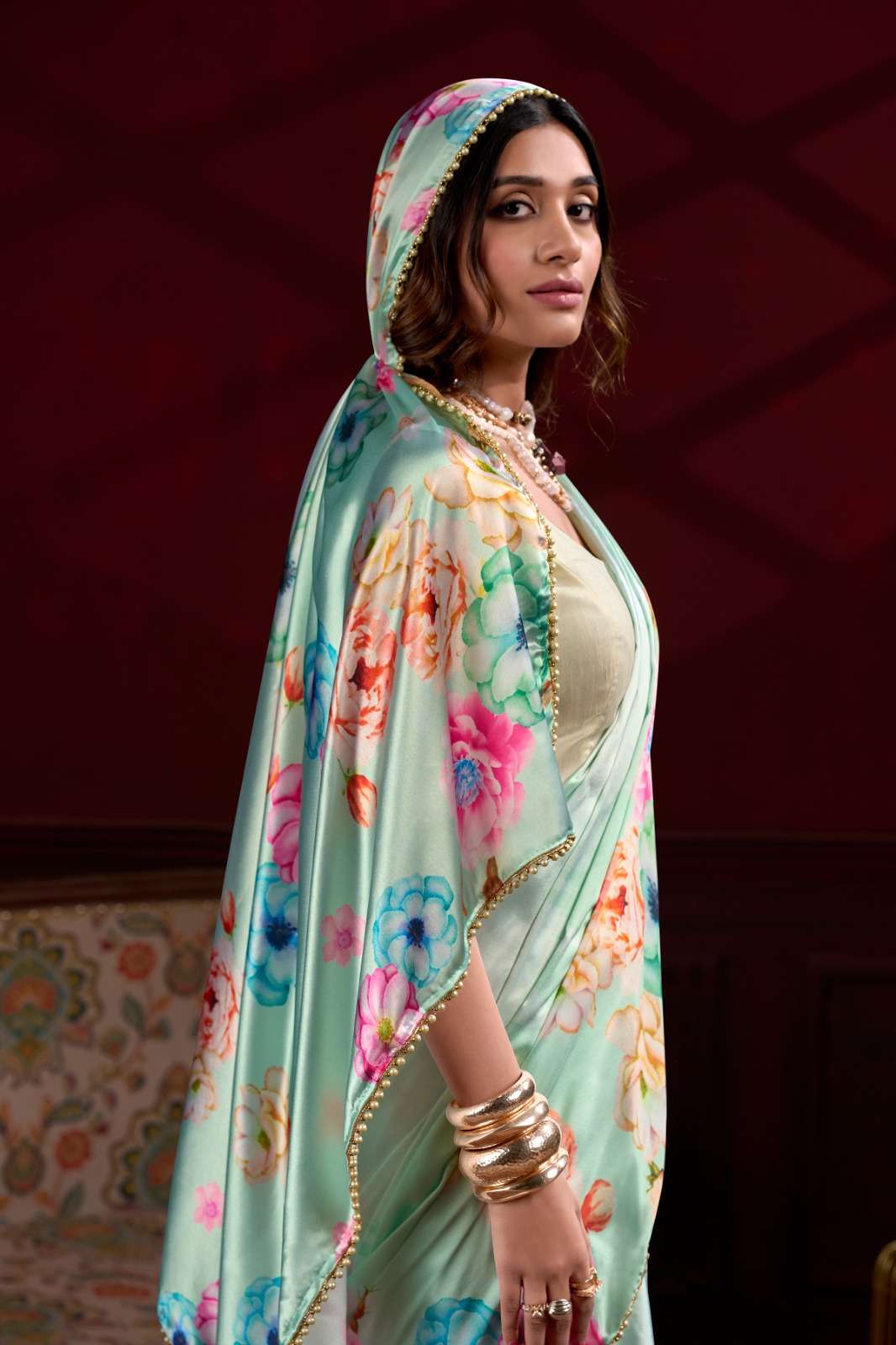 *Saree* Saree Fabric : Satin Silk Saree Work : Floral Print With Pearl Lace Border Saree Length : 5.5 meter