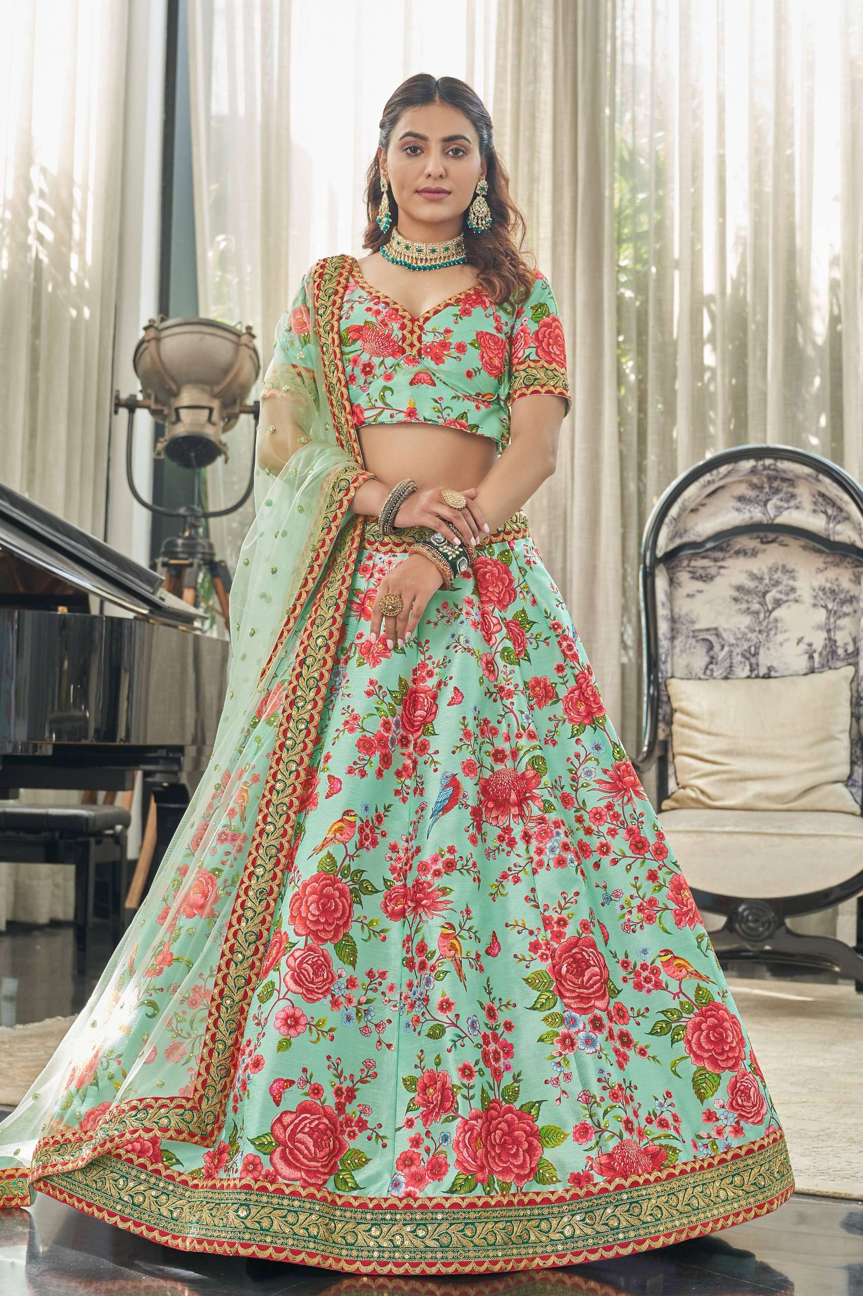 *Lehenga:* Exude signature classy ambiance adorning this mint green base with red color florals lehenga framed of art silk material and beautifully crafted with digital print work all over, decorated by a heavy lace border including dori, sequins, and stonework embellished, which creates a lehenga looks gorgeous and scrumptious. This is sure to give you many everlasting moments of great style.