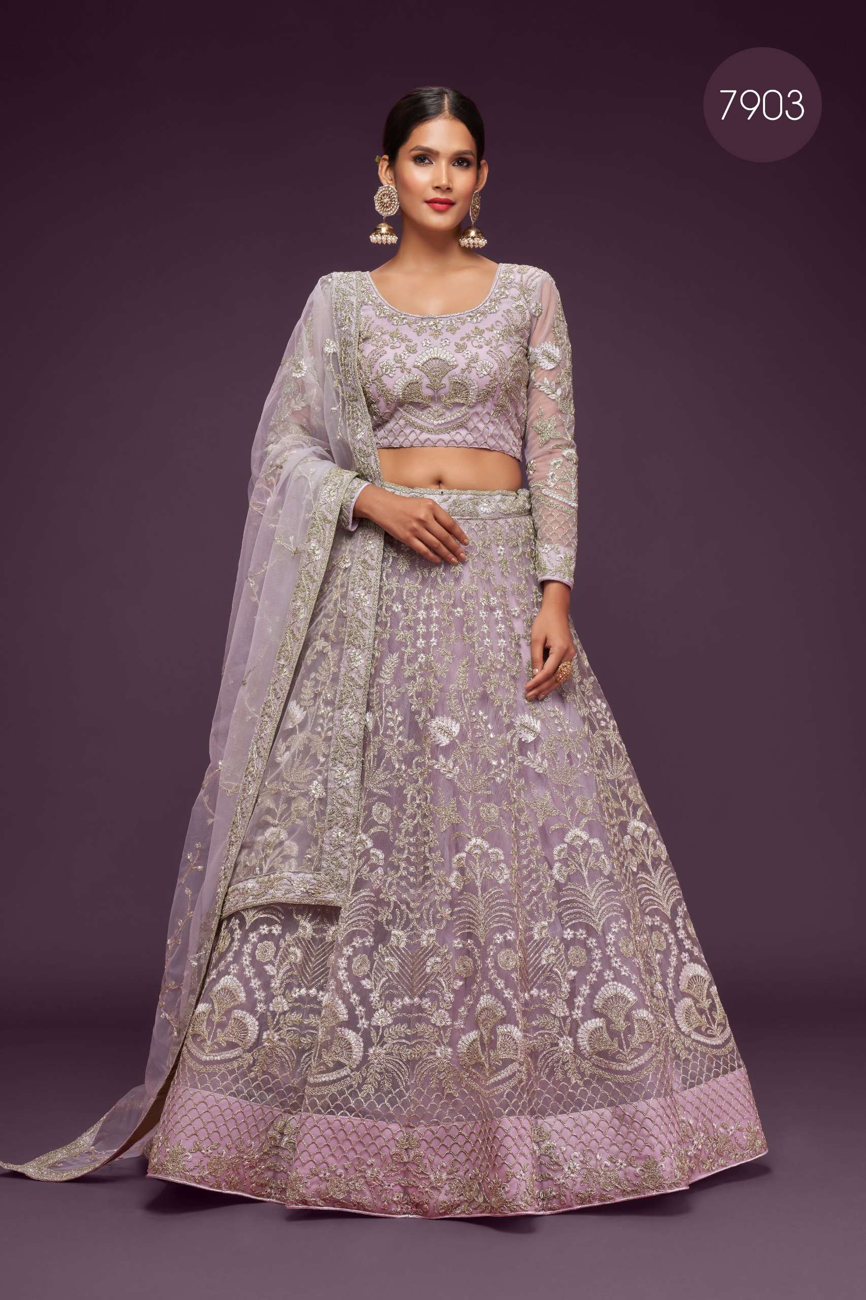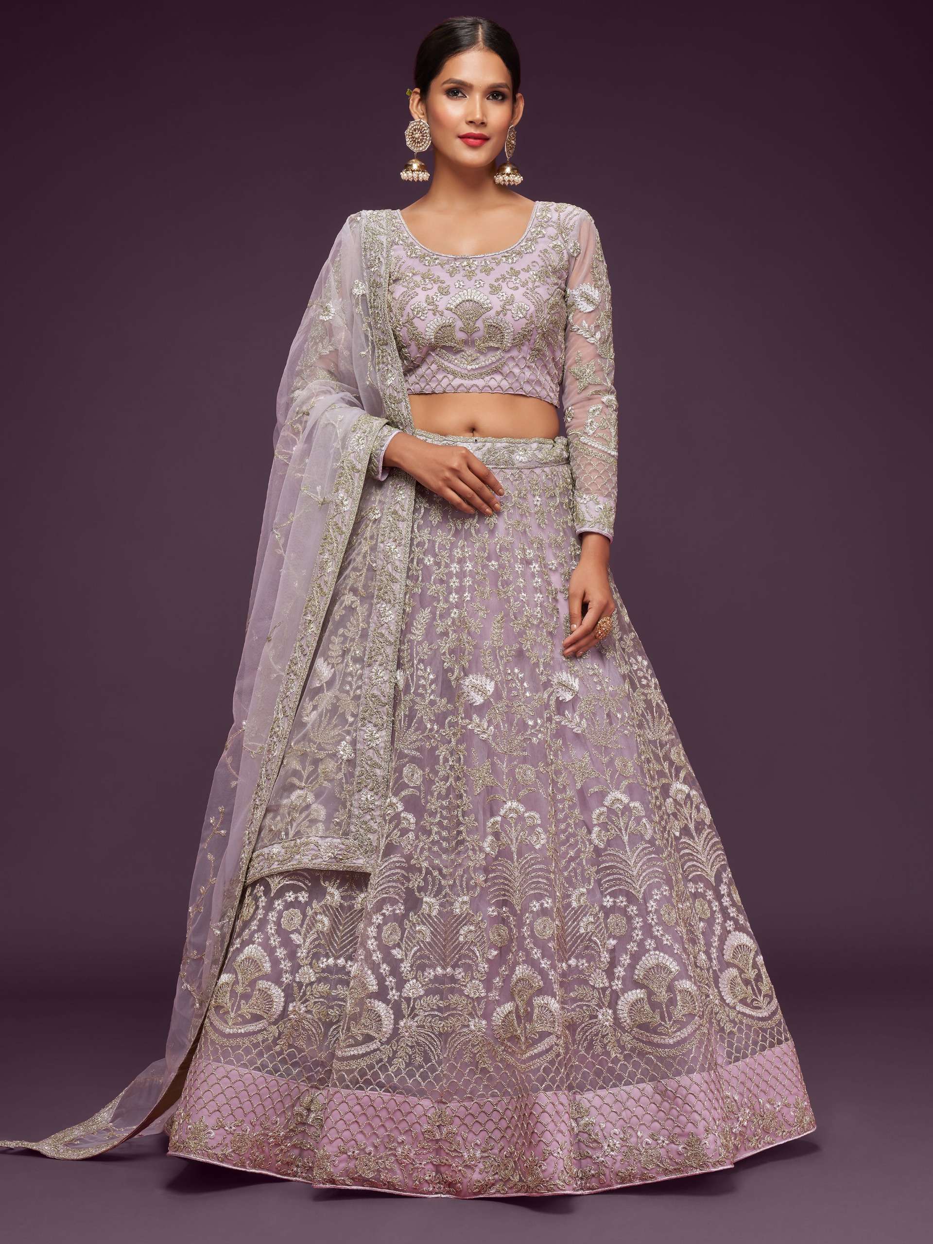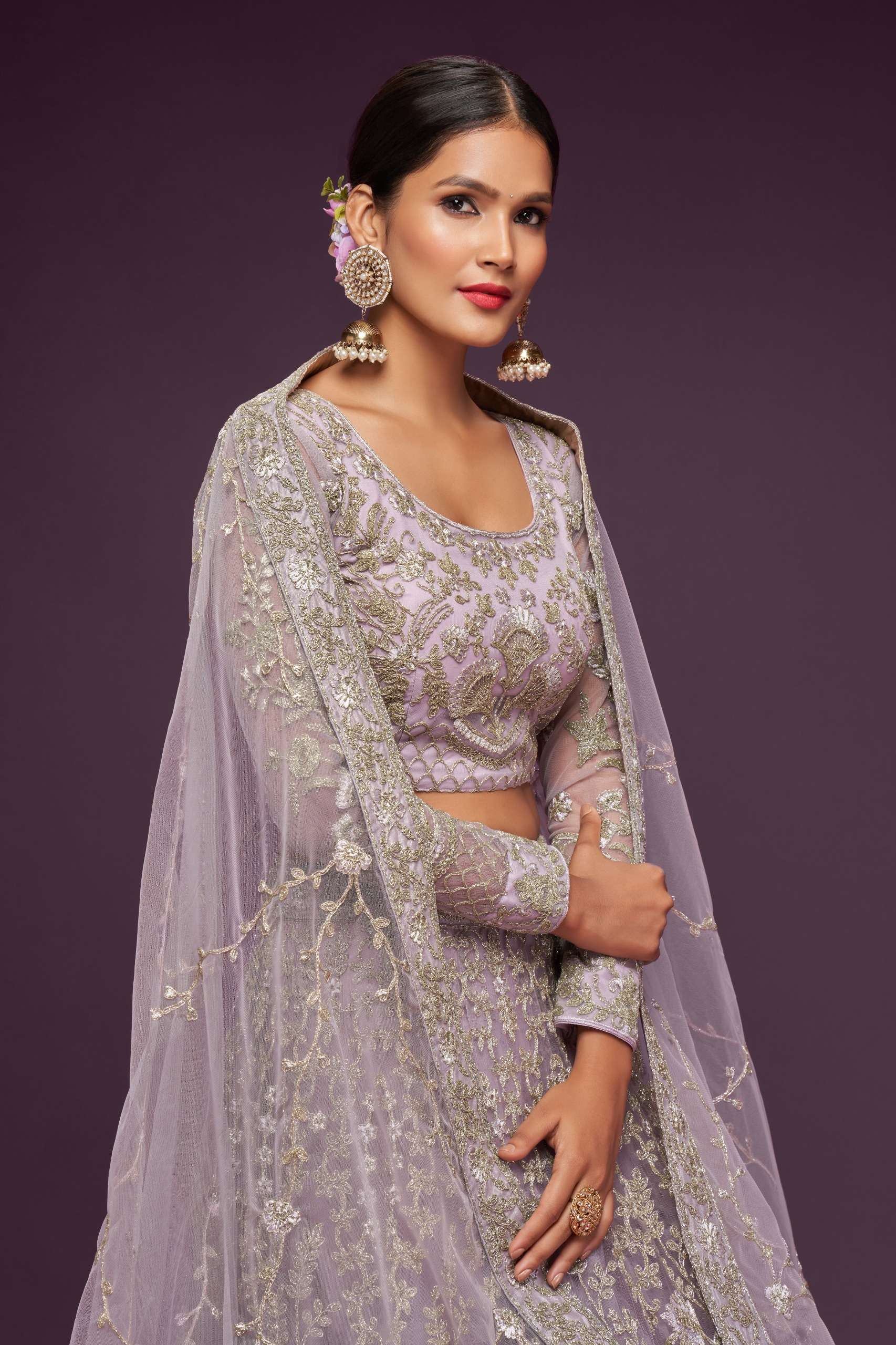 Sensible colors excellent designs and traditional moods are reflected with an alluring style. Attract compliments with this sweet lilac lehenga in soft net material embellished with thread, zari, badla, and glitter dori embroidery work.