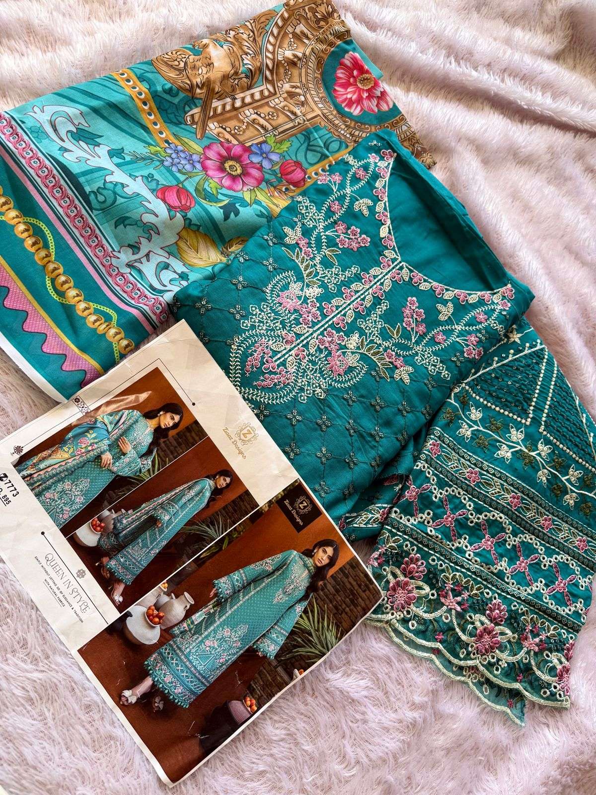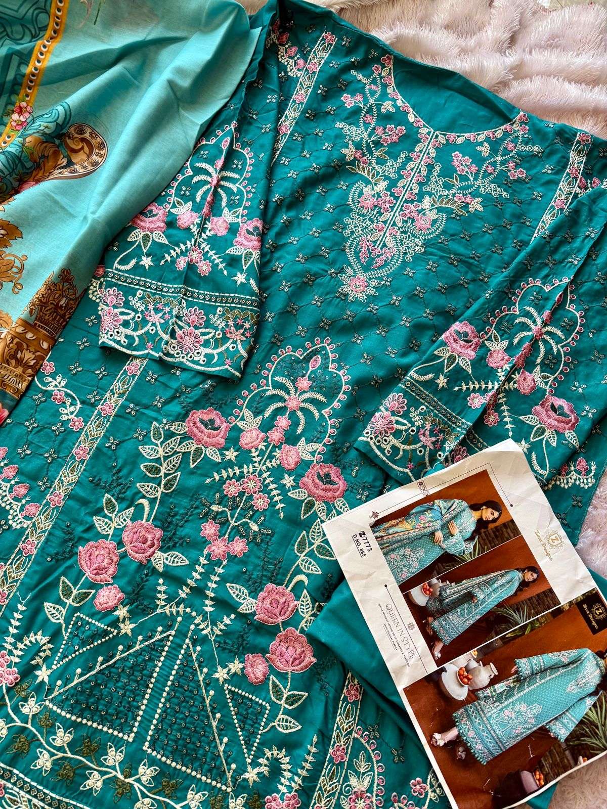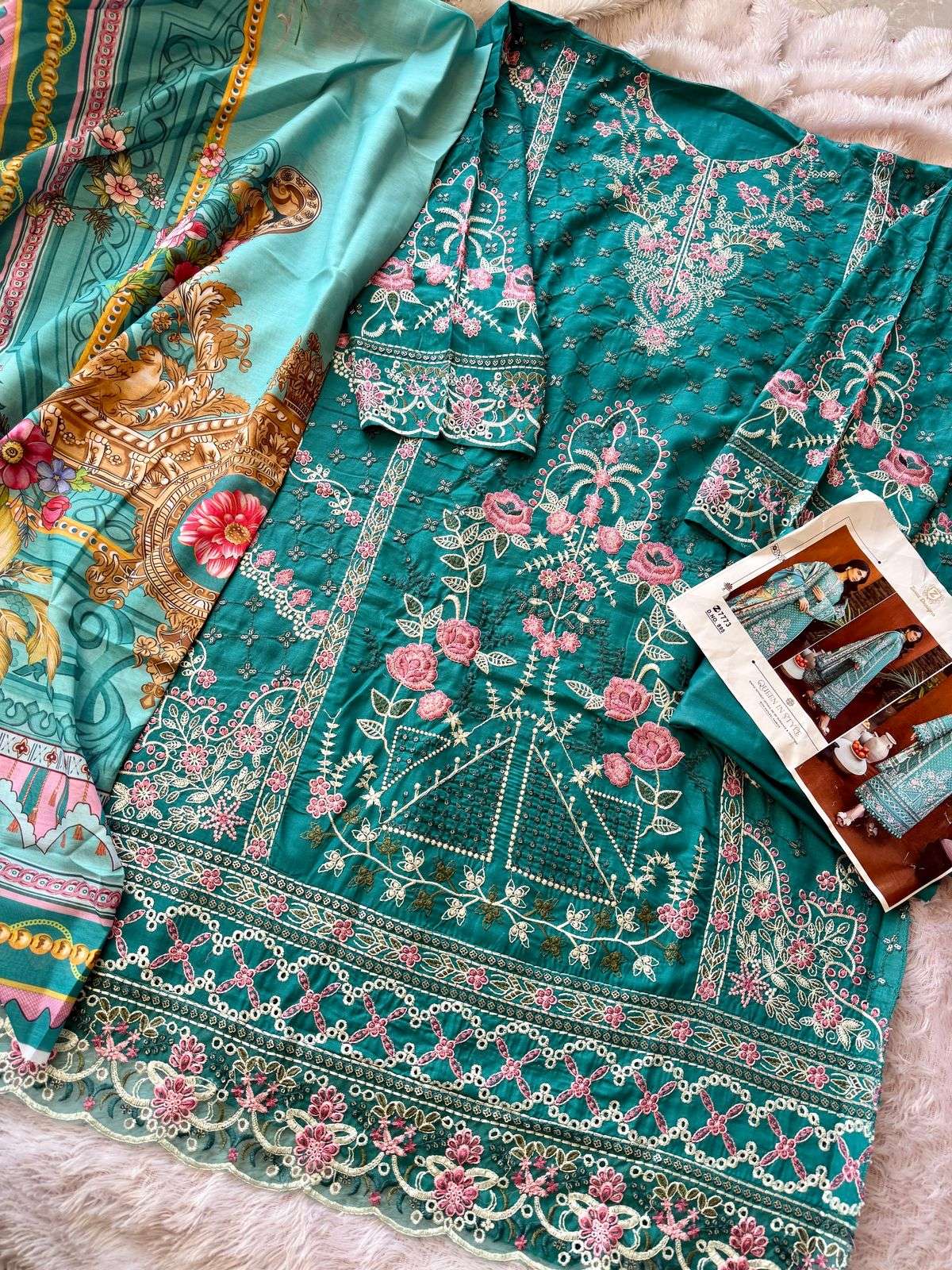 cambric cotton semi stitched very heavy embrdrd kameez and cotton unstitched bottoms with Muslin lawn digital print dupatta