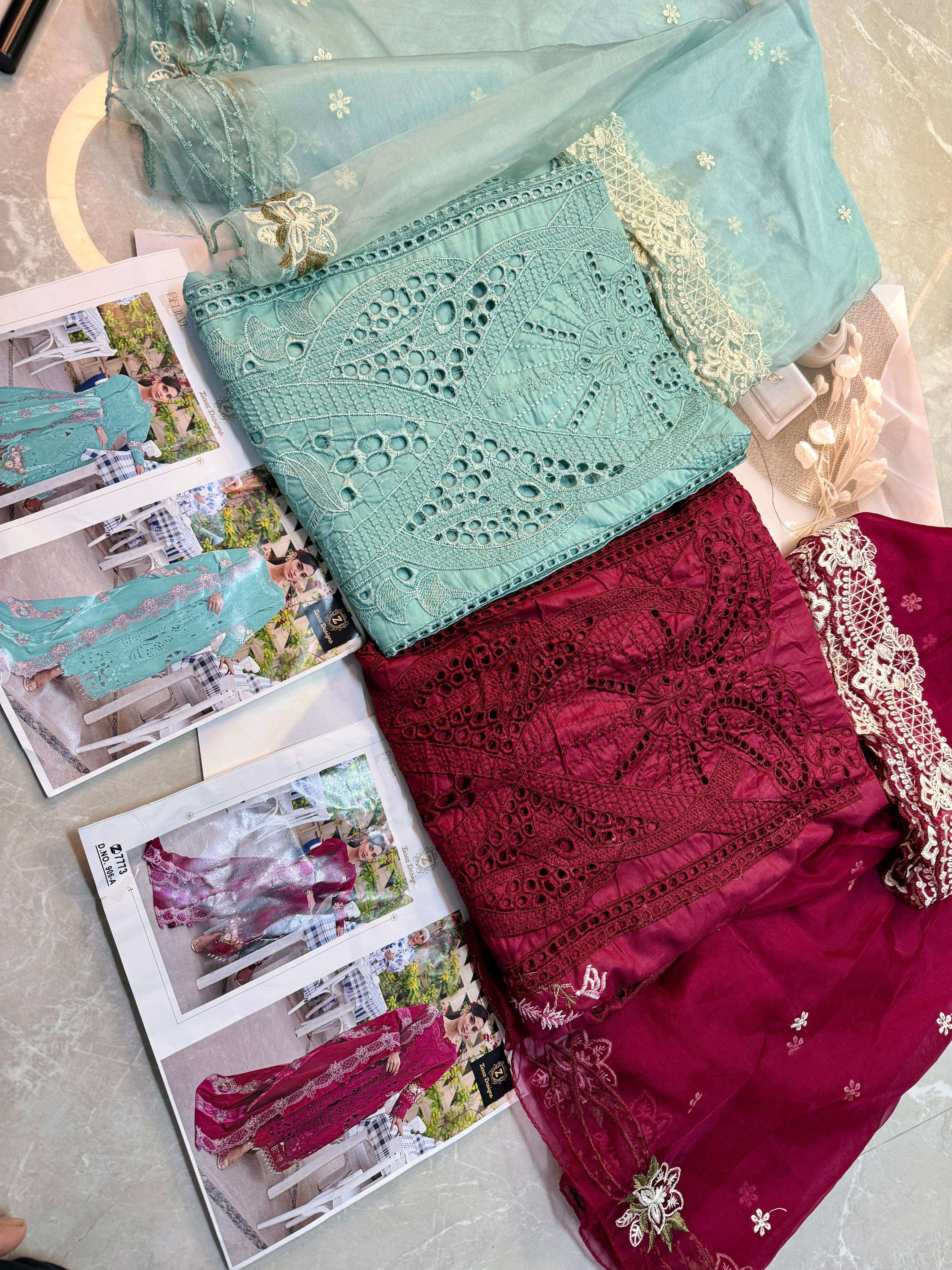 cambric cotton semi stitched very heavy embrdrd kameez and cotton unstitched bottoms with Organza Embroidered dupatta
