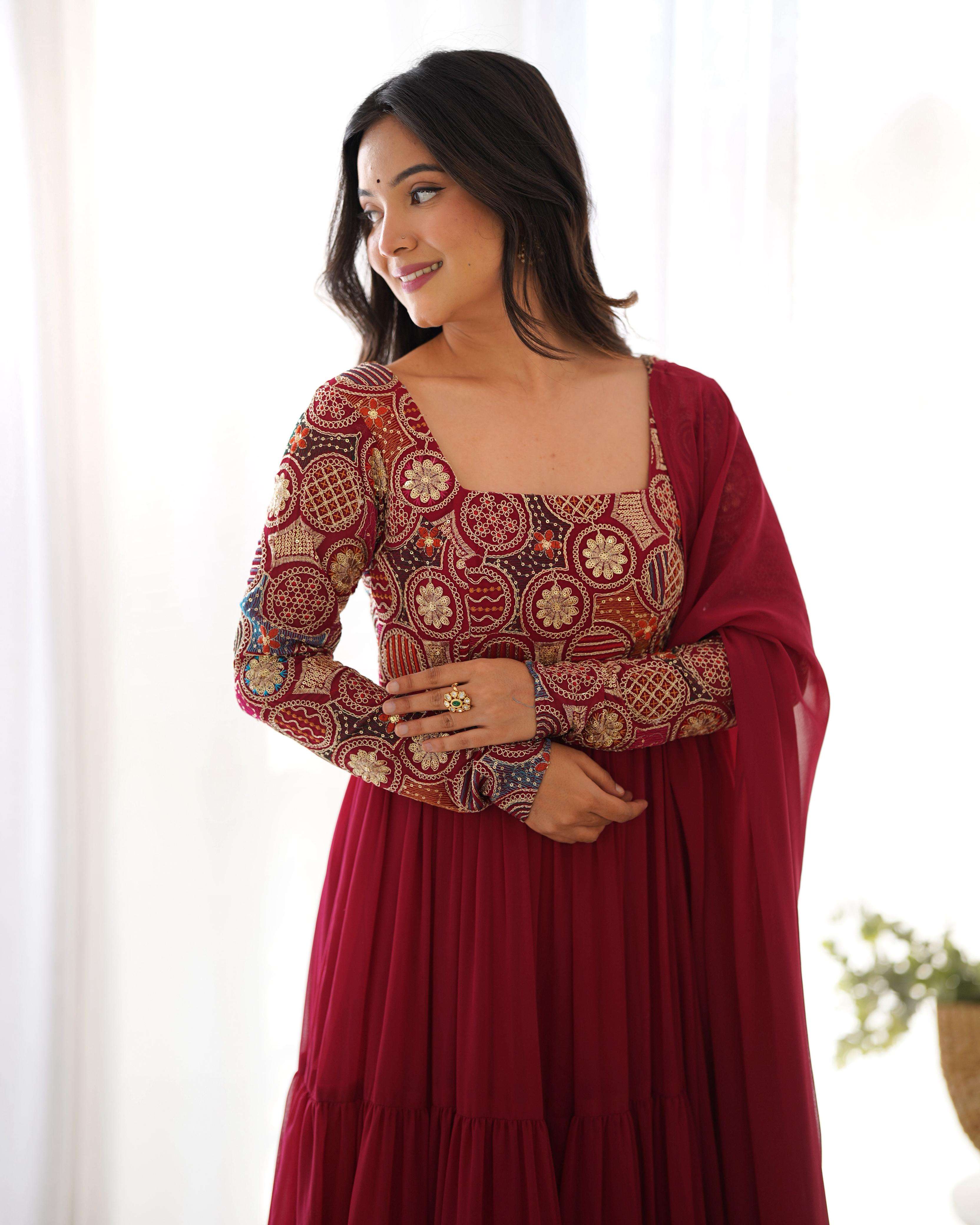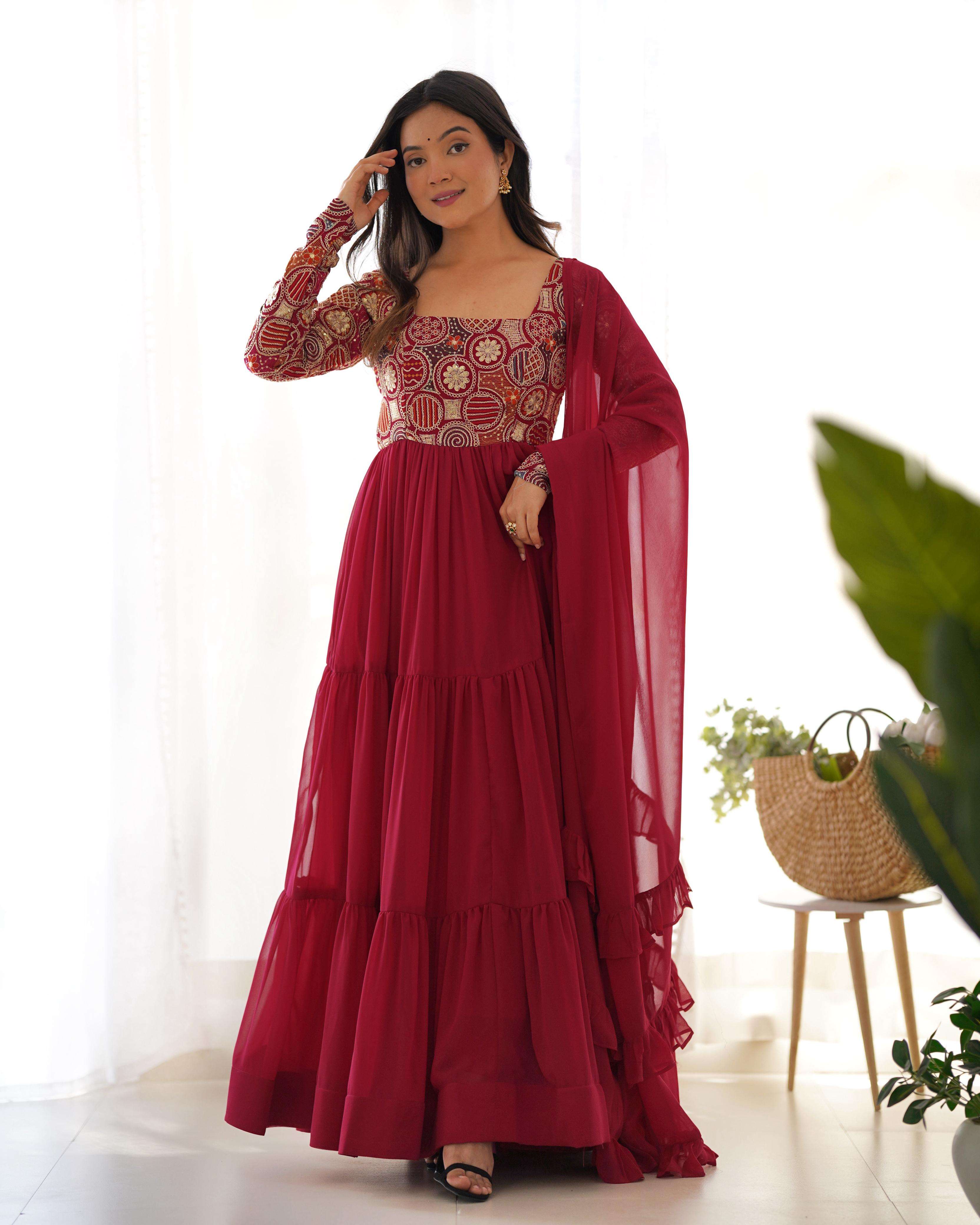 *FANCY EMBROIDERY 9 NEEDLE THREAD WORK,YOKE WORK,FULL CHURIDAR SLEEVES,PADDED,SIDE ZIPPER,THREE LAYER GATHERING WITH CANVAS PATTA FULLY FLARE*