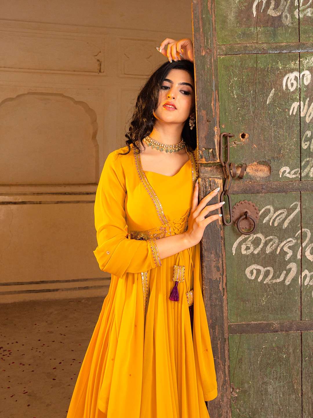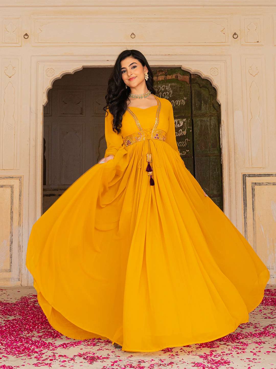 *👗 GOWN DETAILS:* * Fabric & Work: Georgette with Zari & Thread Work ✨ * Sizes Available: XS(34"), S(36"), M(38"), L(40"), XL(42"), XXL(44") 📏 * Length: 56 Inches 📐 * Flair: 4 Meters 💃 * Lining: Full Micro Cotton Inner (Top to Bottom) 🧵 * Sleeves: Full Sleeves ✨ * Neck Style: Sweet-Heart Neck ❤️ * Stitching: Fully Stitched with Canvas Patta ✔️