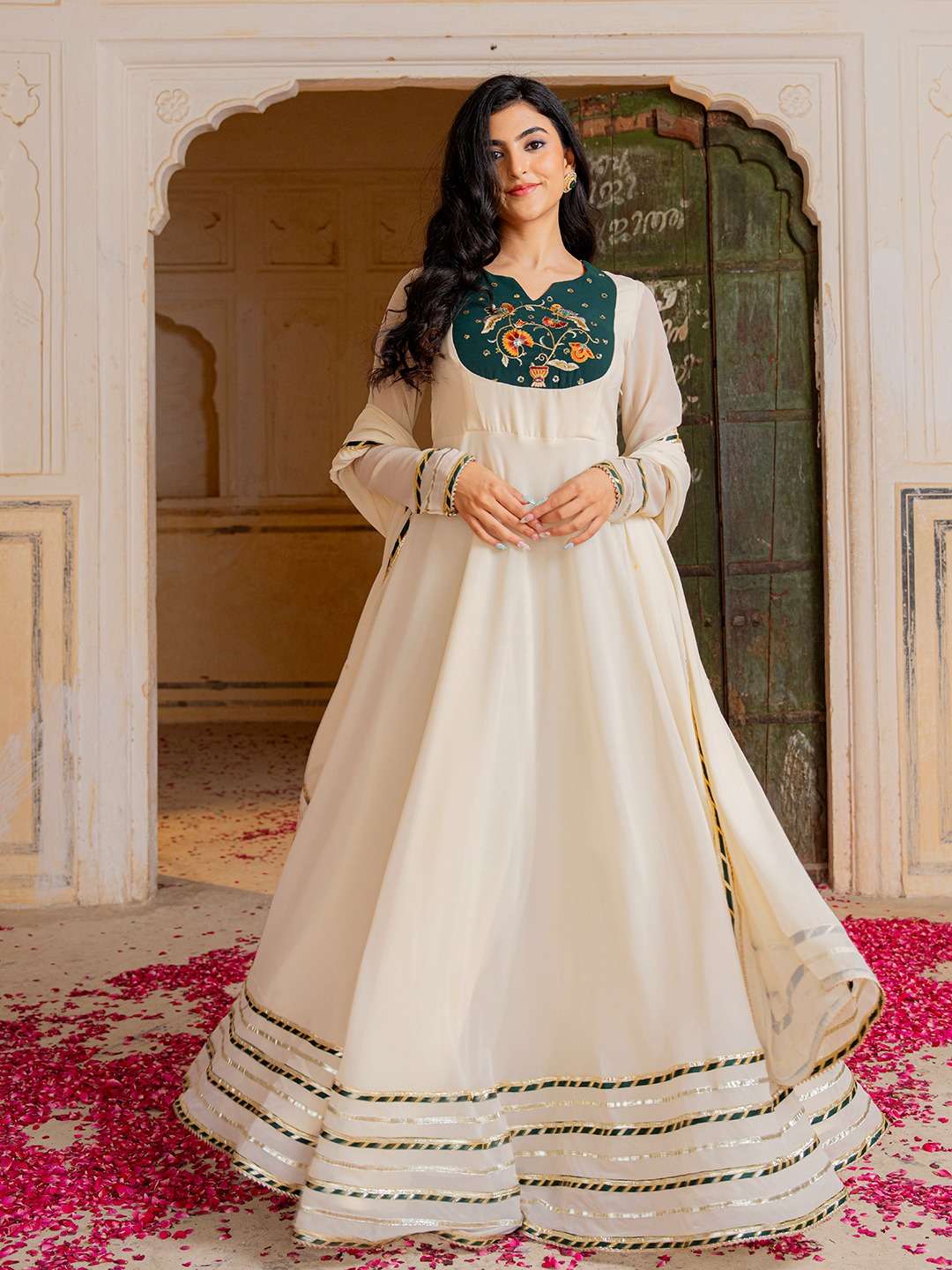 👗 *GOWN DETAILS* • *Fabric & Work:* Georgette Gown With Gota Work On Hem ✨ • *Sizes:* XS(34"), S(36"), M(38"), L(40"), XL(42"), XXL(44") 📏 • *Length:* 56 Inches 📐 • *Flair:* 4.5 Meters 💃 • *Lining:* Full Micro Cotton Inner (Top to Bottom) 🧵 • *Sleeves:* Long Sleeves ✨ • *Neck Style:* Round Neck ❤️ • *Stitching:* Fully Stitched ✔️