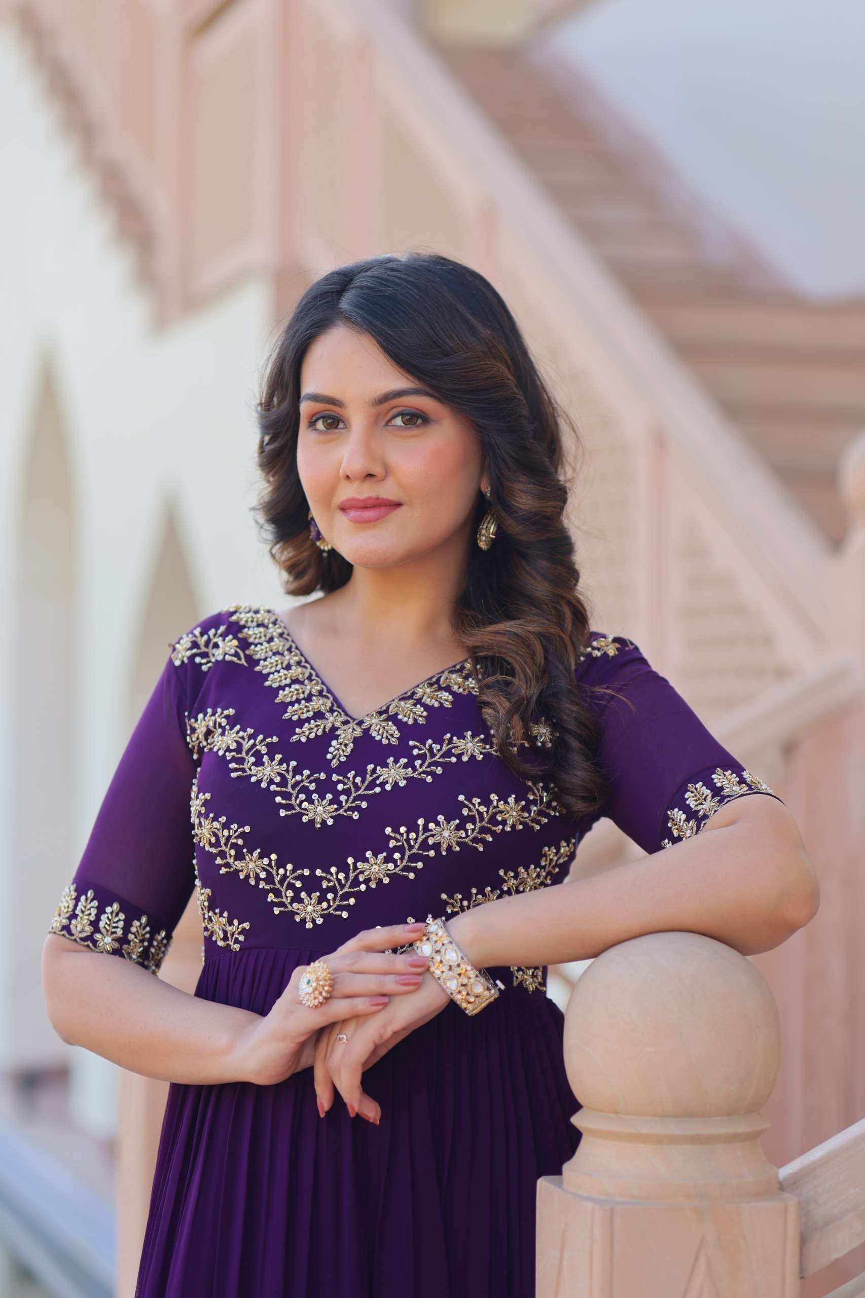 👉🏻 GOWN :- 👇 👉🏻 FABRIC & WORK :- Faux Blooming With Sequins Multithreaded Beads Embroidered work.