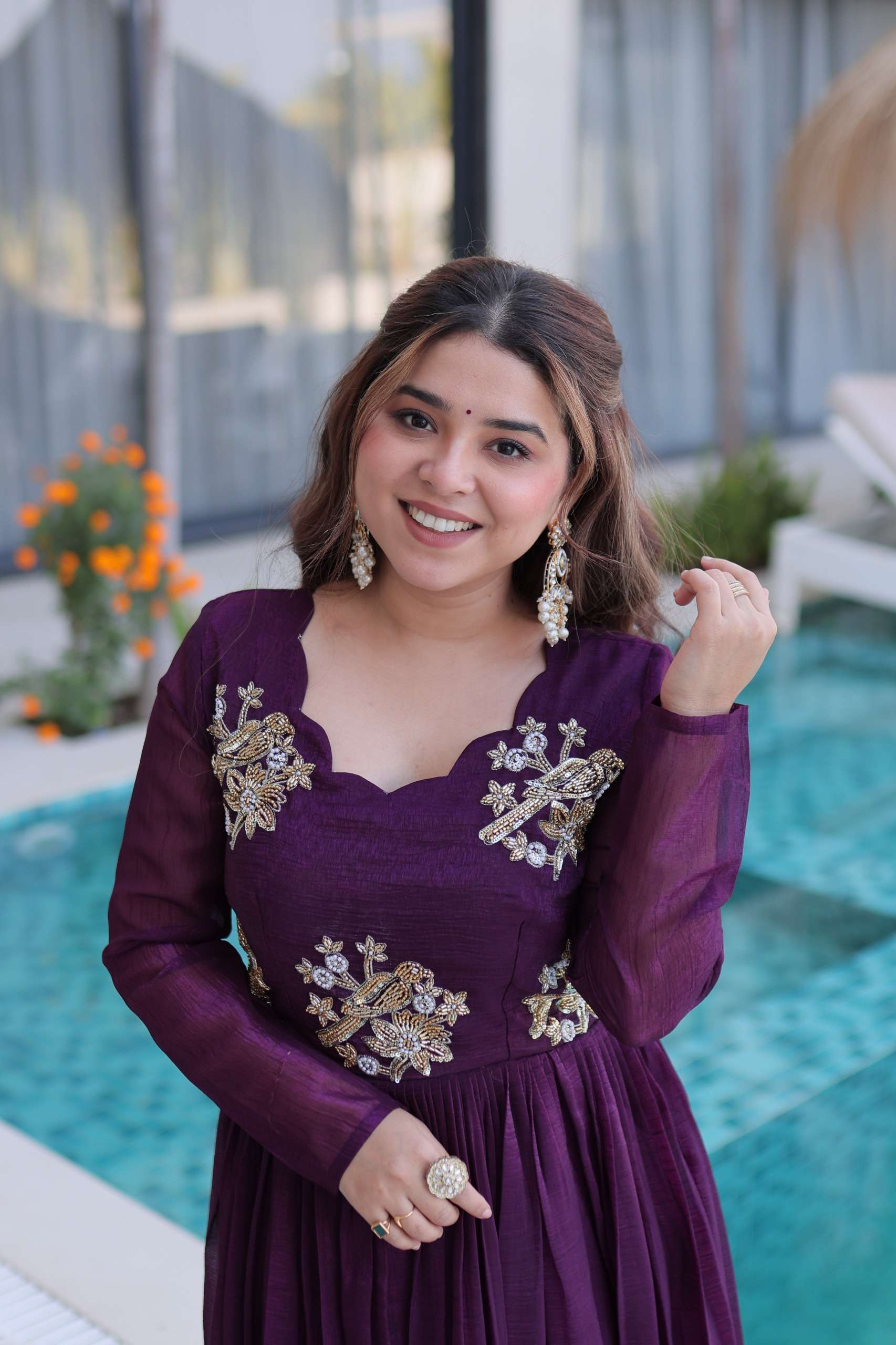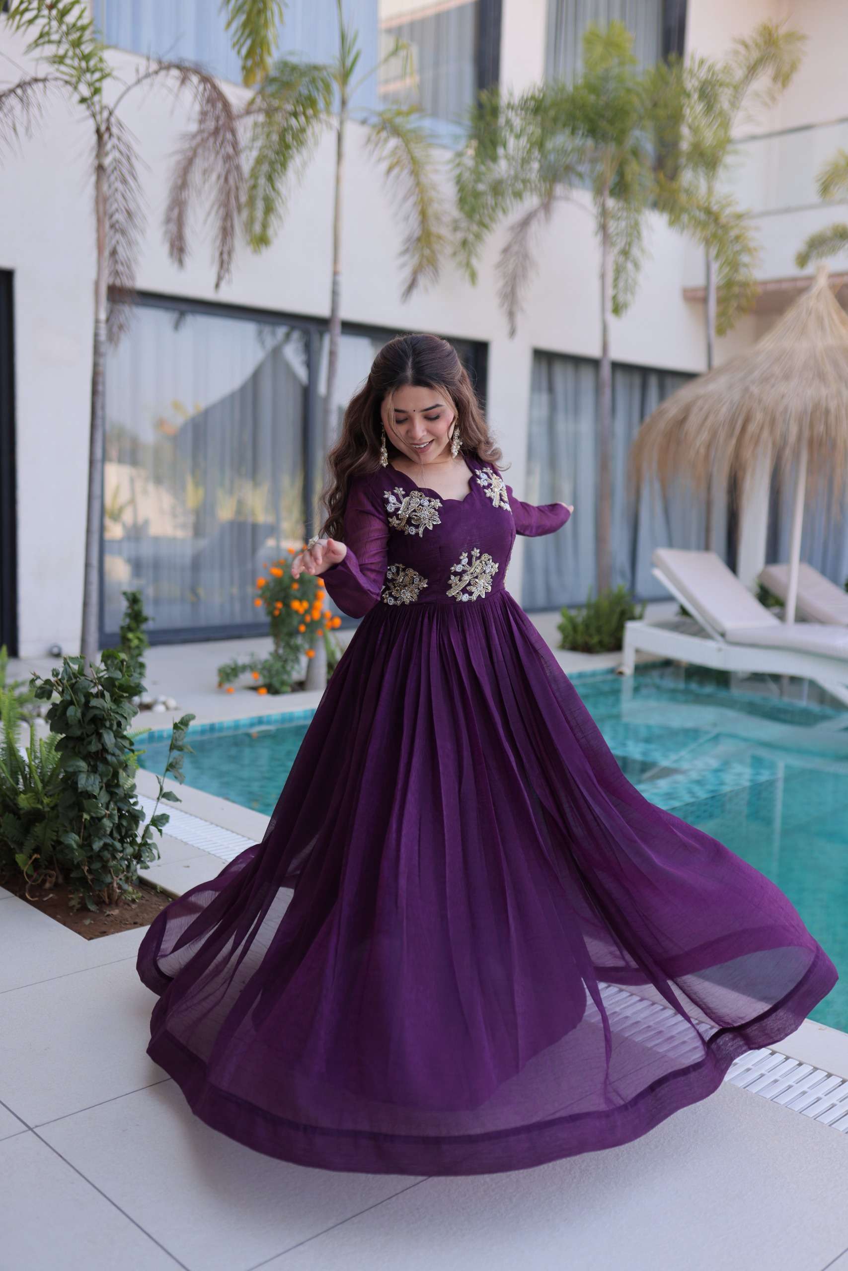 👉🏻 *GOWN :-* 👇🏻 👉🏻 *FABRICS & Work :* Silver Crunchy with Beads embroidery-work 👉🏻 *SLEEVES :-* Long Sleeves 👉🏻 *LENGTH :-* 56 Length 👉🏻 *LINING(Inner) :-* Cotton (full Inner) 👉🏻 *NECK :-* FancyRound Neck 👉🏻 *FLAIR :-* 3 Mtr 👉🏻 *STITCHING :-* Standard Stitching with Canvas Patta
