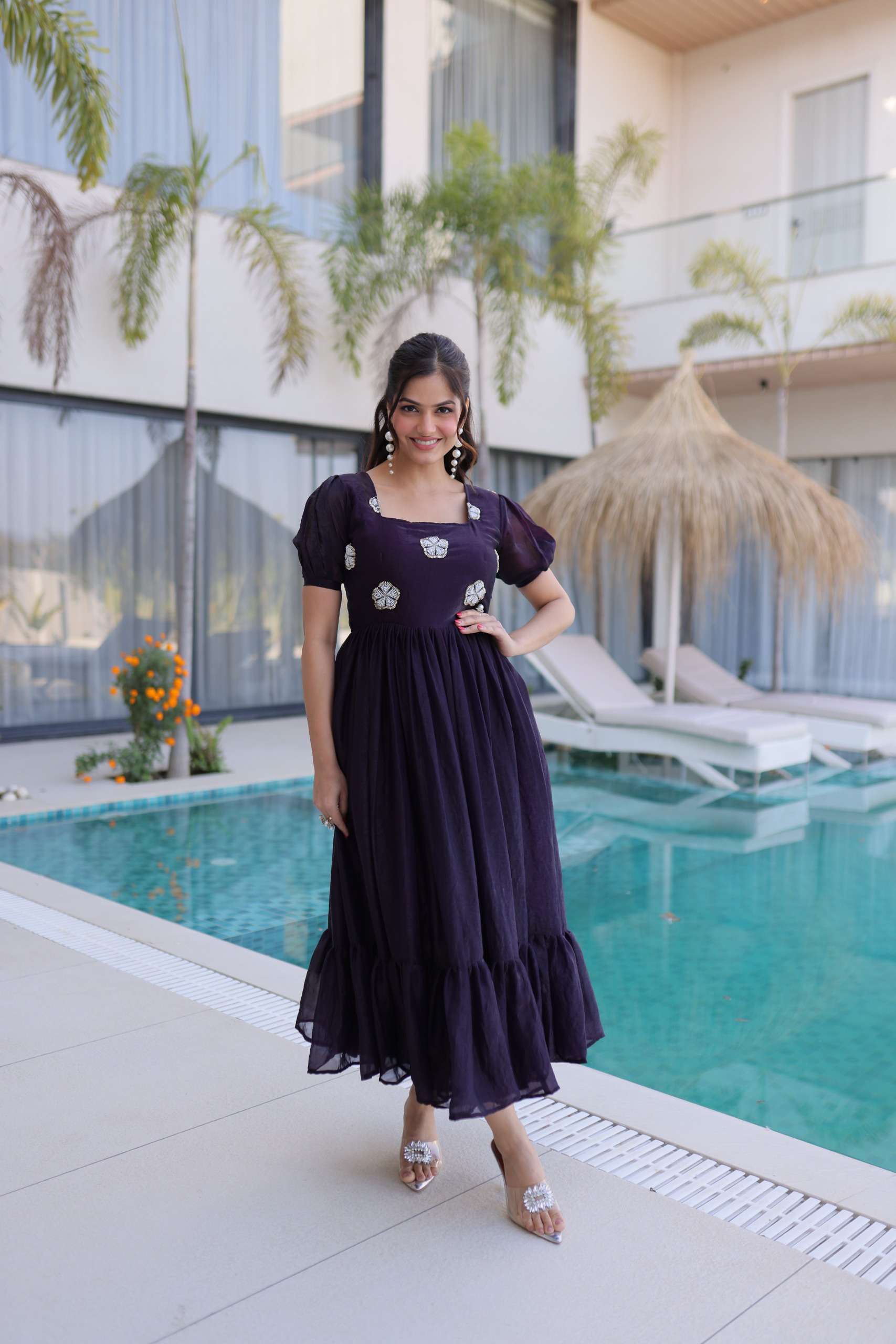 👉🏻 *LENGTH :-* 52 INCH 👉🏻 *FLAIR :-* 7 MTR 👉🏻 *LINING :-* Cotton (Full Inner Top To Bottom) 👉🏻 *SLEEVES :-* Balloon Style Short Sleeves 👉🏻 *STITCHING TYPE:-* Frill Stitch 👉🏻 *NECK TYPE :-* Square Neck
