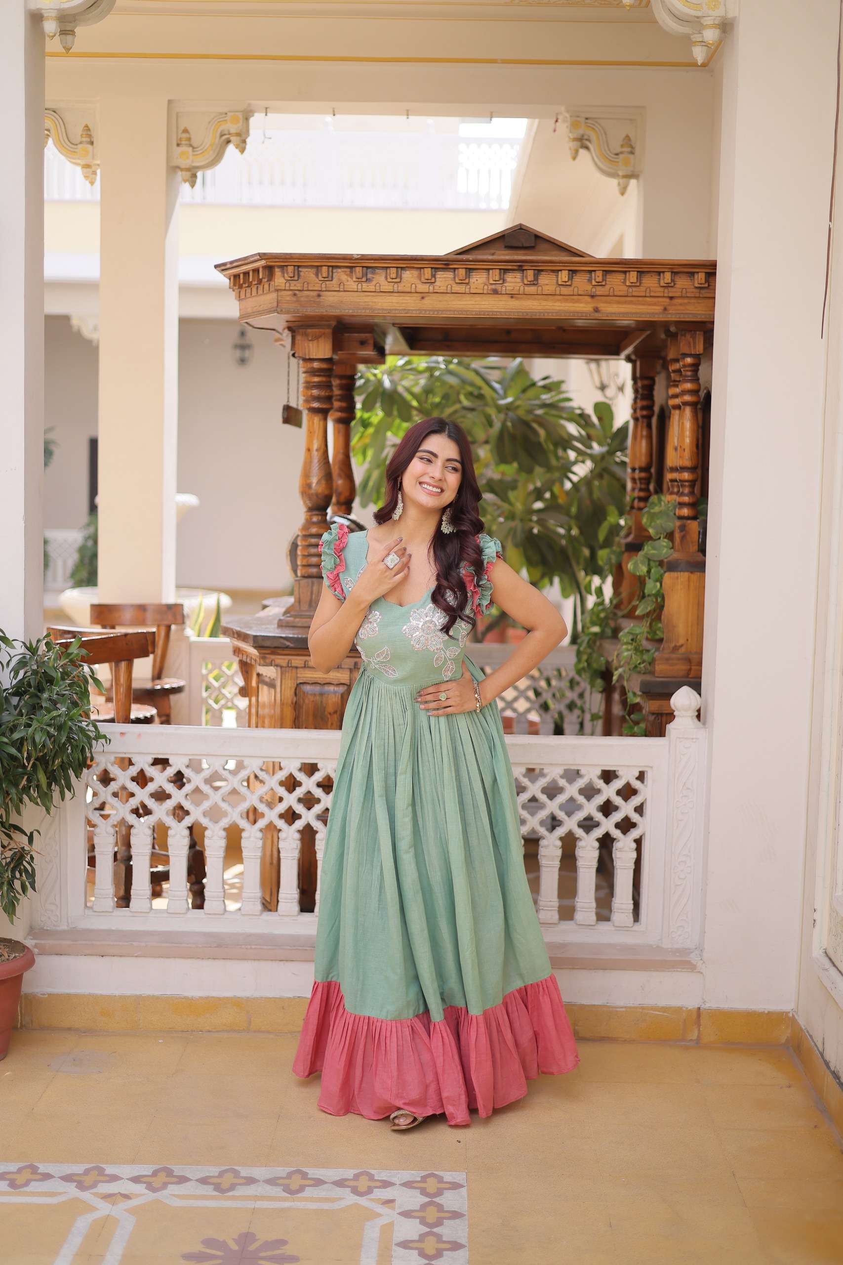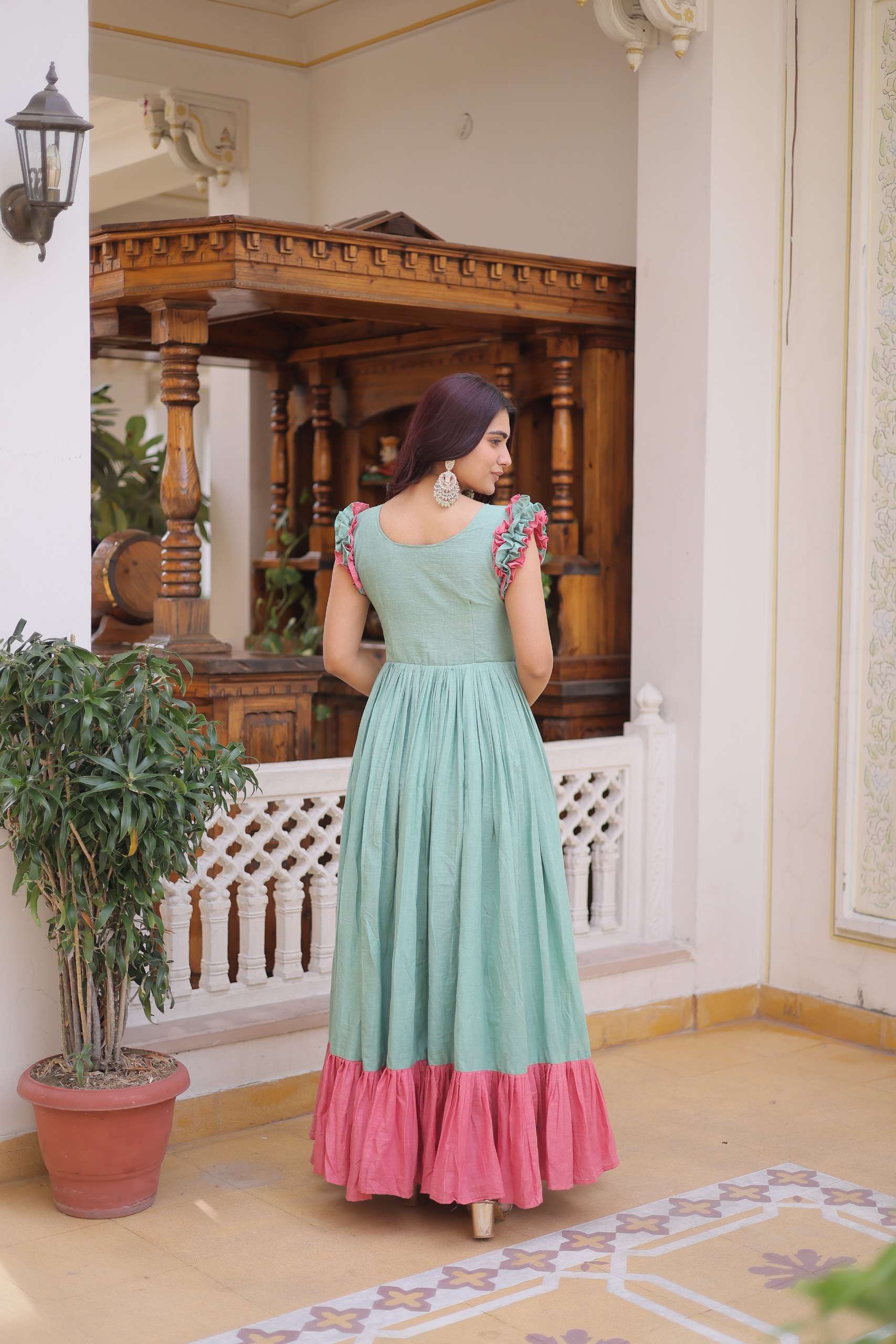👉🏻 *LENGTH :-* 56 INCH 👉🏻 *FLAIR :-* 7 MTR 👉🏻 *LINING :-* Cotton (Full Inner Top To Bottom) 👉🏻 *SLEEVES :-* Sleevesless (Shoulder Double Frill Stitching) 👉🏻 *STITCHING TYPE:-* Frill Stitch 👉🏻 *NECK TYPE :-* Fancy Round Neck