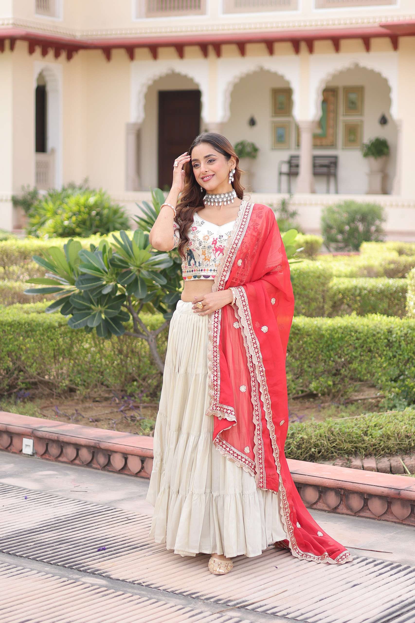 👉🏻 *Lehenga :- (Full-Stitched)* 👇🏻 👉🏻 *Fabrics & Work :-* Cosmos silk with Standard Frill stitching 👉🏻 *Closure :-* Chain Attached & With Dori Latkan 👉🏻 *Flair :-* 12 Mtr 👉🏻 *Inner:-* Cotton 👉🏻 *Waist :-* 42'' 👉🏻 *Length :-* 42''
