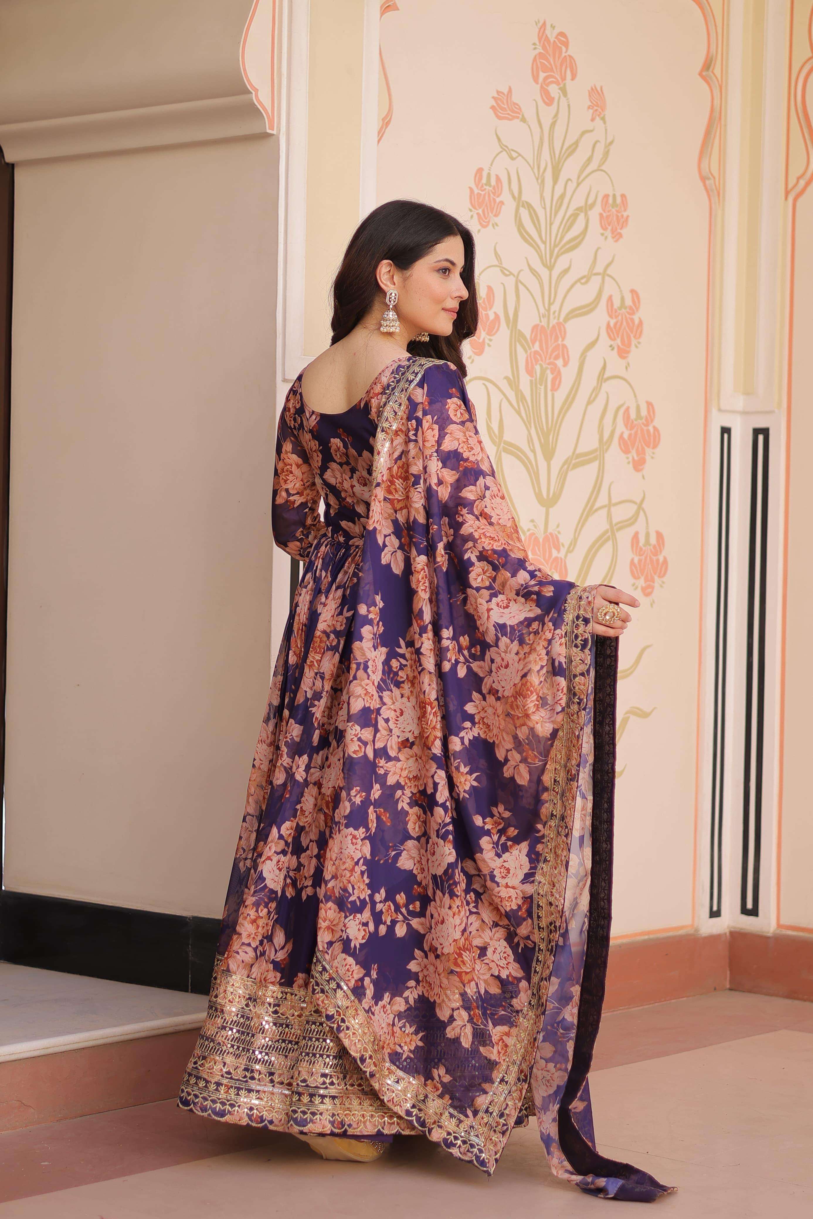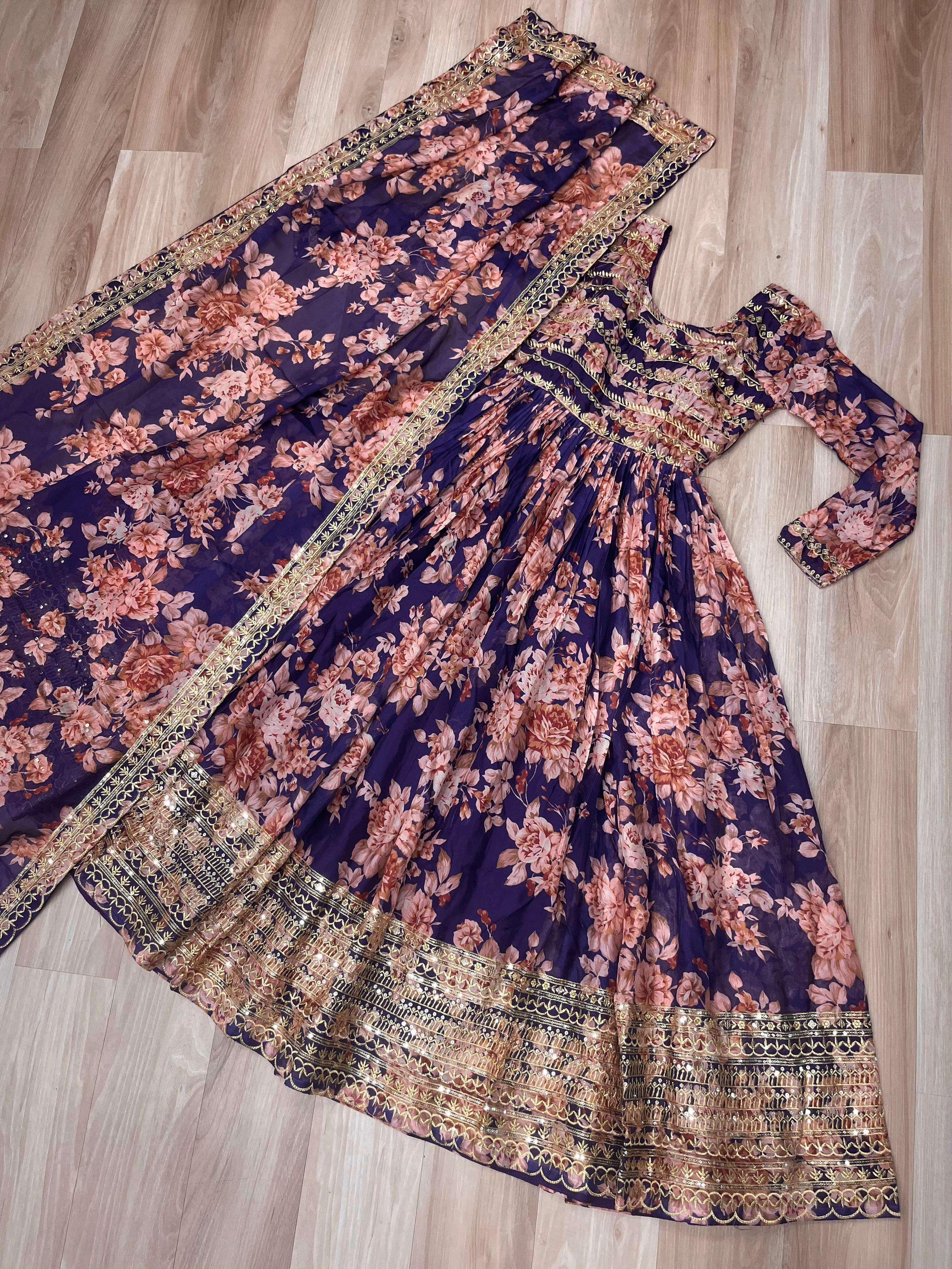 👉🏻 Gown:-👇🏻 Fabrics & Work :- Russian Silk Rich Digital Print With Embroidered Sequins Work Size :- M(38"), L(40"), XL(42"), XXL(44") Sleeves :- Full sleeves Length :- 56 Inch Flair :- 3 Meter Lining(Inner) :- Cotton (full upto bottom) Stiching Type:- Stitch With Canvas Patta Neck Type :- Round Neck