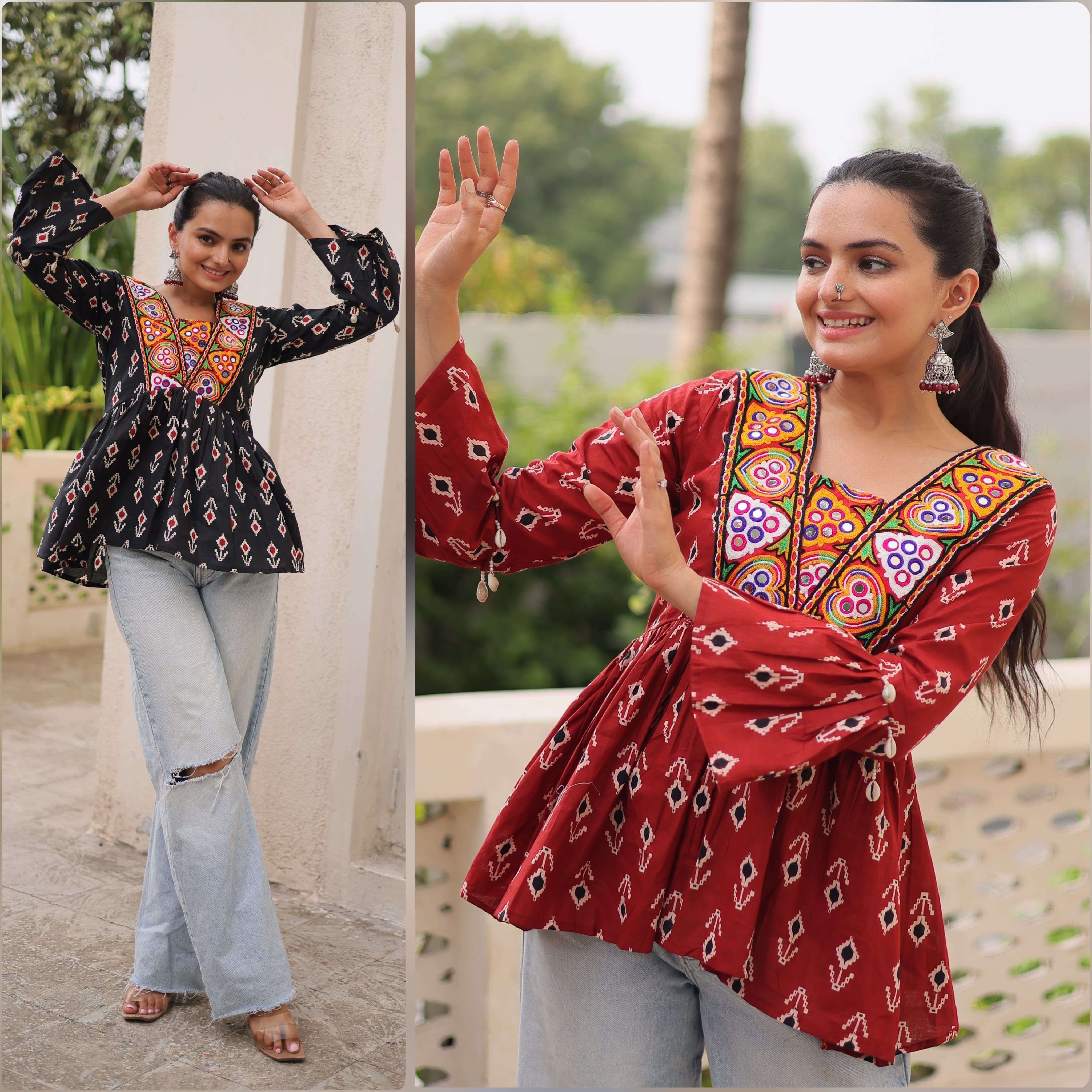 👉🏻 *FABRICS & WORK* :- Cotton Print with kutchi Patch-work 👉🏻 *SIZE* :- L Size (40 Inch Stitched) {User can adjust From 38" to 44" for your body comfort)} 👉🏻 *LENGTH* :- 24 Inch 👉🏻 *NECK* :- Patterned As Model 👉🏻 *LINING (INNER)* :- Cotton 👉🏻 *CLOSURE* :- Back side Dori Attached 👉🏻 *SLEEVES* :- Full Sleeves