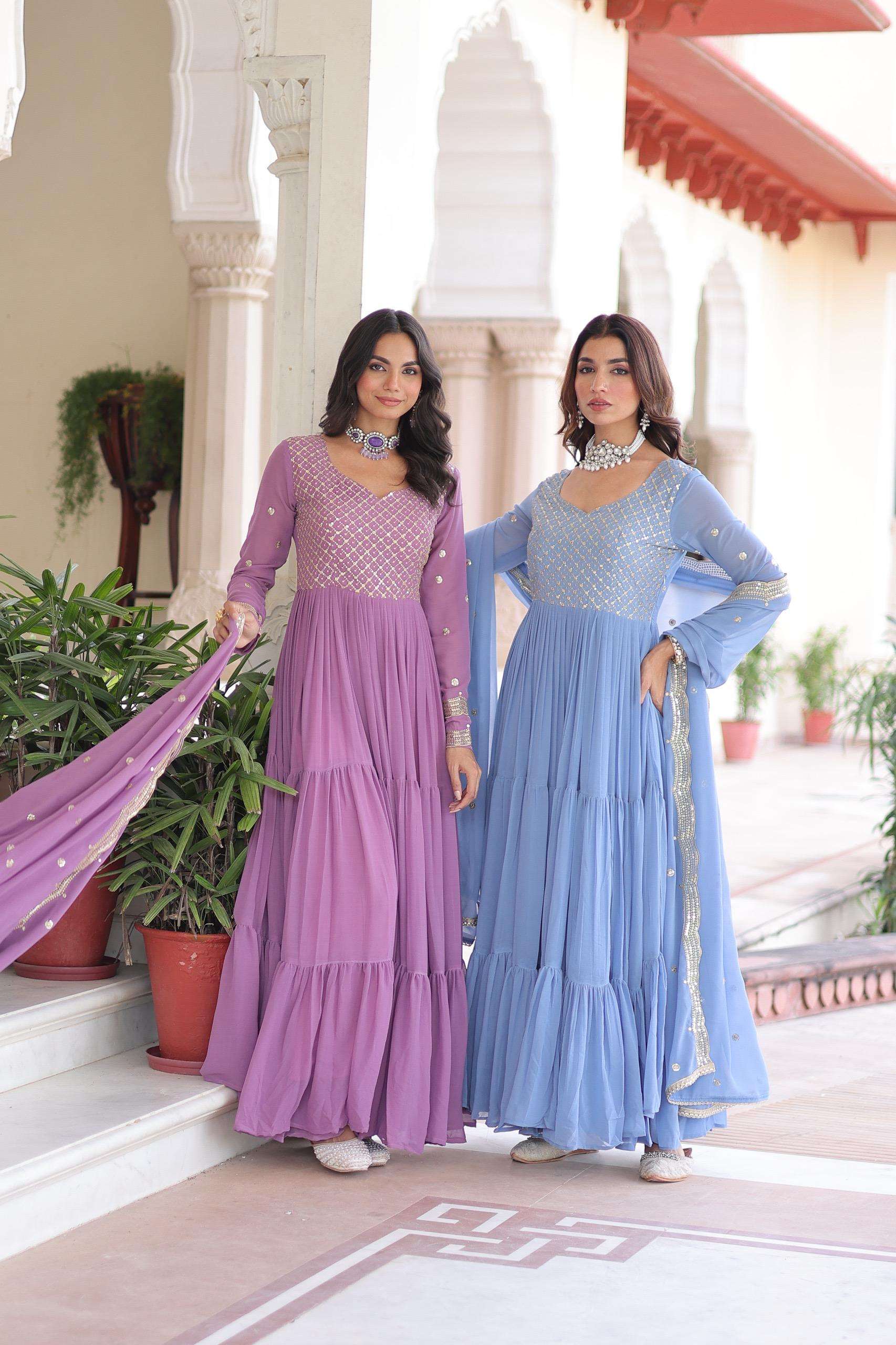 💗 Faux Georgette gown with With Sequins Zari Embroidered Cut Work Dupatta, it will enhance can combine the best parts of western and Indian wear into one stunning ensemble. 💝