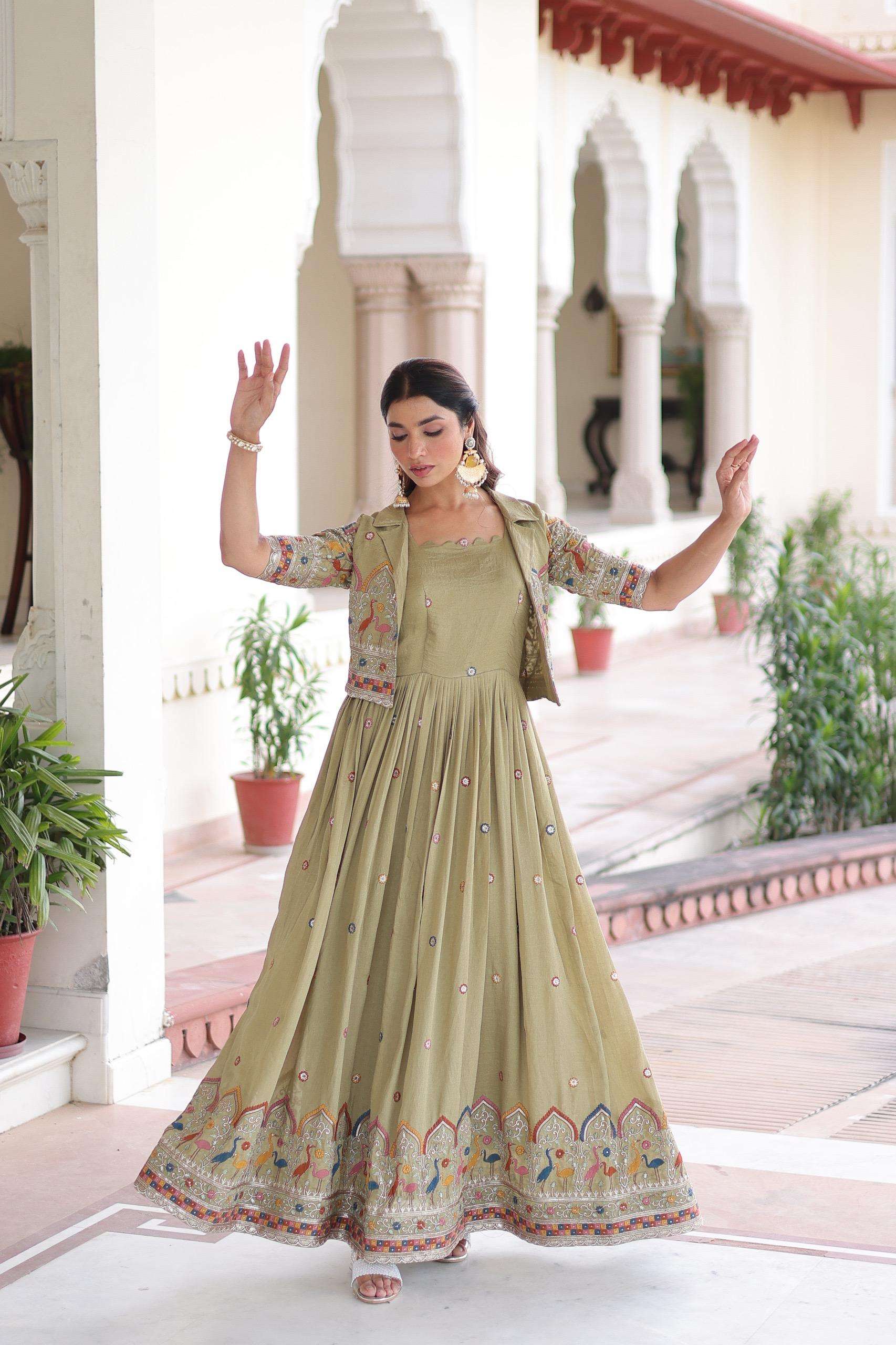 👉🏻 *GOWN* :-👇🏻 *FABRIC & WORK* :- Vichitra Silk With Sequins, Zari & Thread Embroidered work *SIZE* :- M(38''), L(40''), XL(42''), XXL(44'') *LENGTH* :- 56 INCH *FLAIR* :- 3 MTR *LINING* :- Cotton (Full Inner Top To Bottom) *SLEEVES TYPE* :- Sleevesless *NECK TYPE* :- Designer Round Neck As image *STITCHING TYPE* :- Standard Stitch with canvas patta